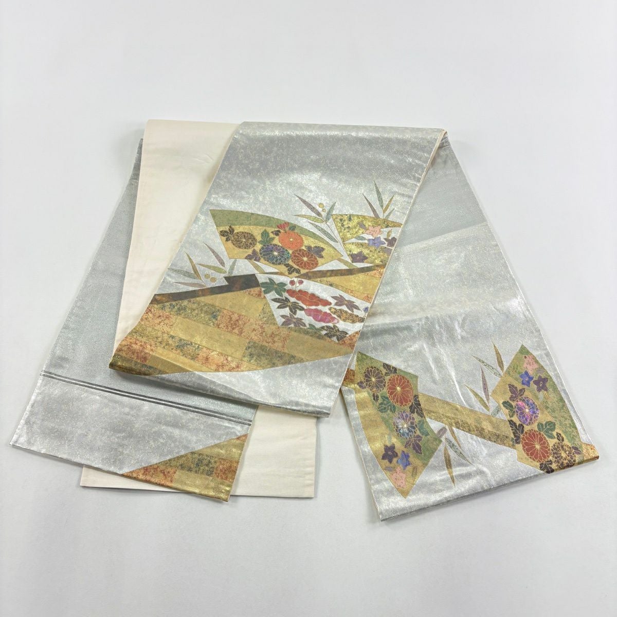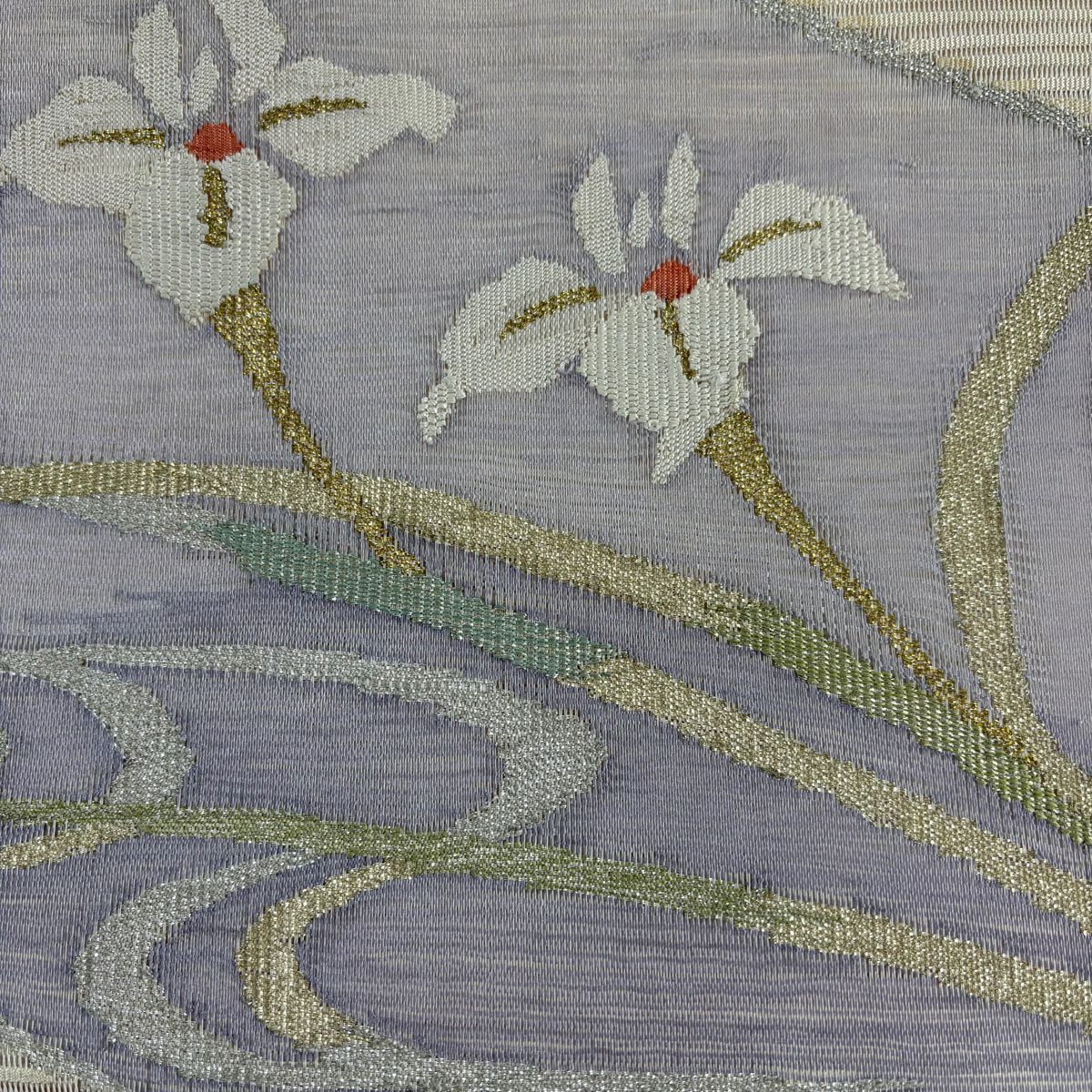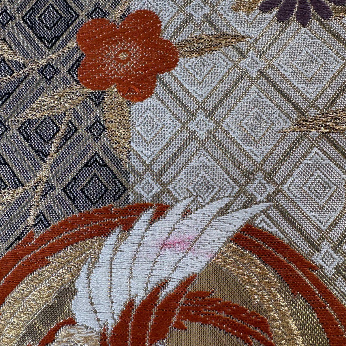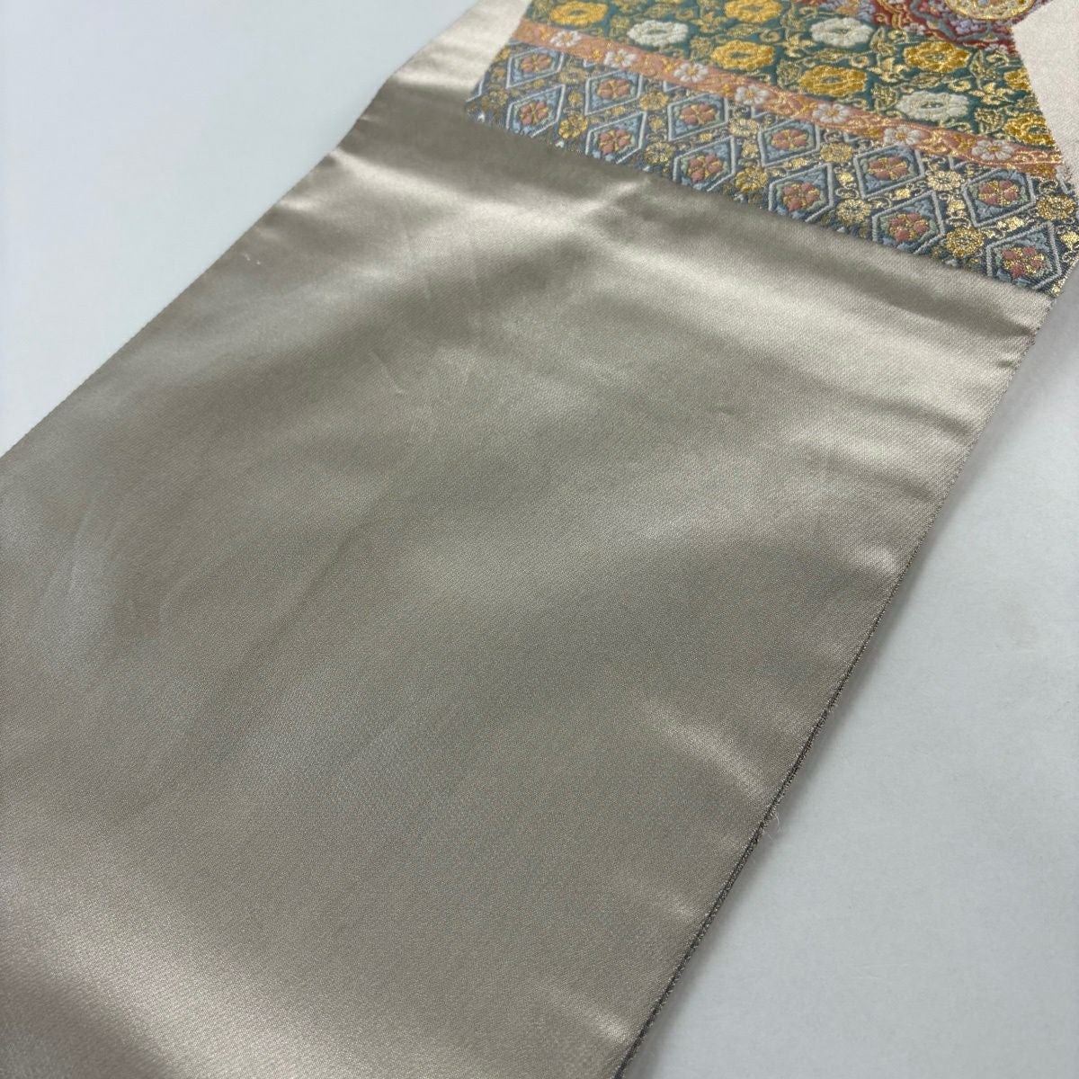 袋帯 秀品 関西仕立て 松皮菱 秋草 金糸 箔 灰色 六通 正絹