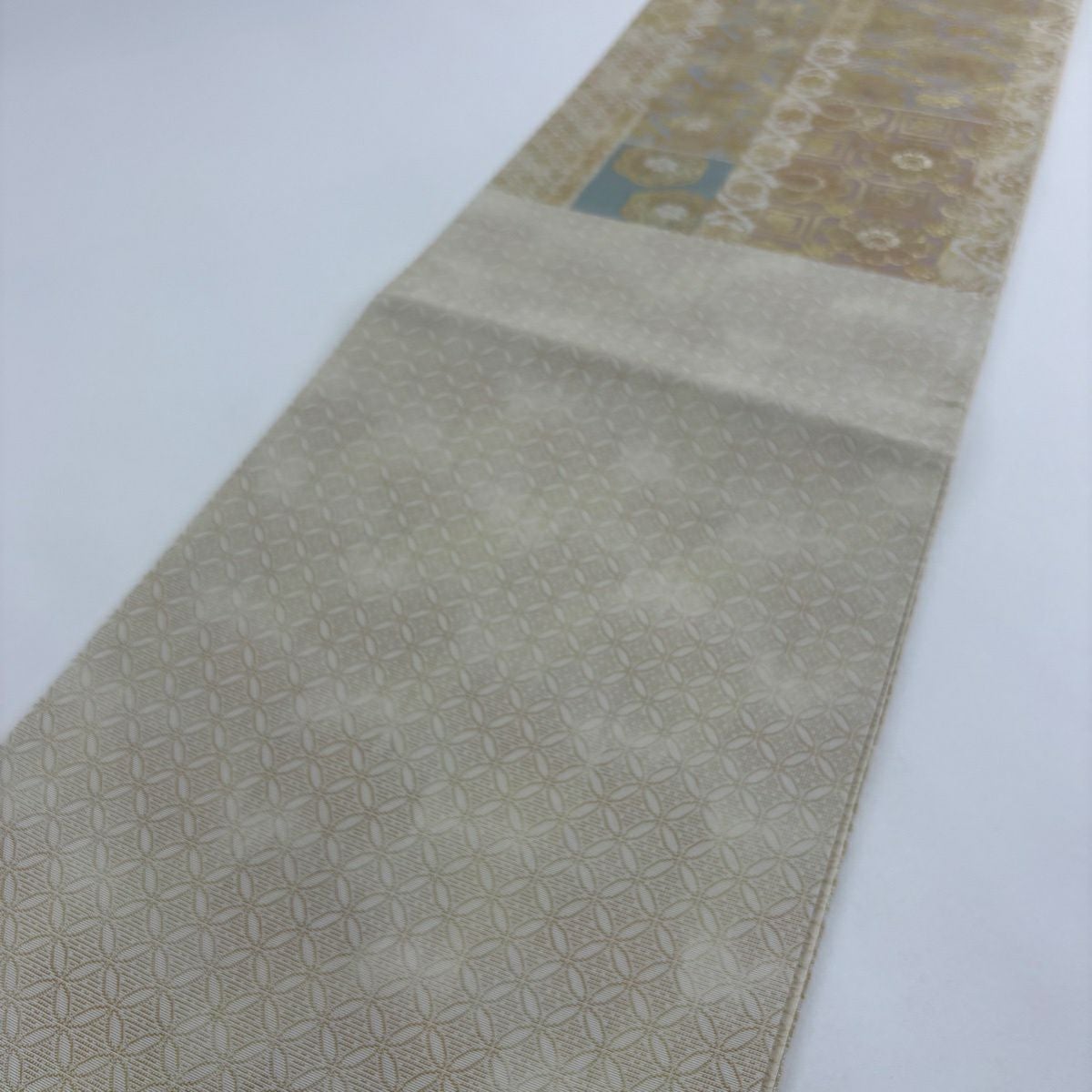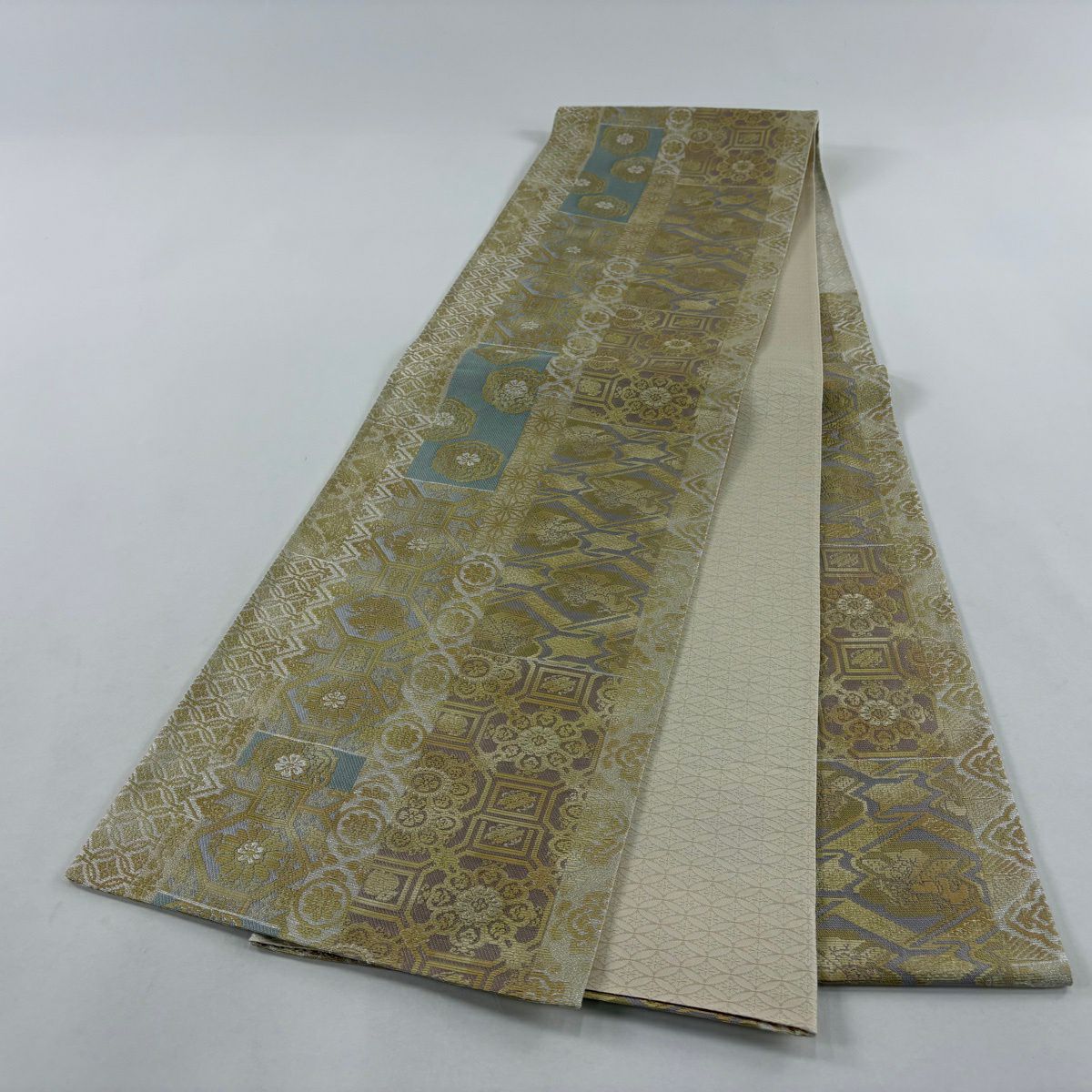 【美品】 袋帯 秀品 華文 麻の葉 箔 ベージュ 六通 正絹