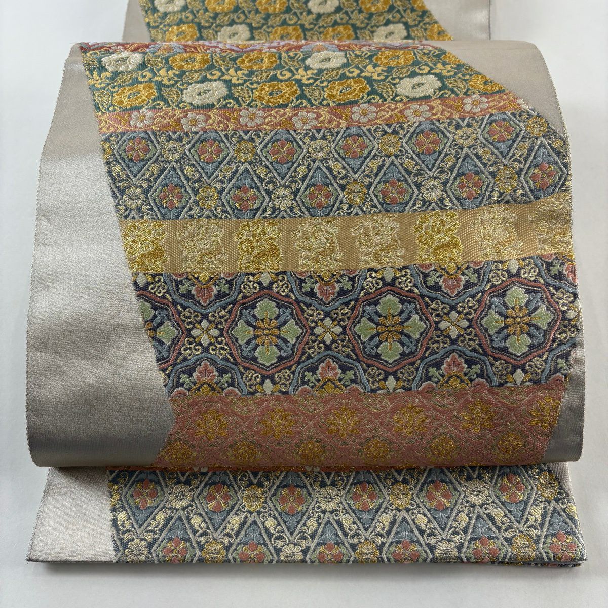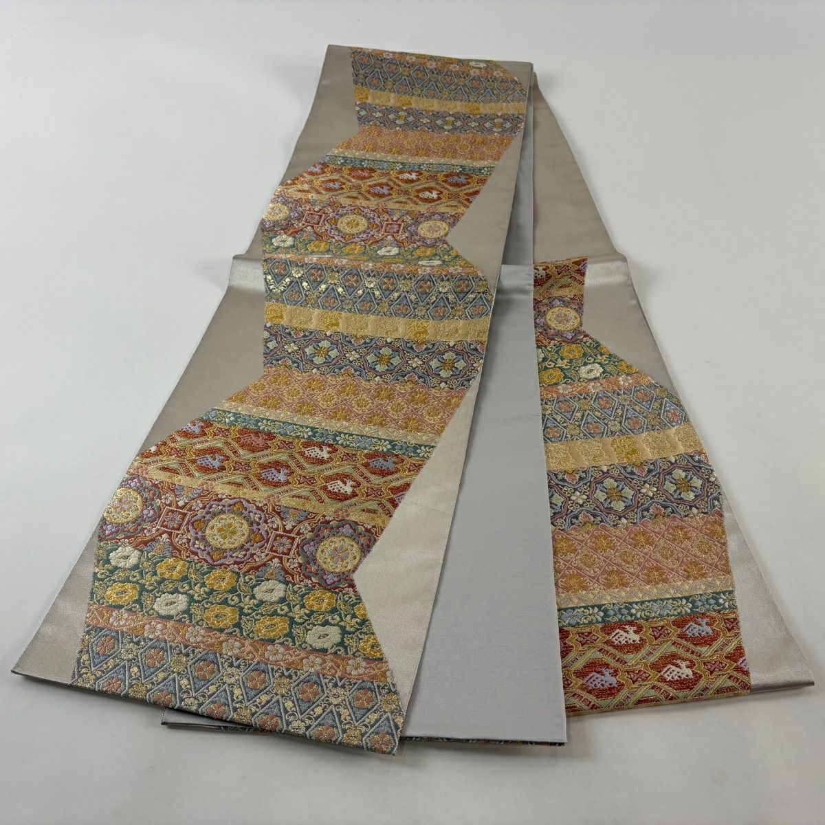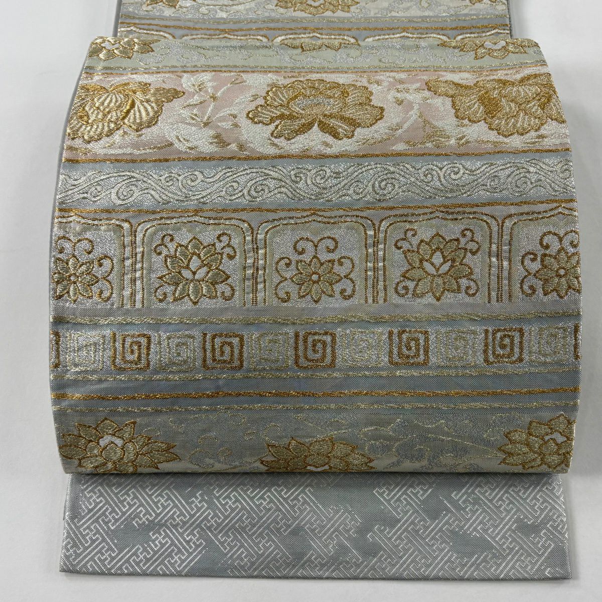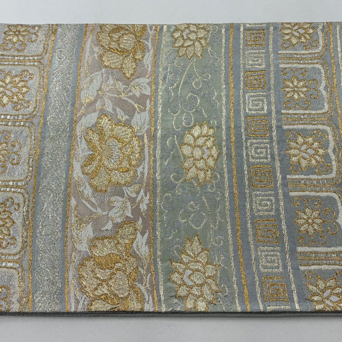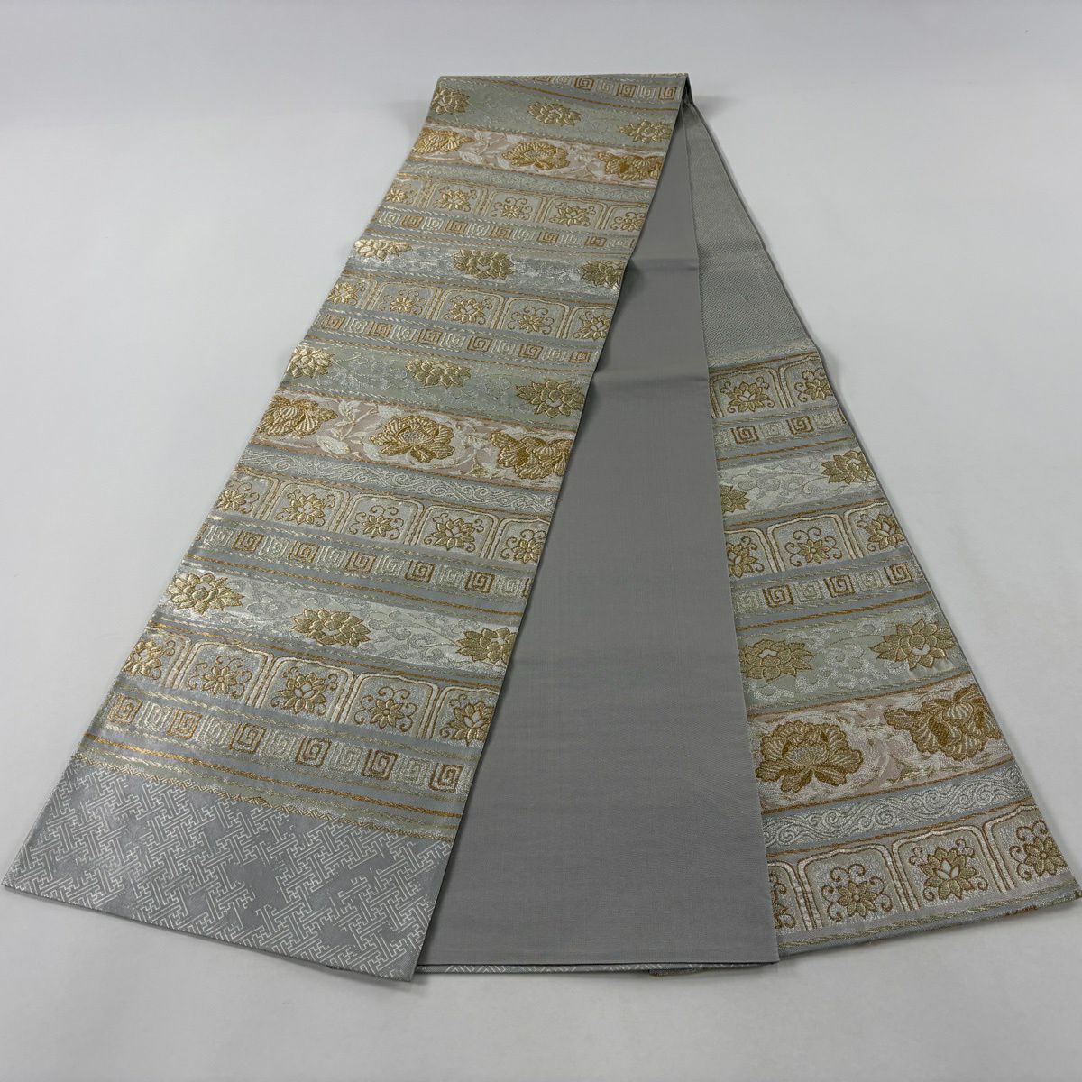 【美品】 袋帯 秀品 花唐草 段縞 金銀糸 箔 灰色 六通 正絹