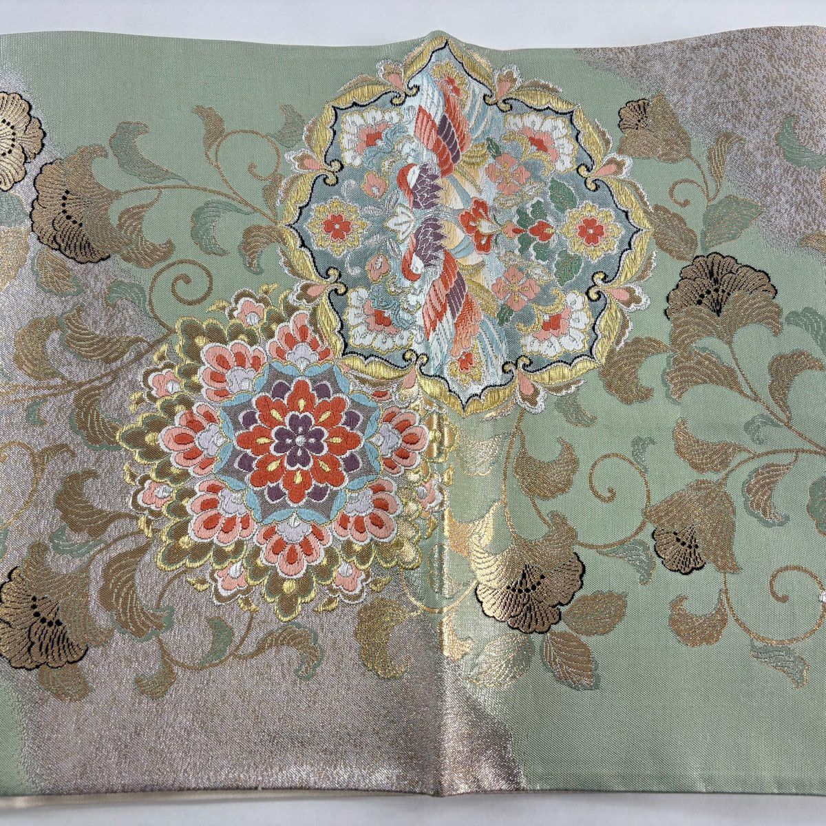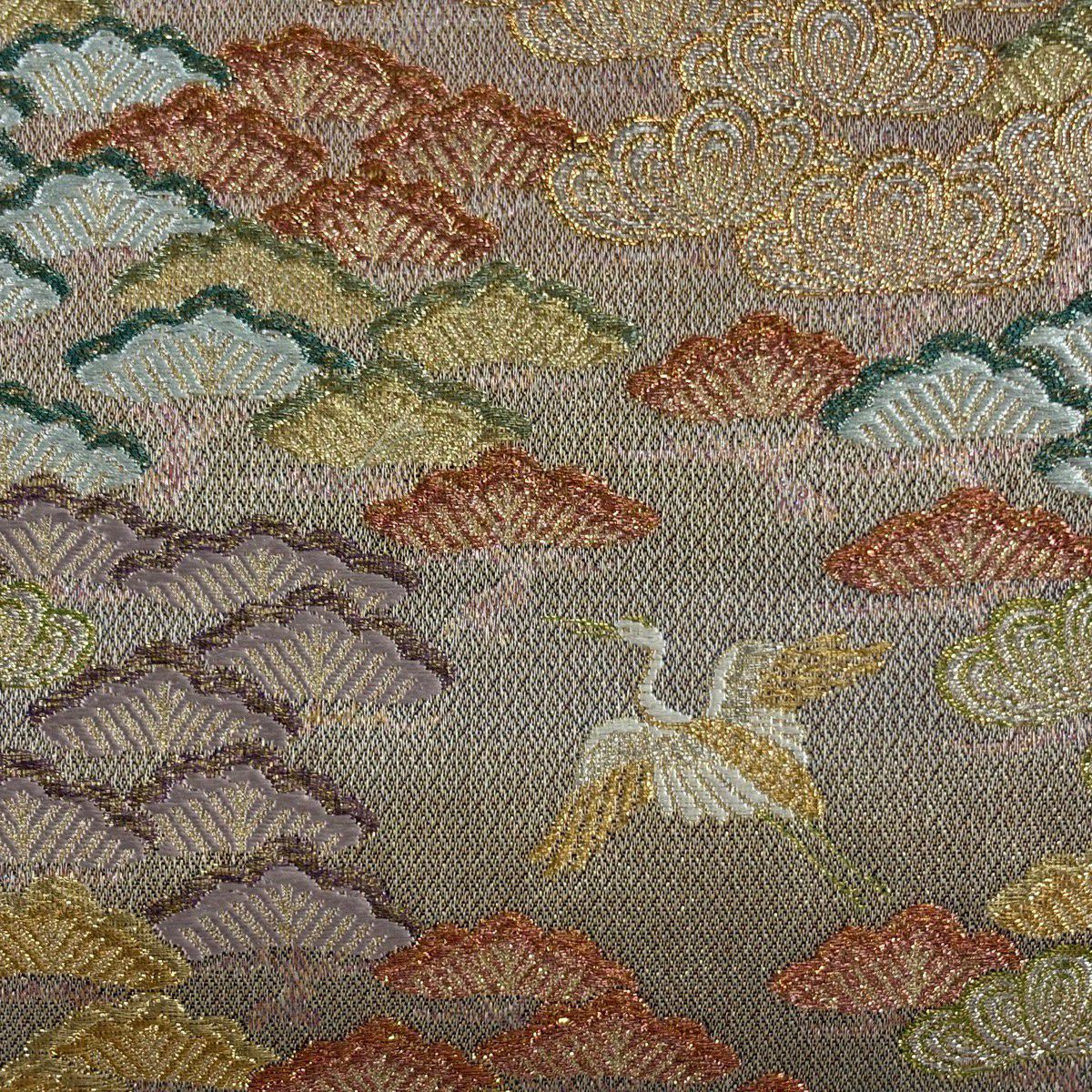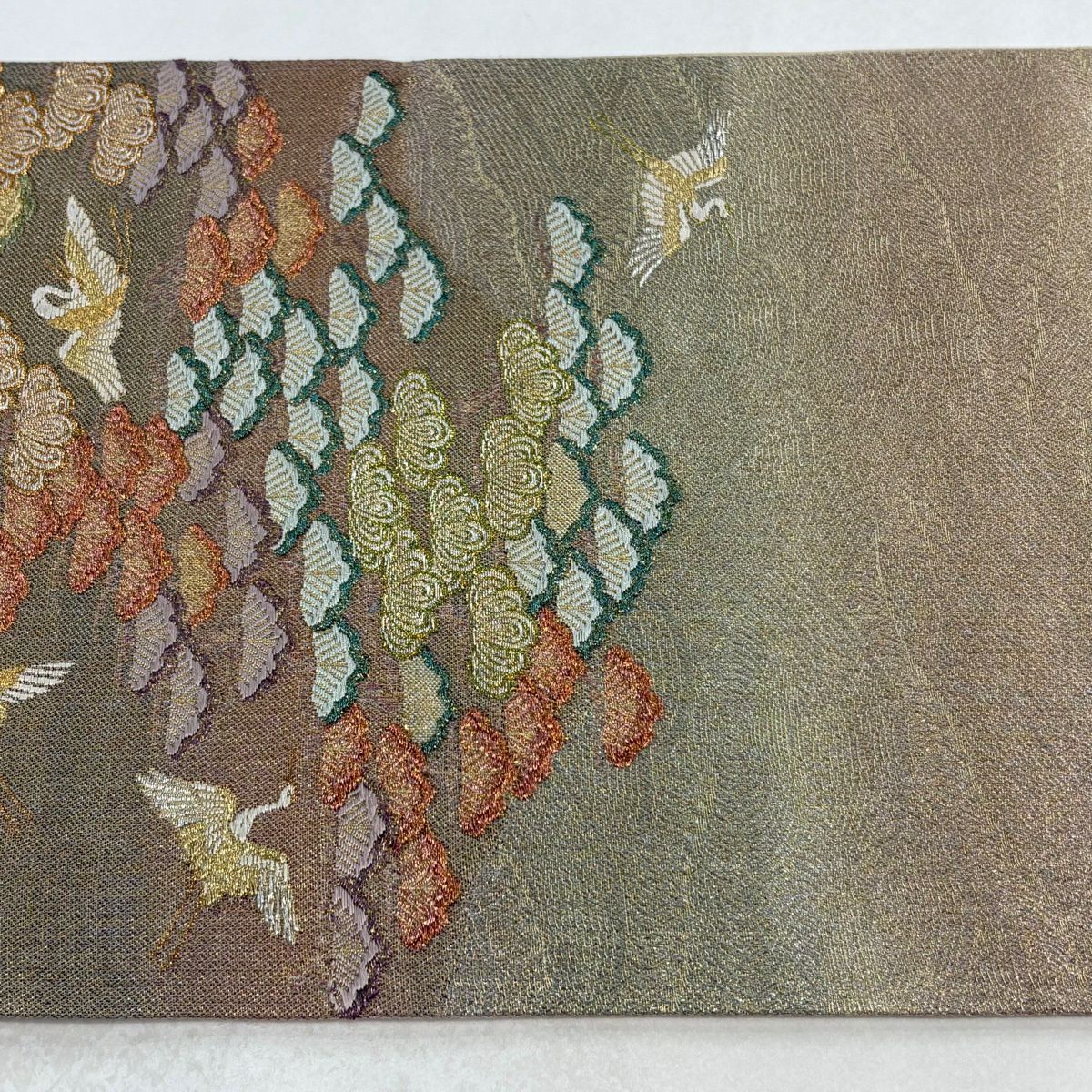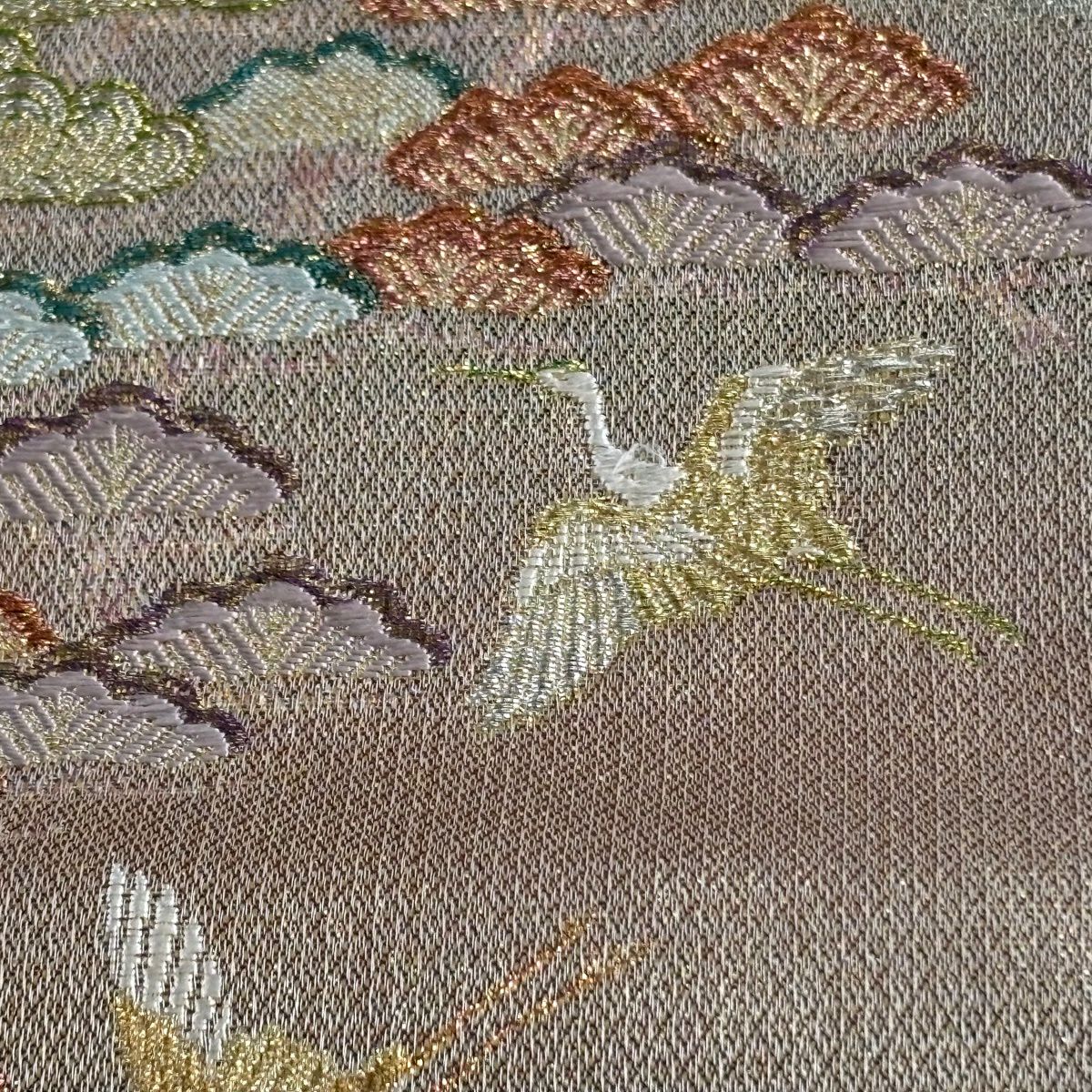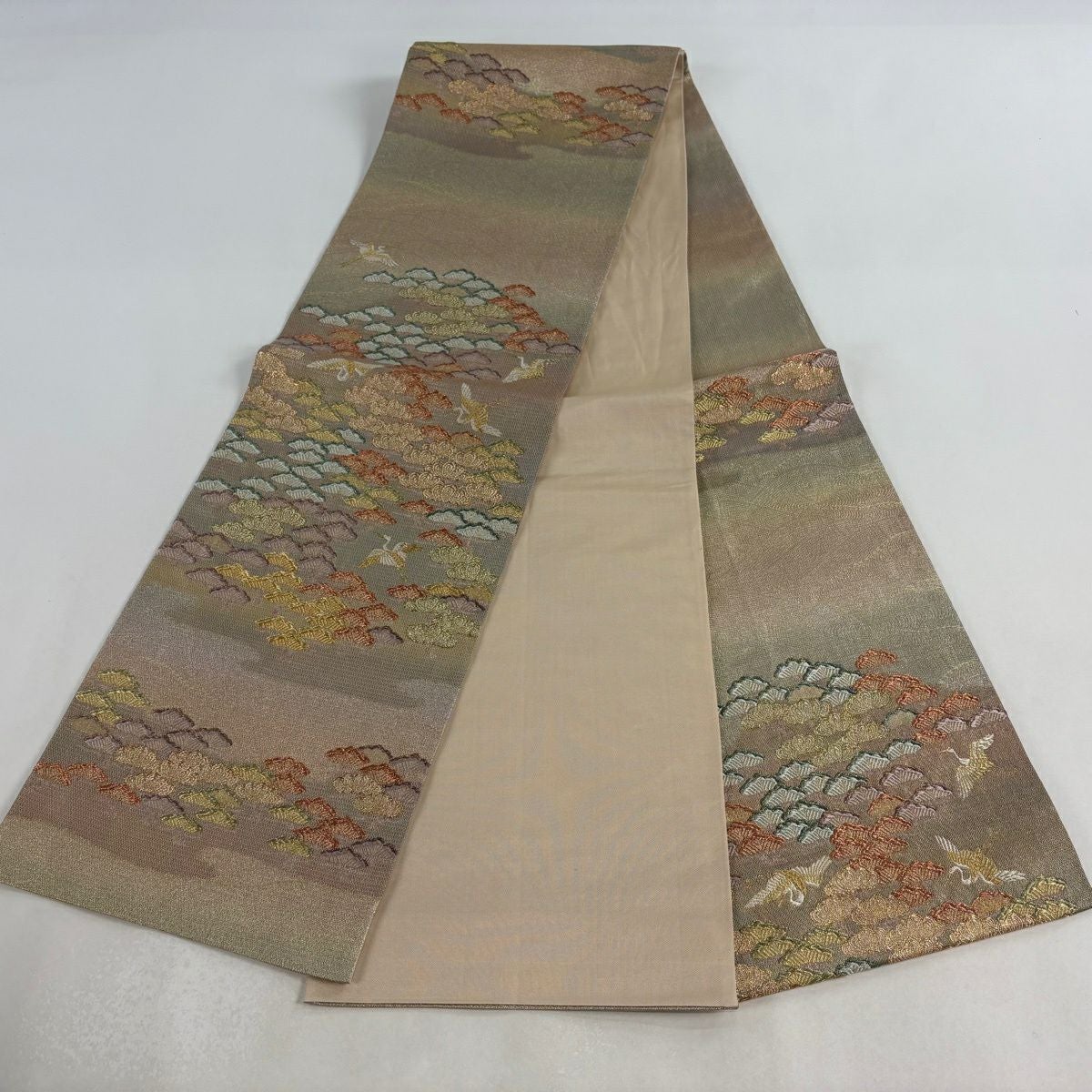 【美品】 袋帯 秀品 鶴 笠松 金銀糸 唐織 薄茶色 六通 正絹