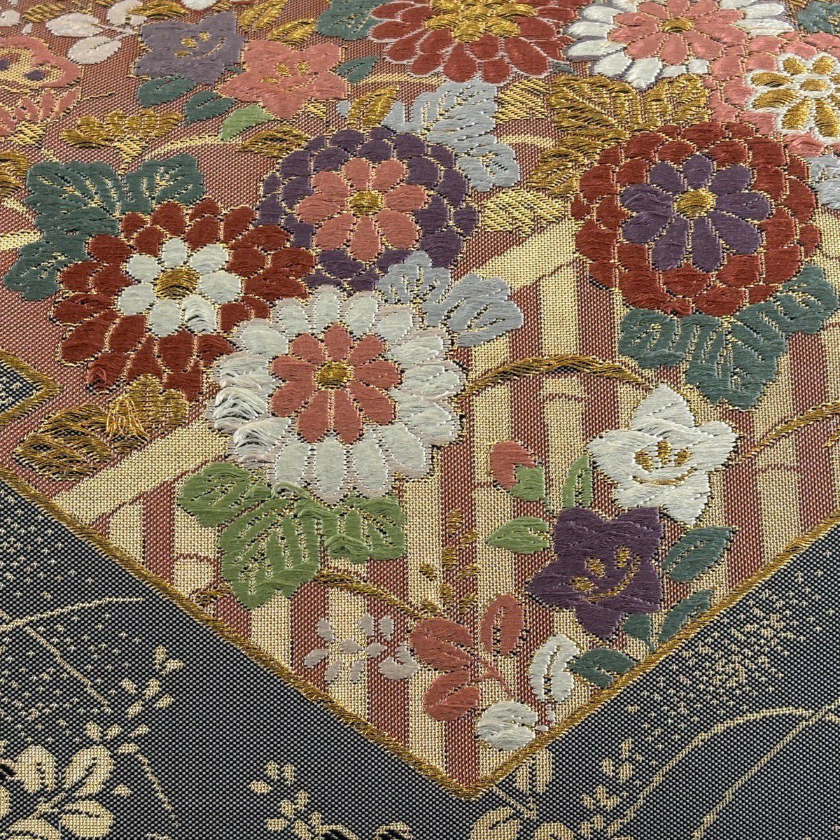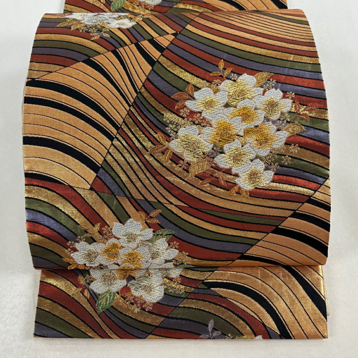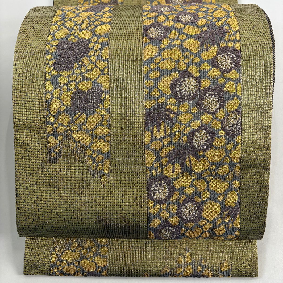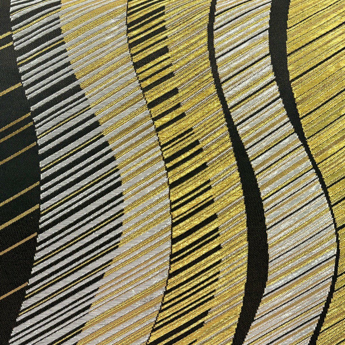 【美品】 袋帯 秀品 草花 よろけ縞 唐織 箔 金色 六通 正絹