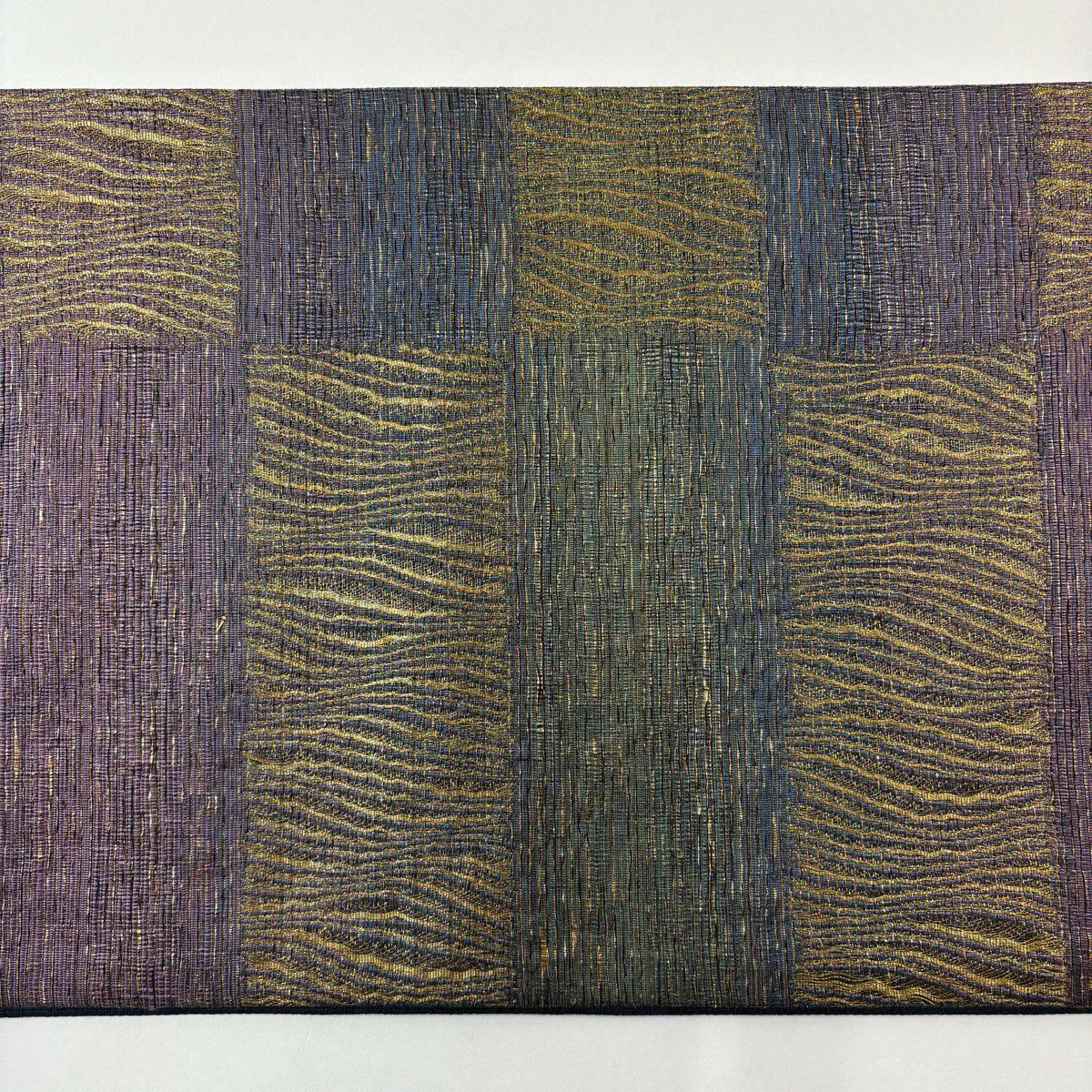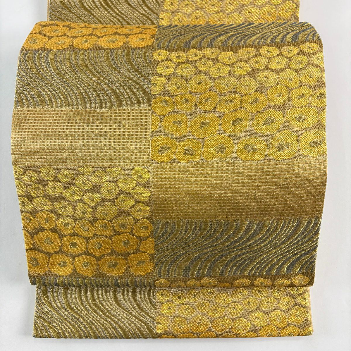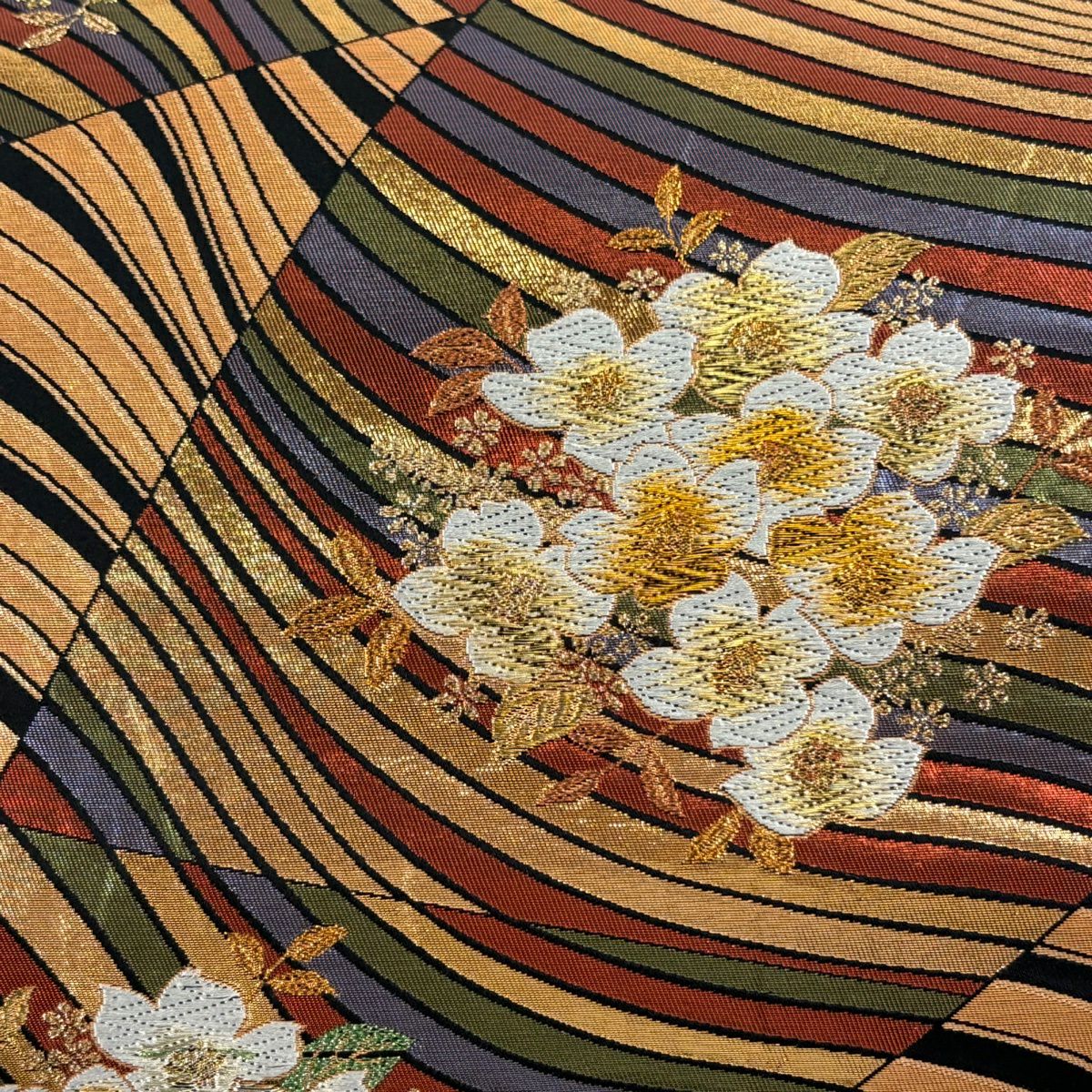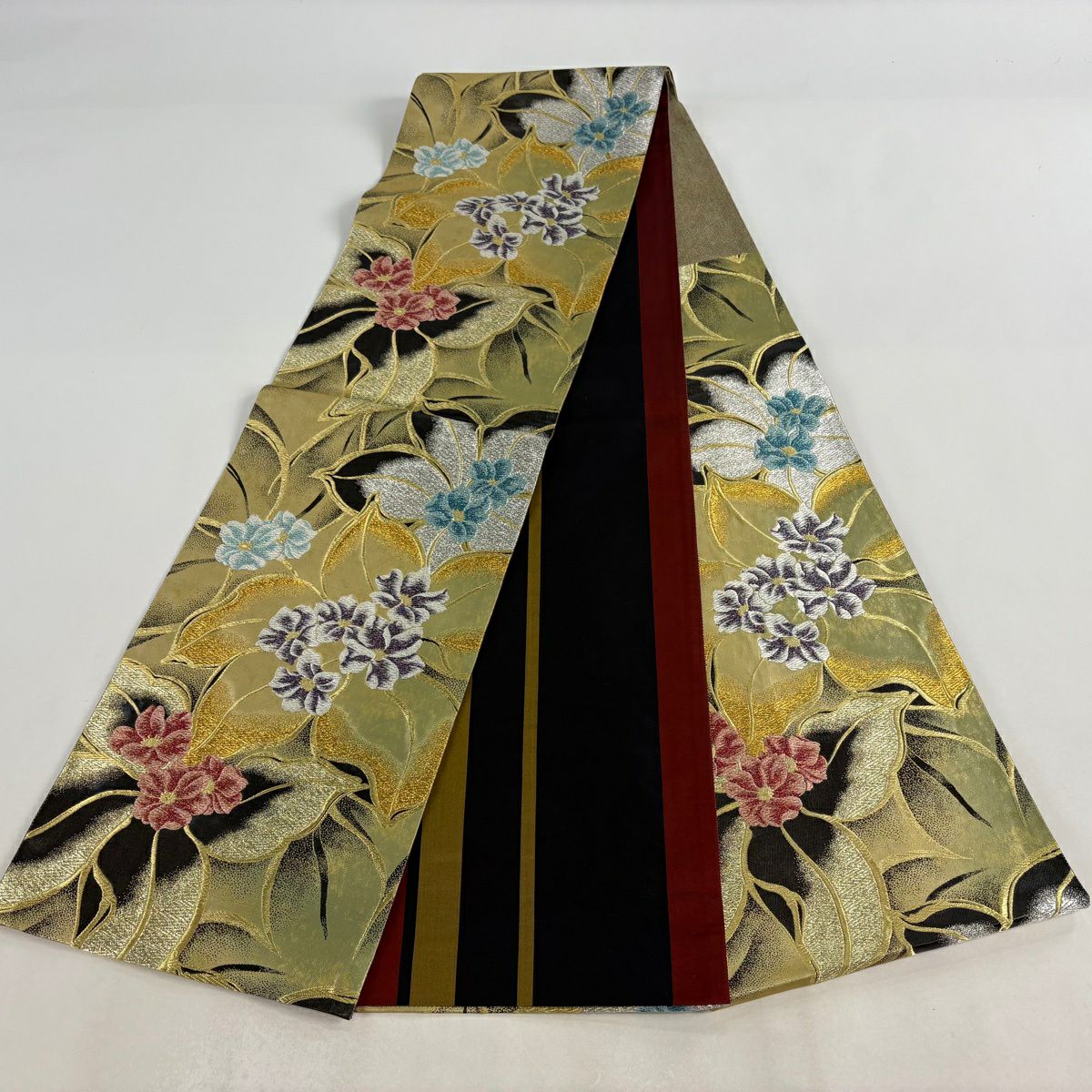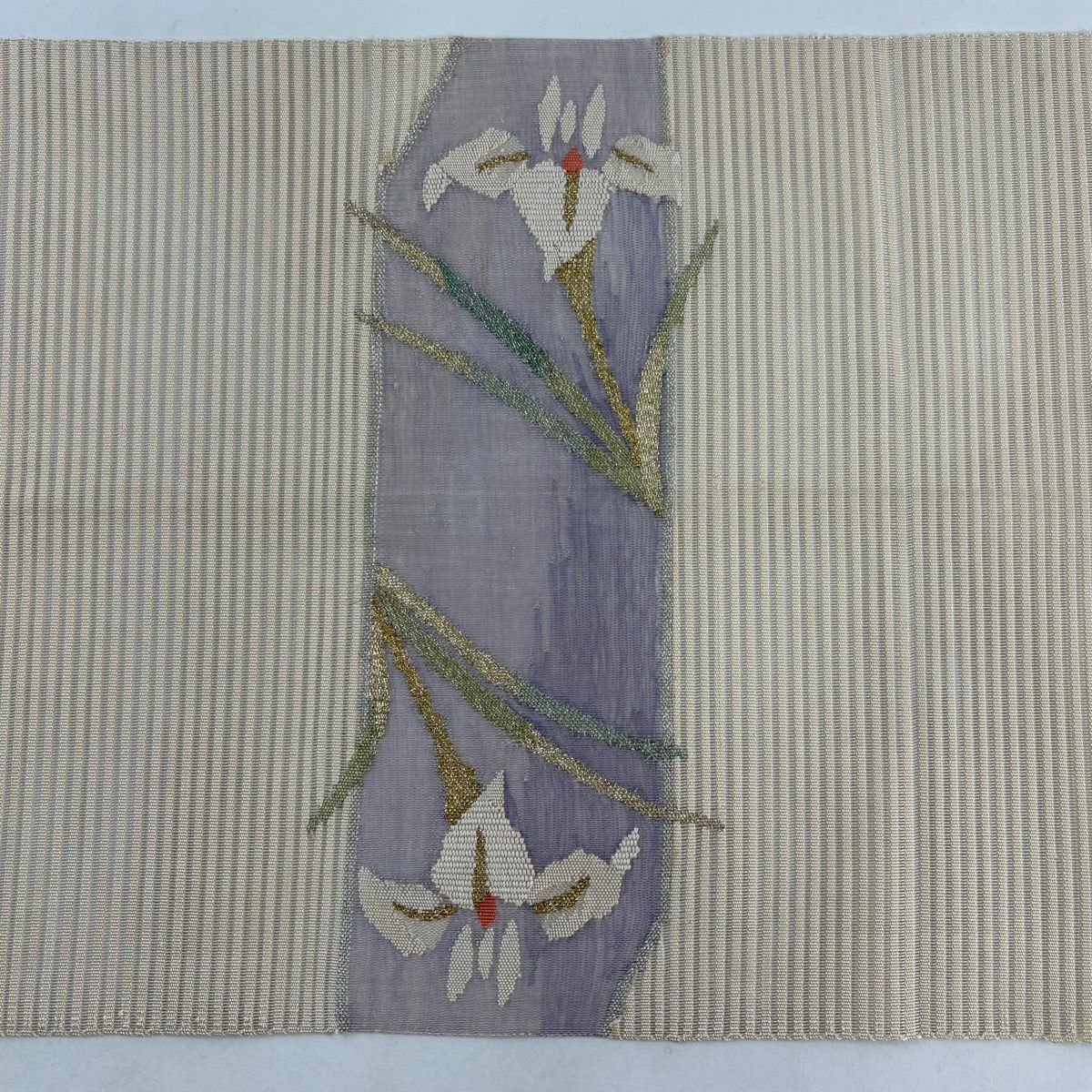 【美品】 袋帯 秀品 草花 よろけ縞 唐織 箔 金色 六通 正絹