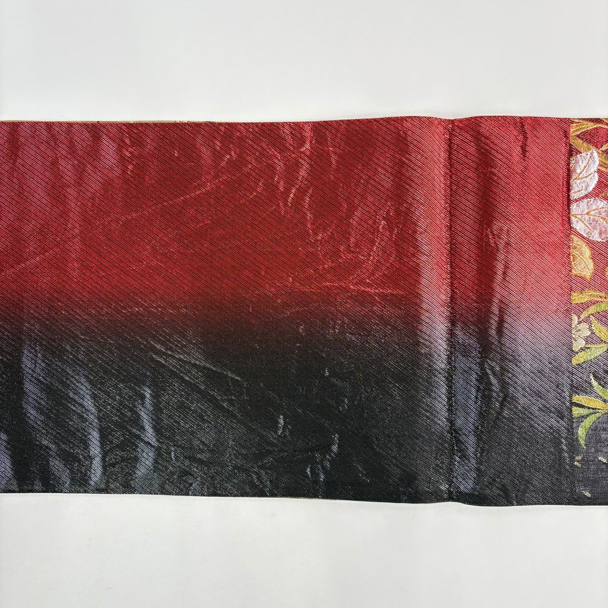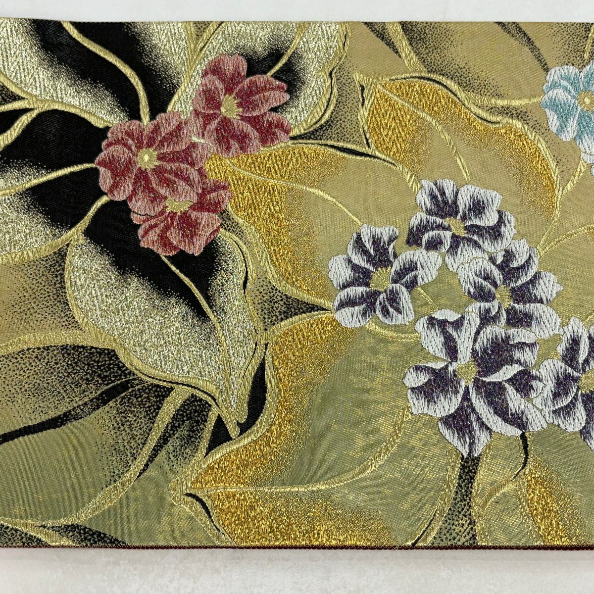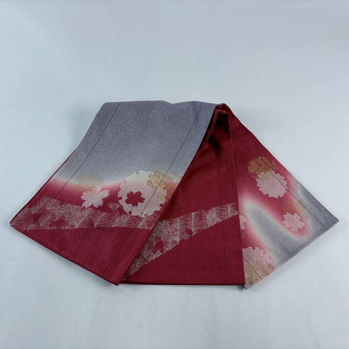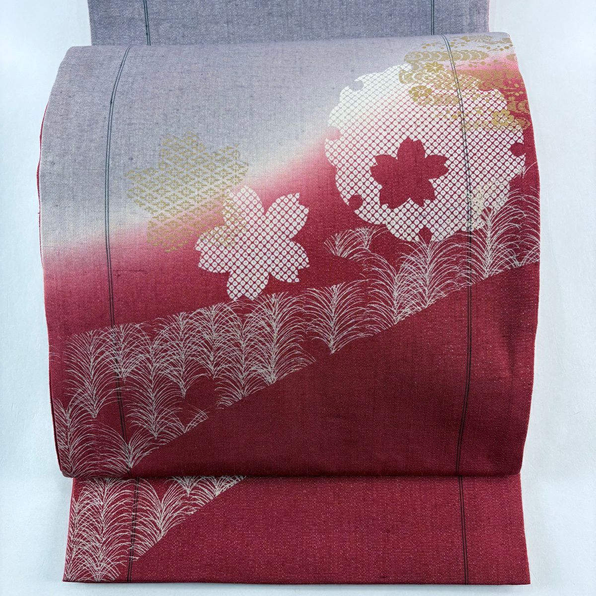 【美品】 袋帯 秀品 草花 桜 箔 ぼかし えんじ色 六通 正絹