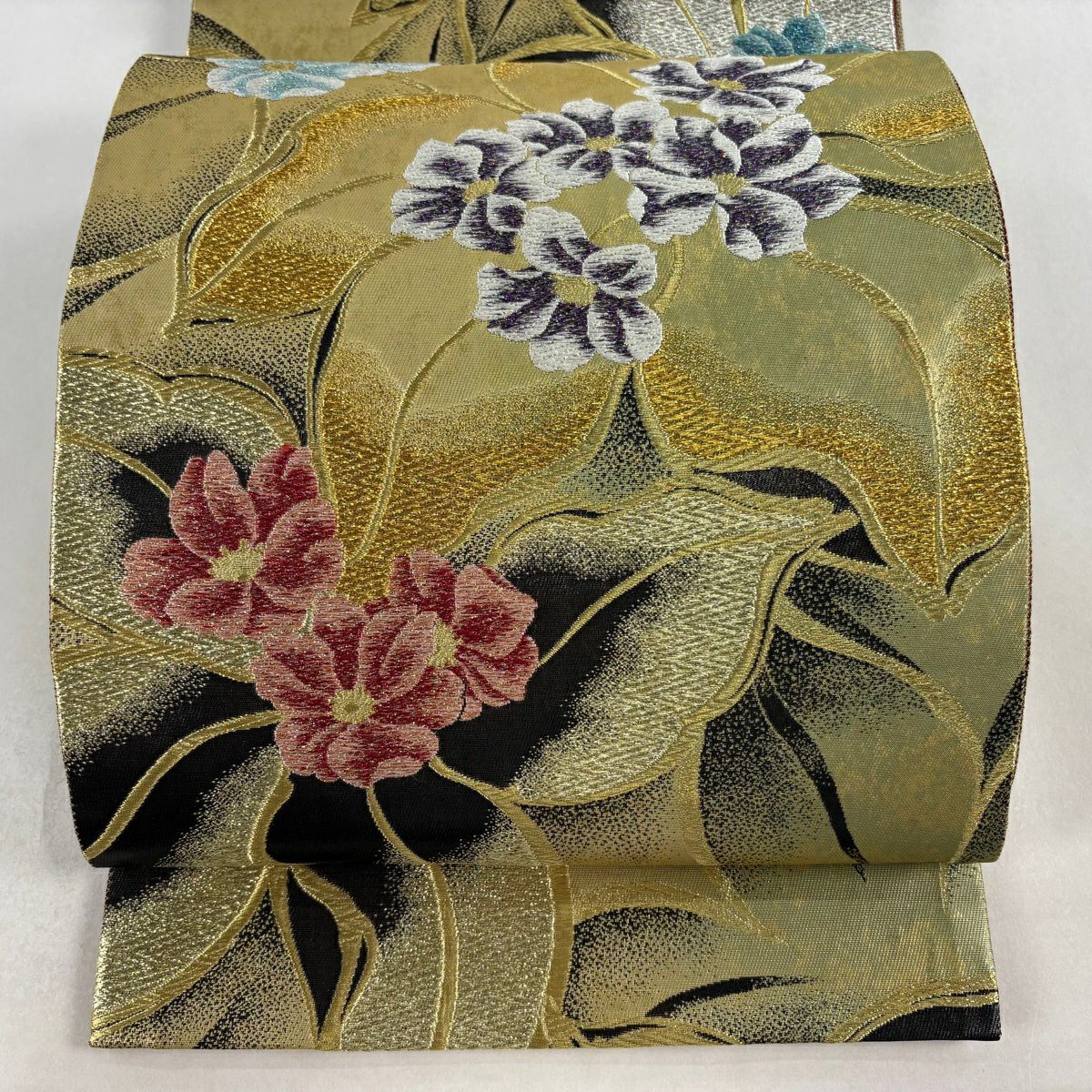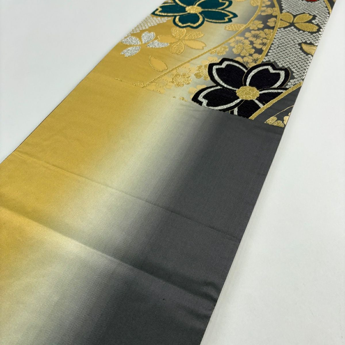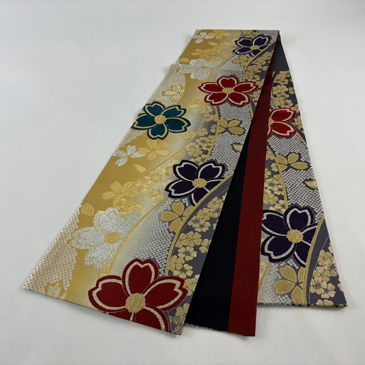 【美品】 袋帯 秀品 草花 桜 箔 ぼかし えんじ色 六通 正絹