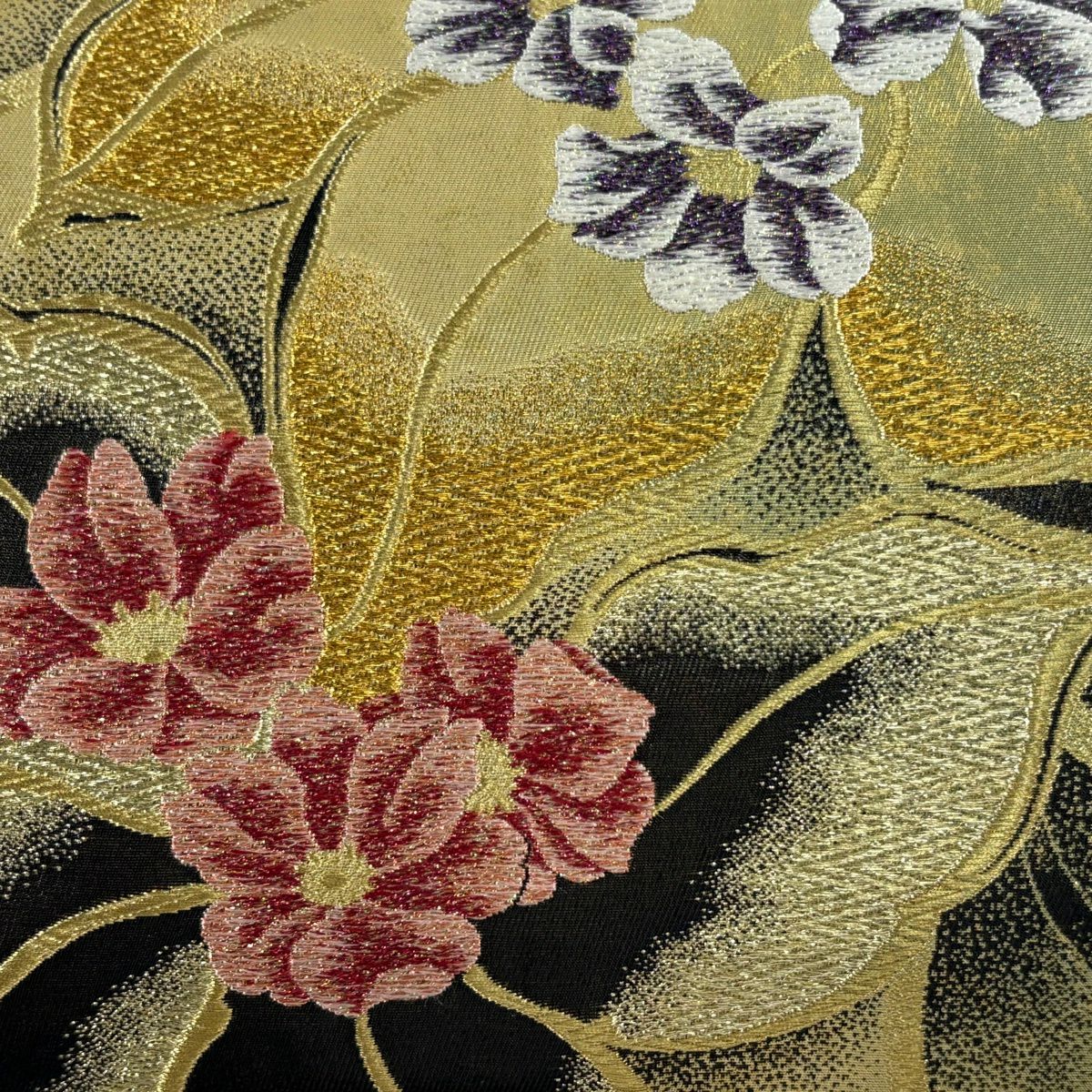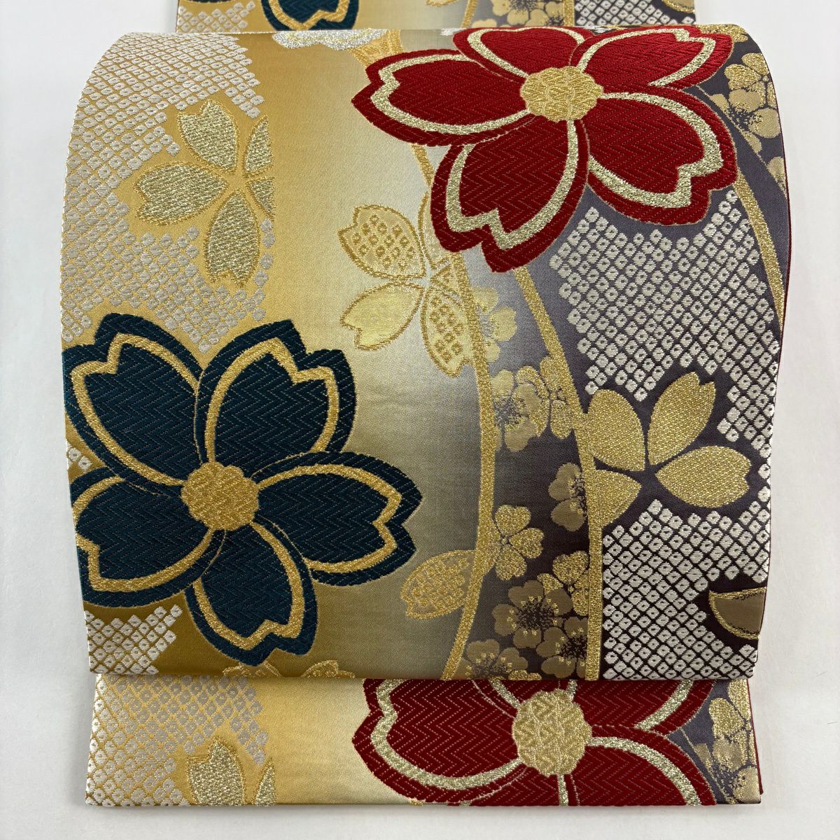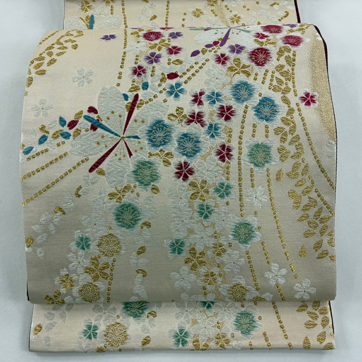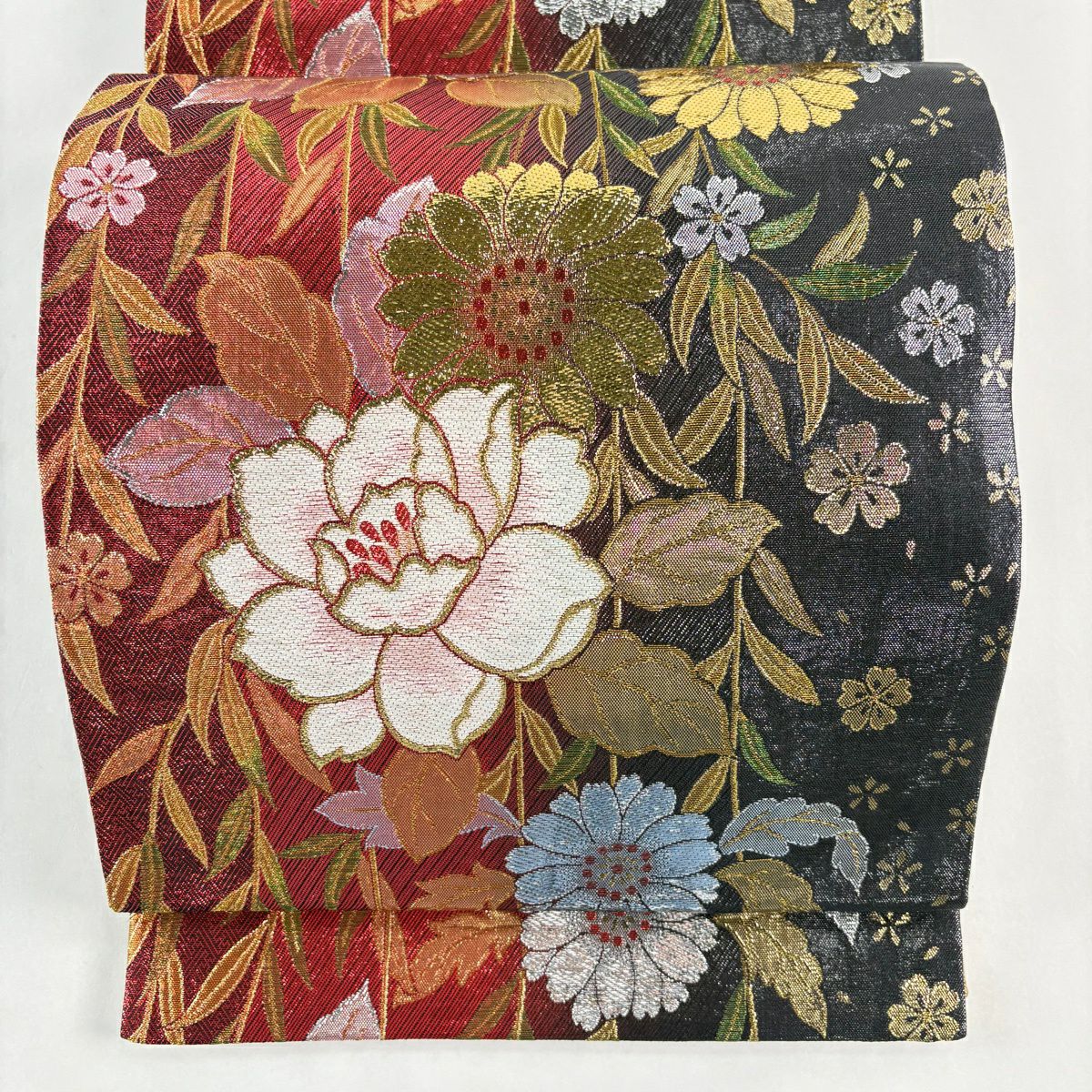 【美品】 袋帯 秀品 草花 桜 箔 ぼかし えんじ色 六通 正絹