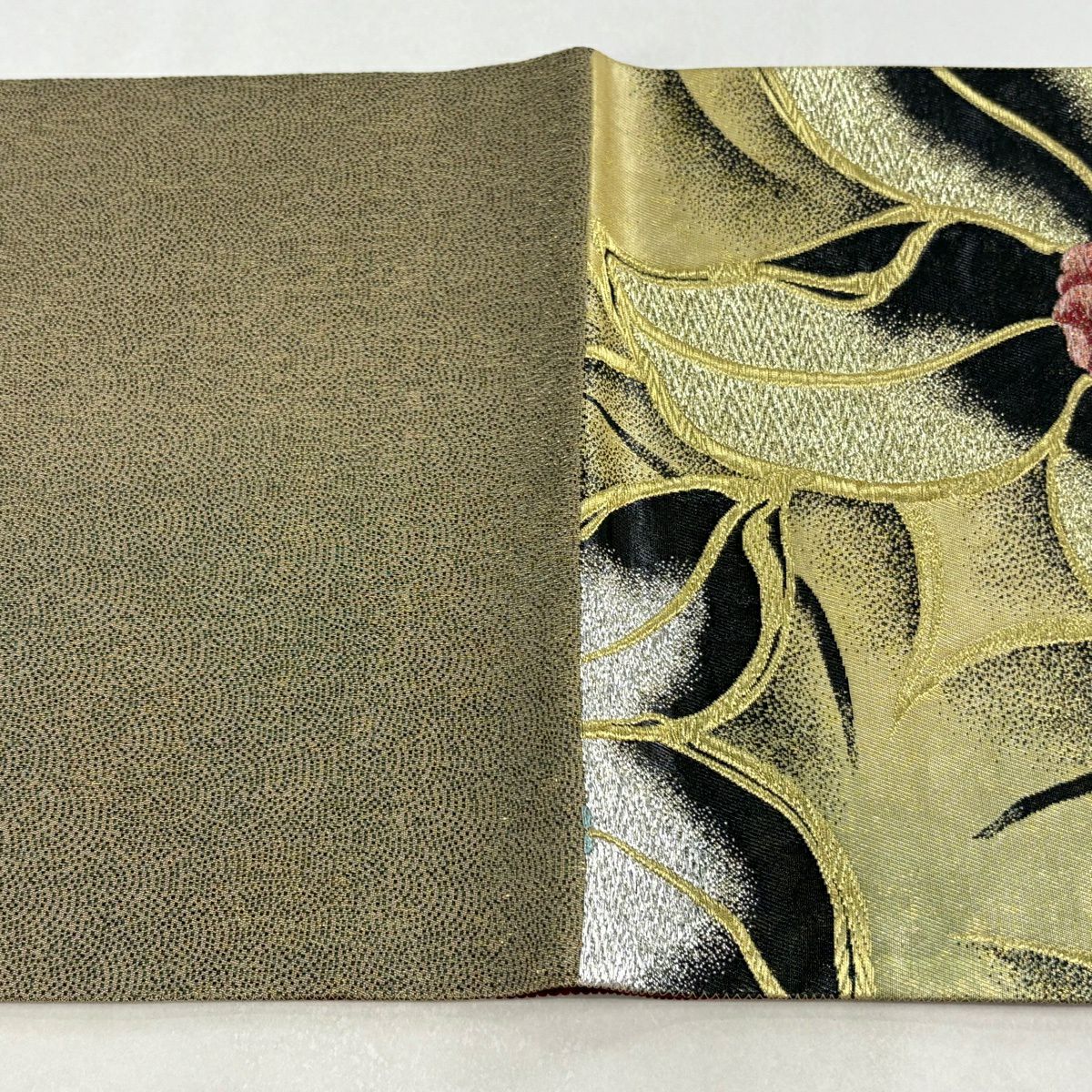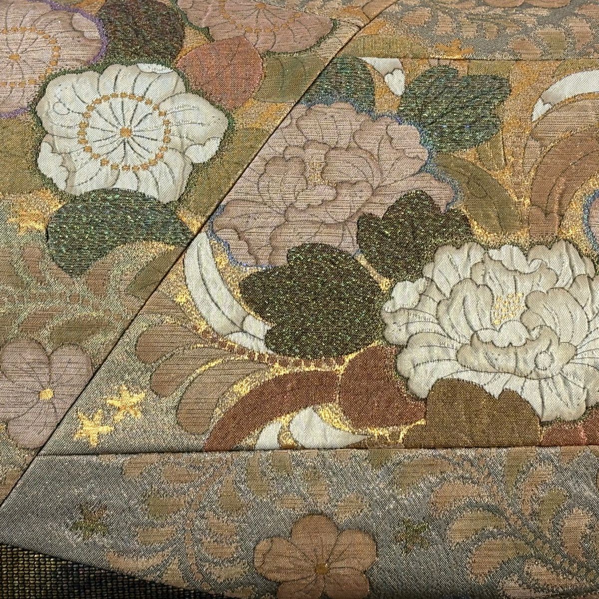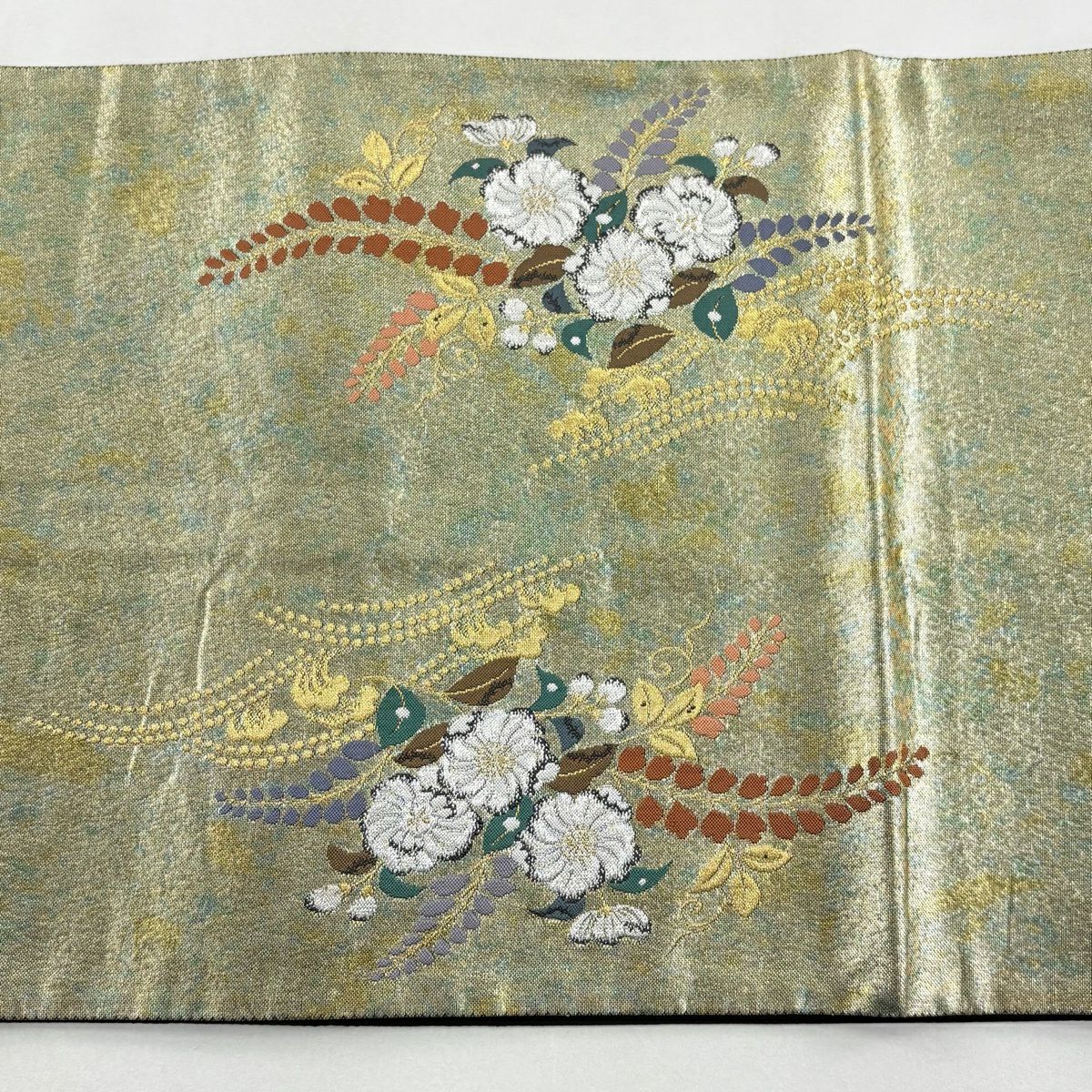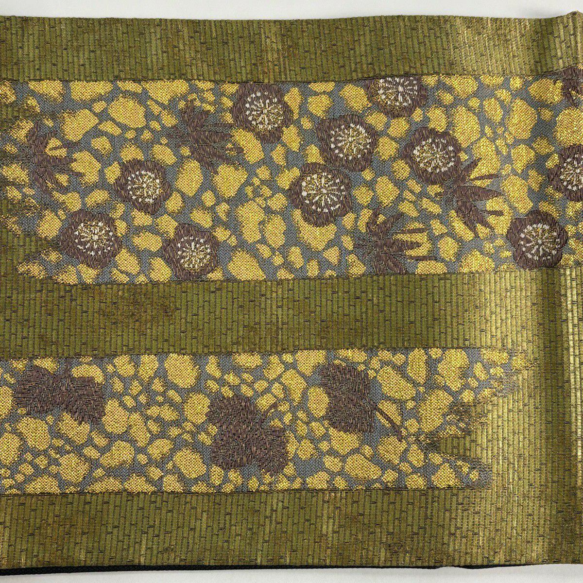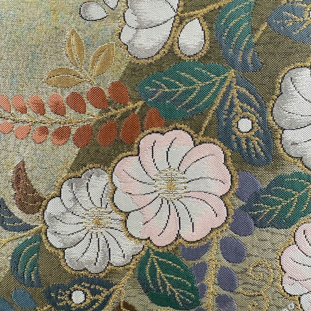 【美品】 袋帯 秀品 若松 花びら 金糸 箔 茶緑色 六通 正絹