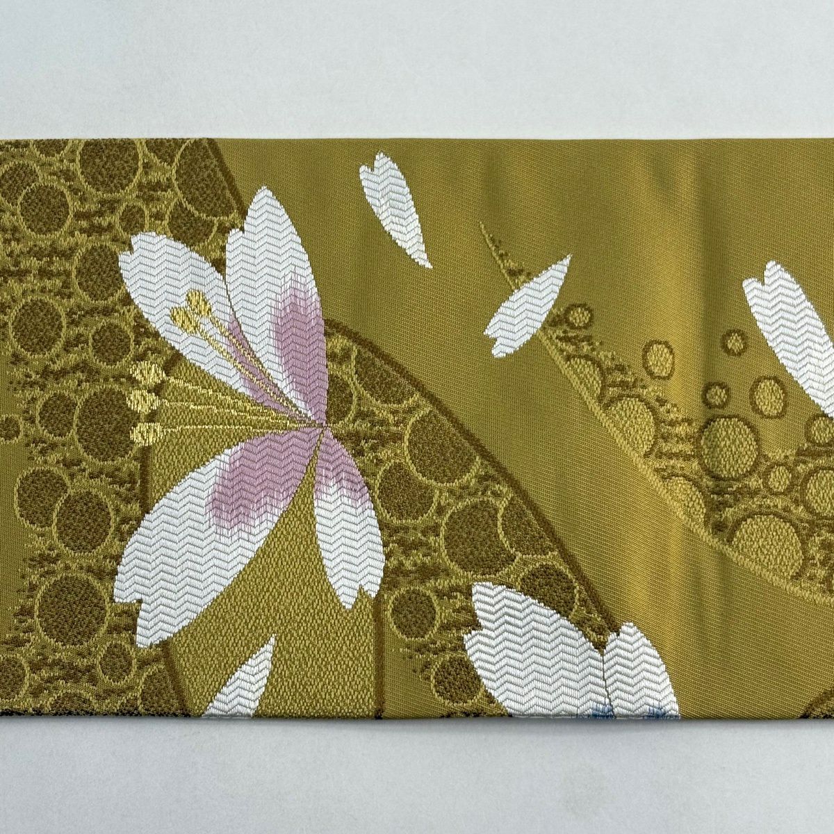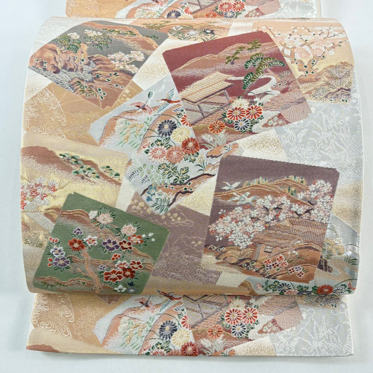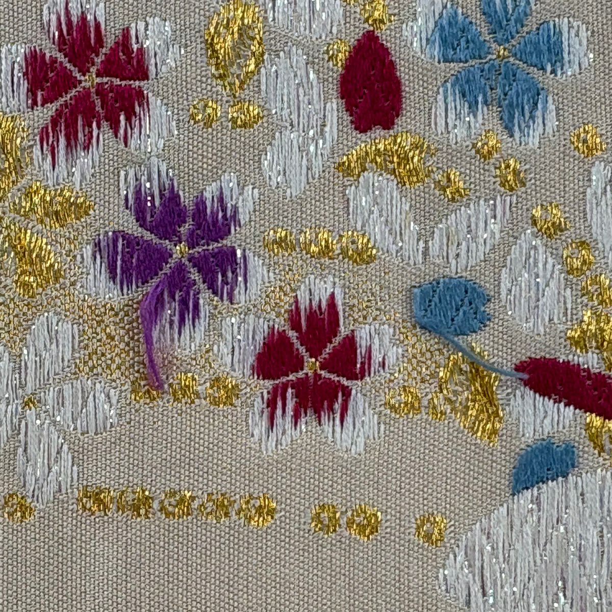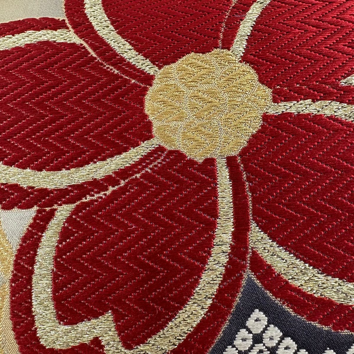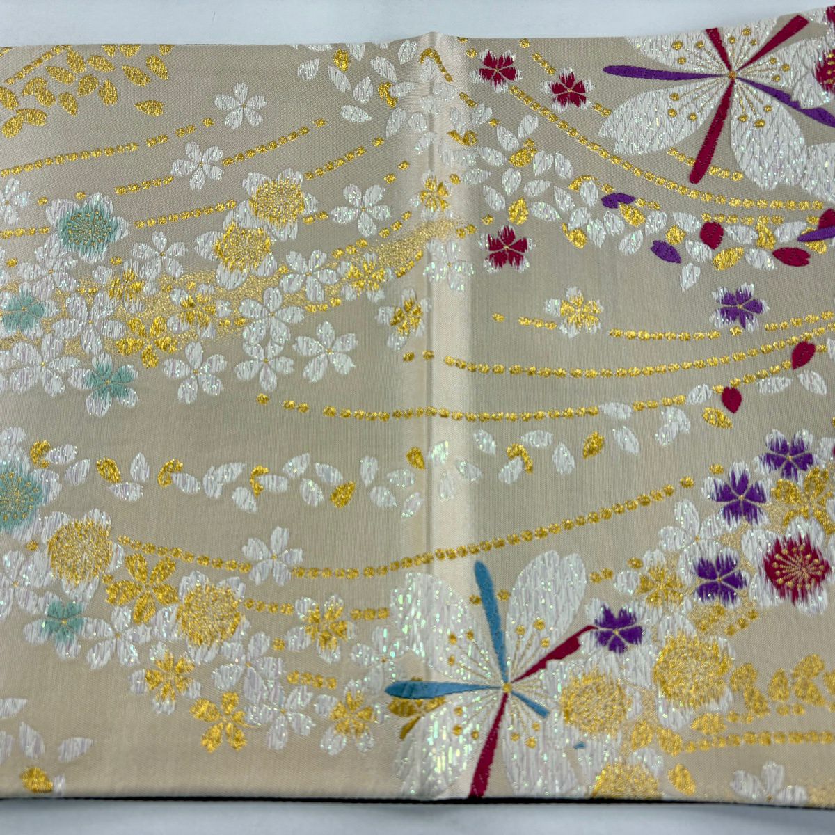 【美品】 袋帯 秀品 花 桜 刺繍 箔 ベージュ 六通 正絹
