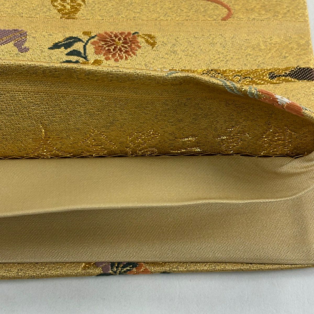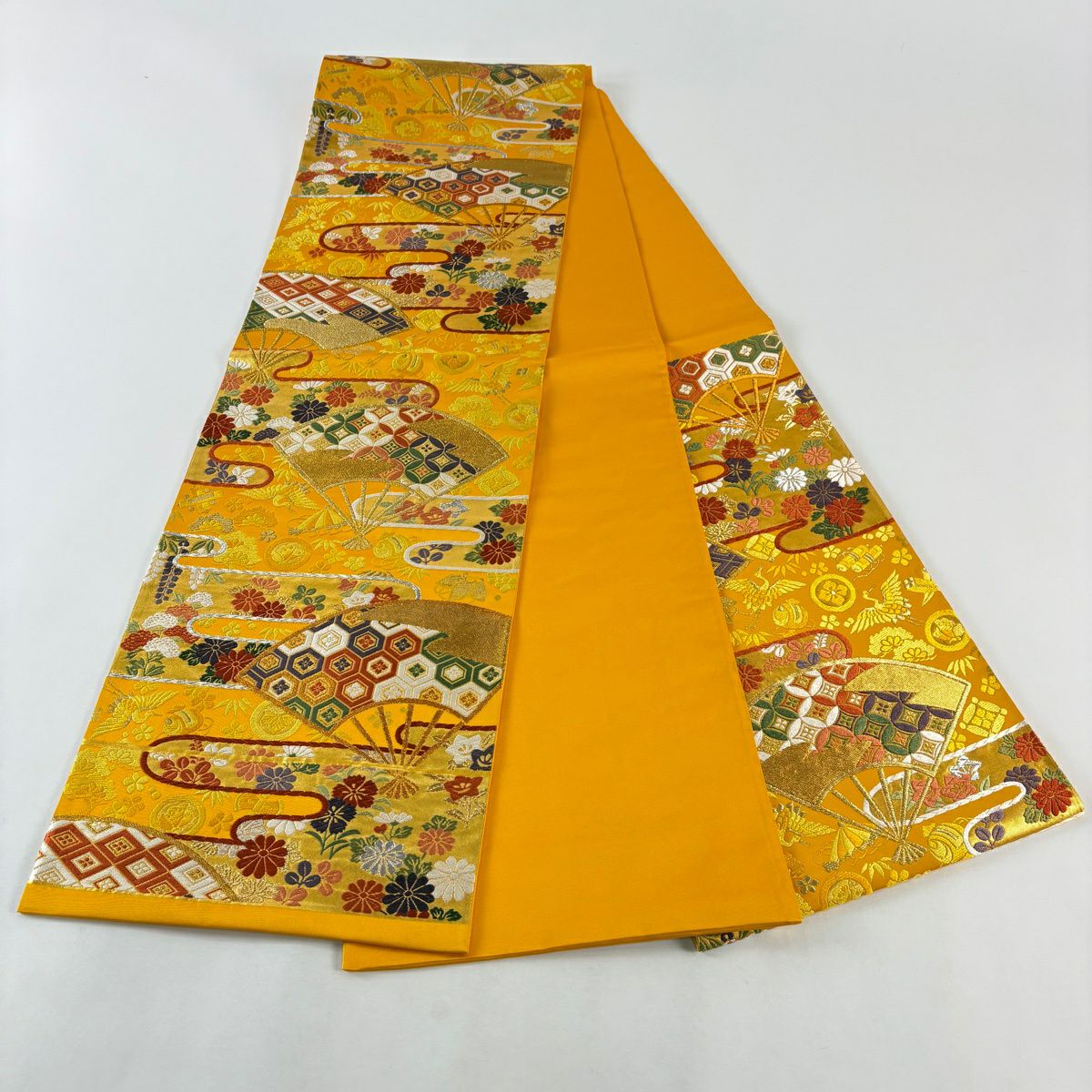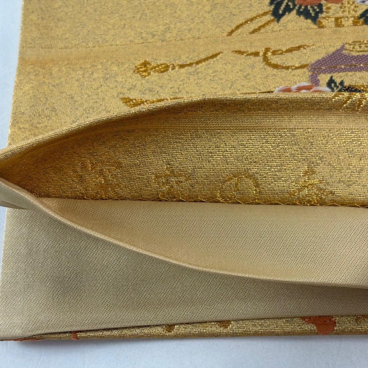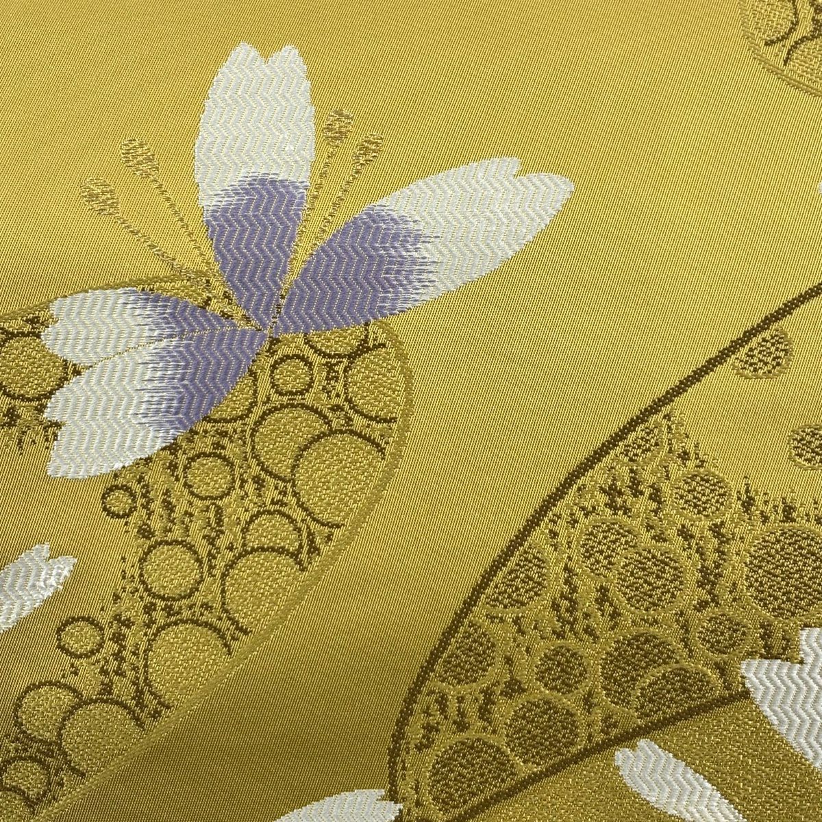 袋帯 秀品 関西仕立て 扇 草花 金銀糸 箔 山吹色 六通 正絹