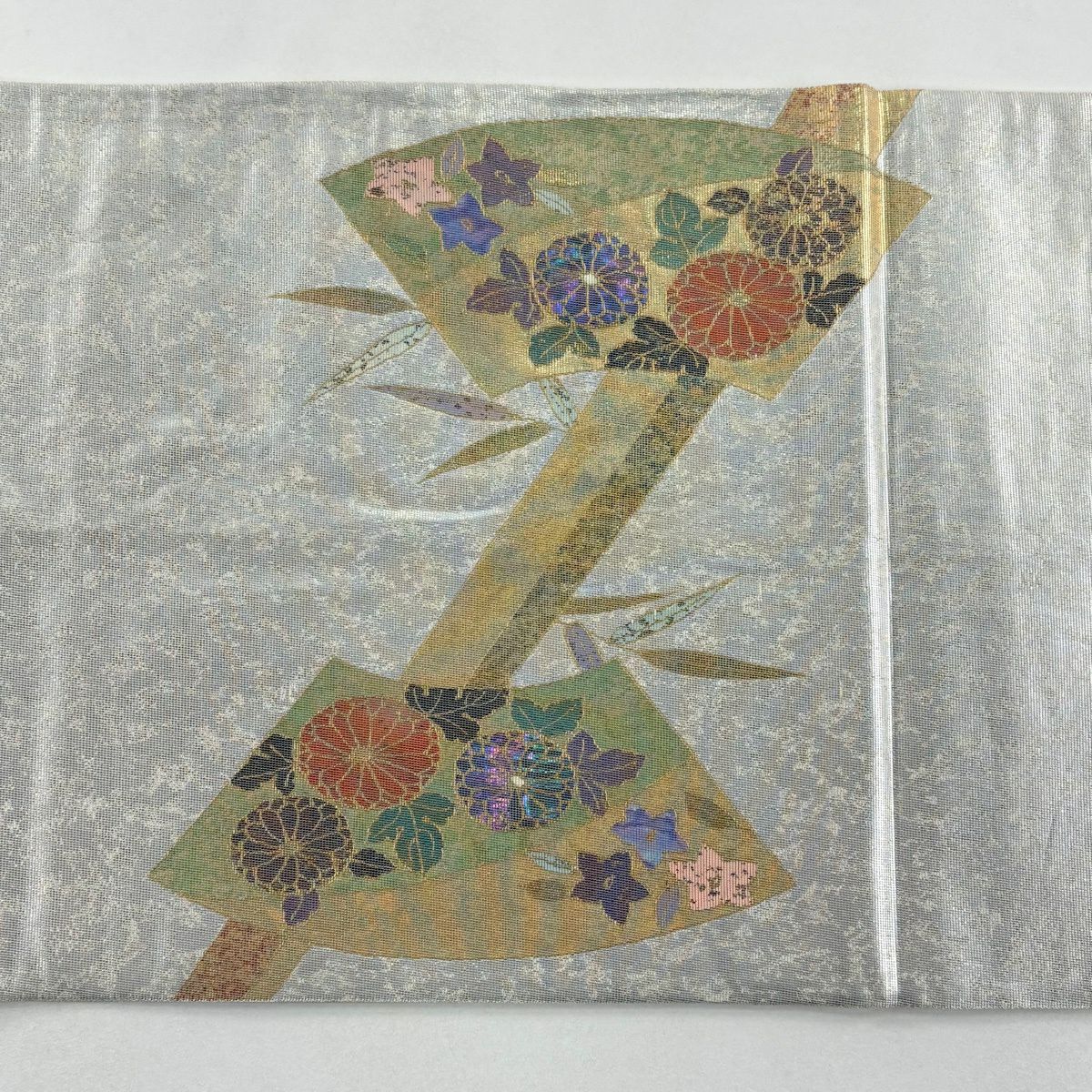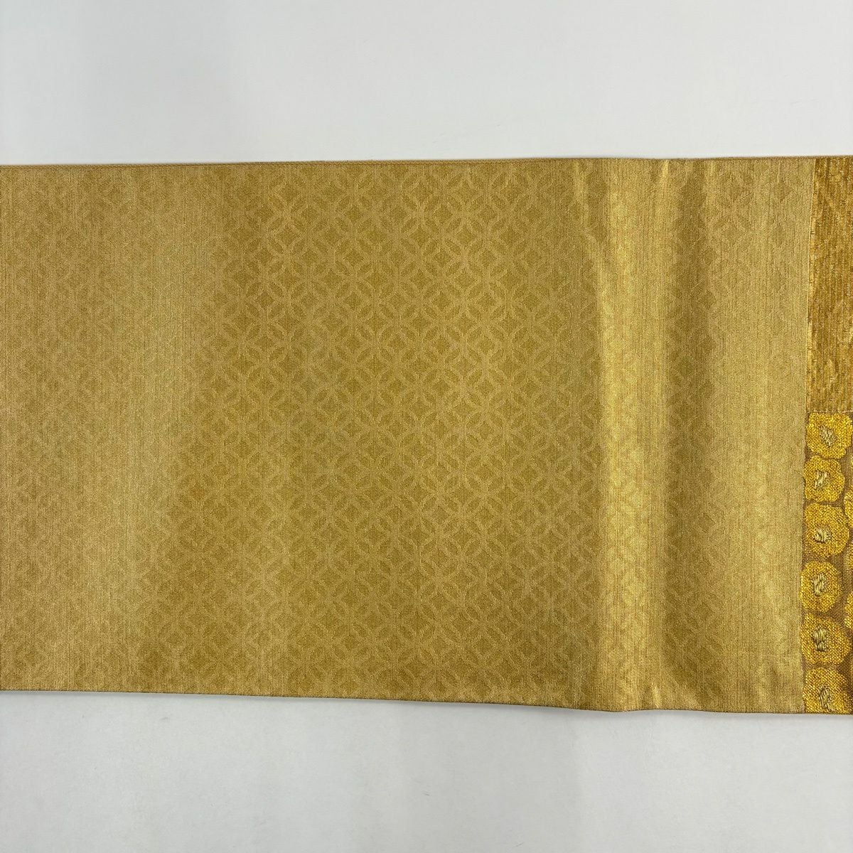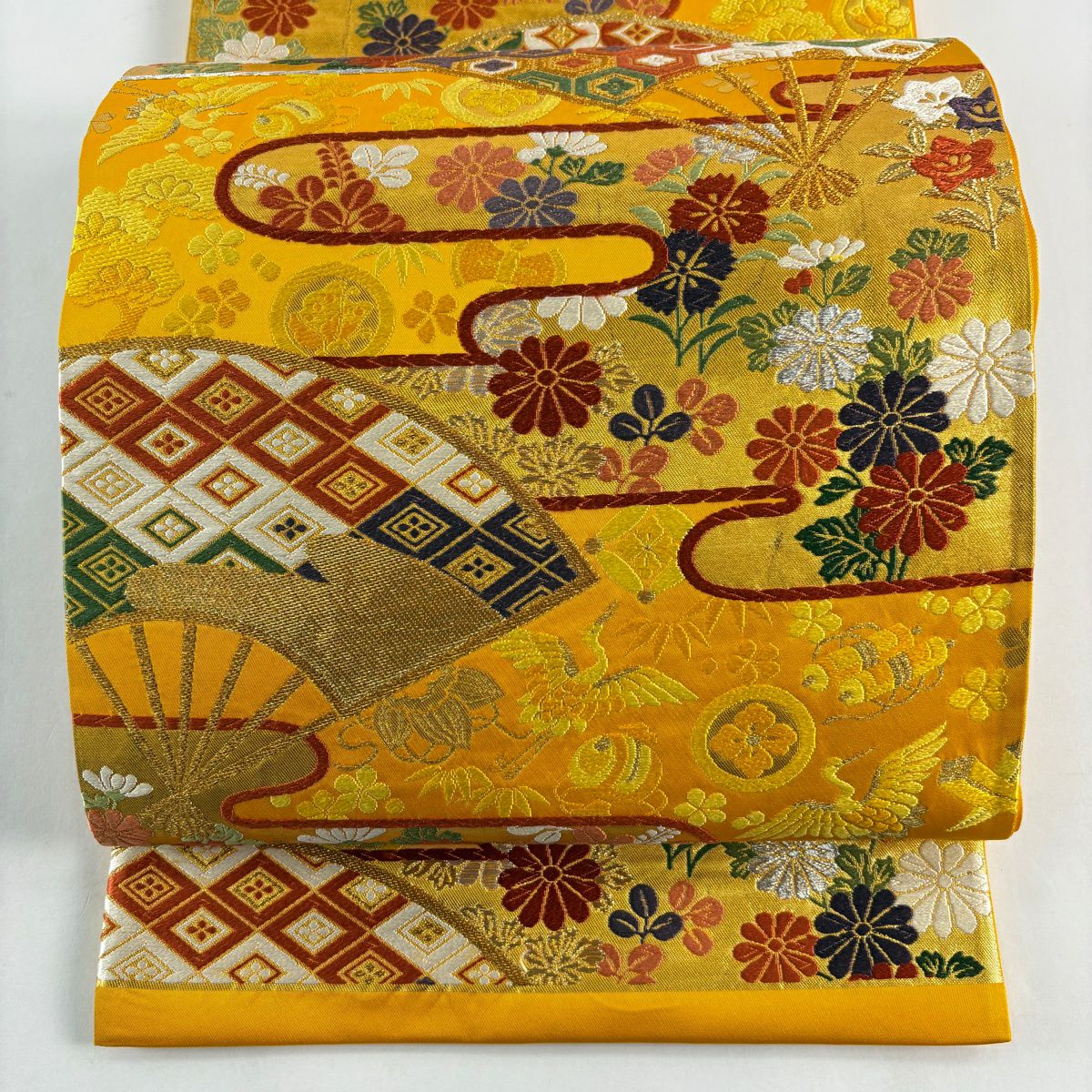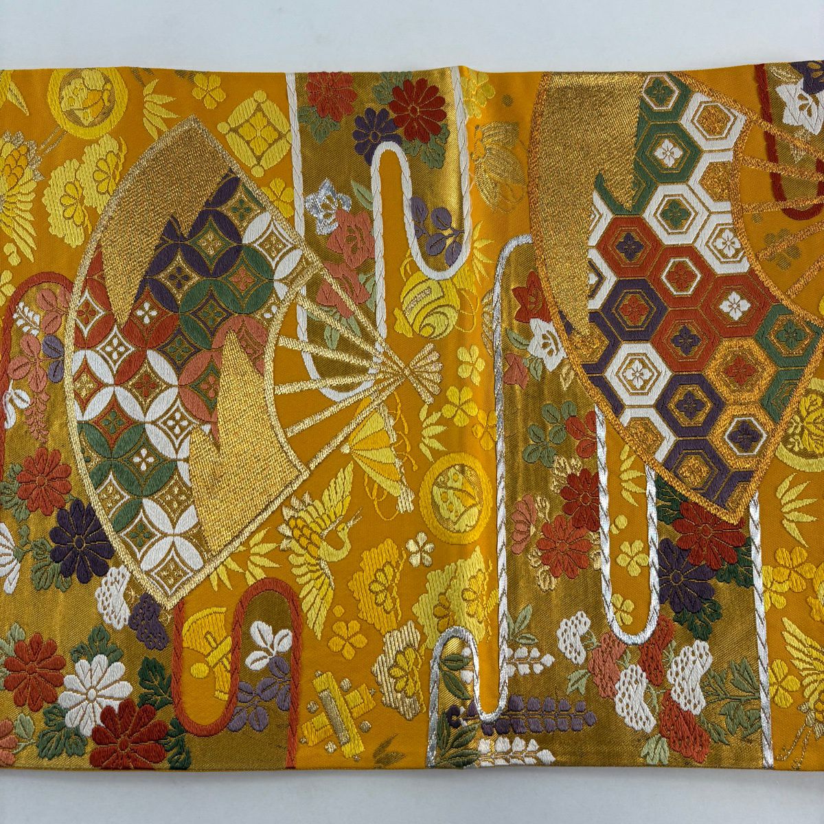 袋帯 秀品 関西仕立て 扇 草花 金銀糸 箔 山吹色 六通 正絹