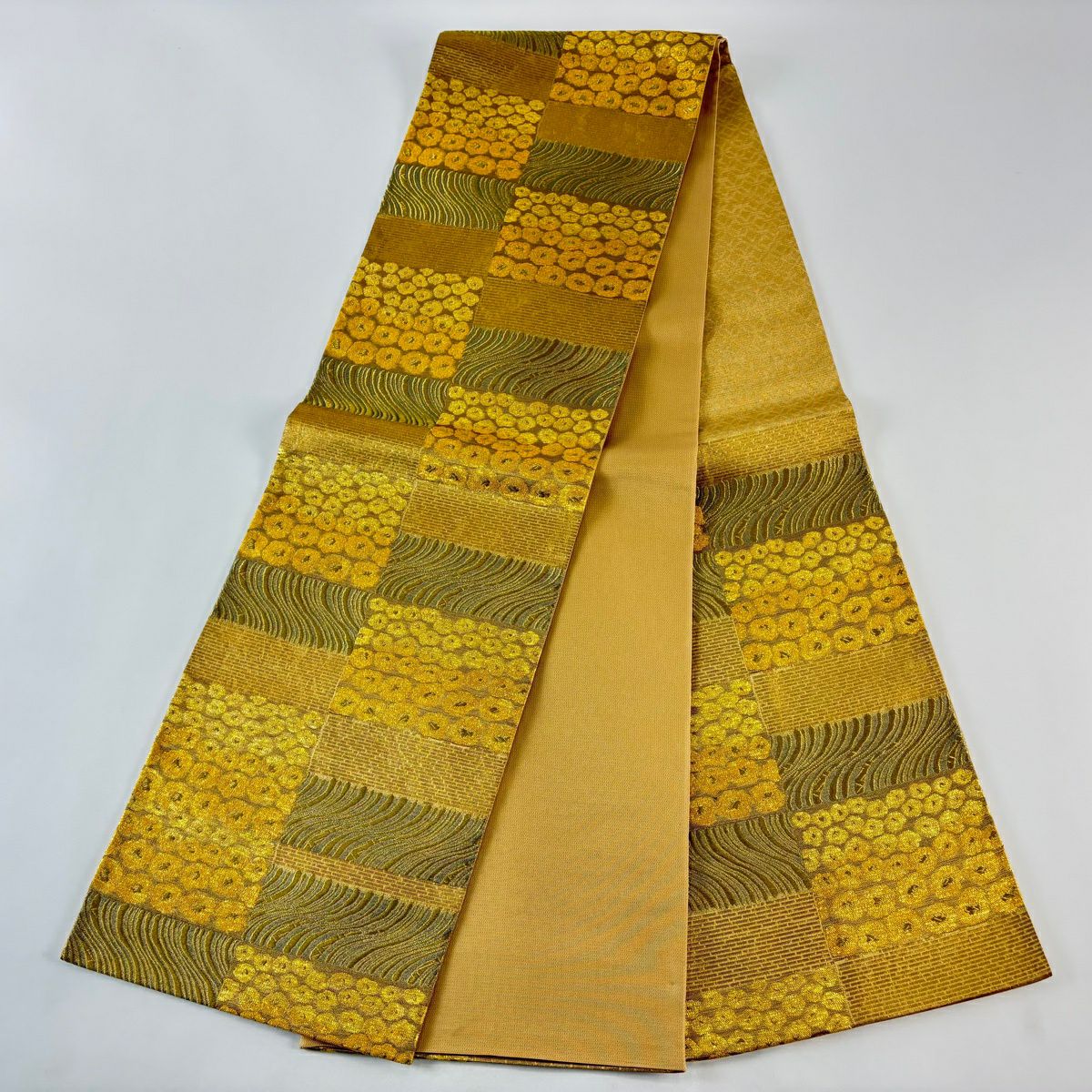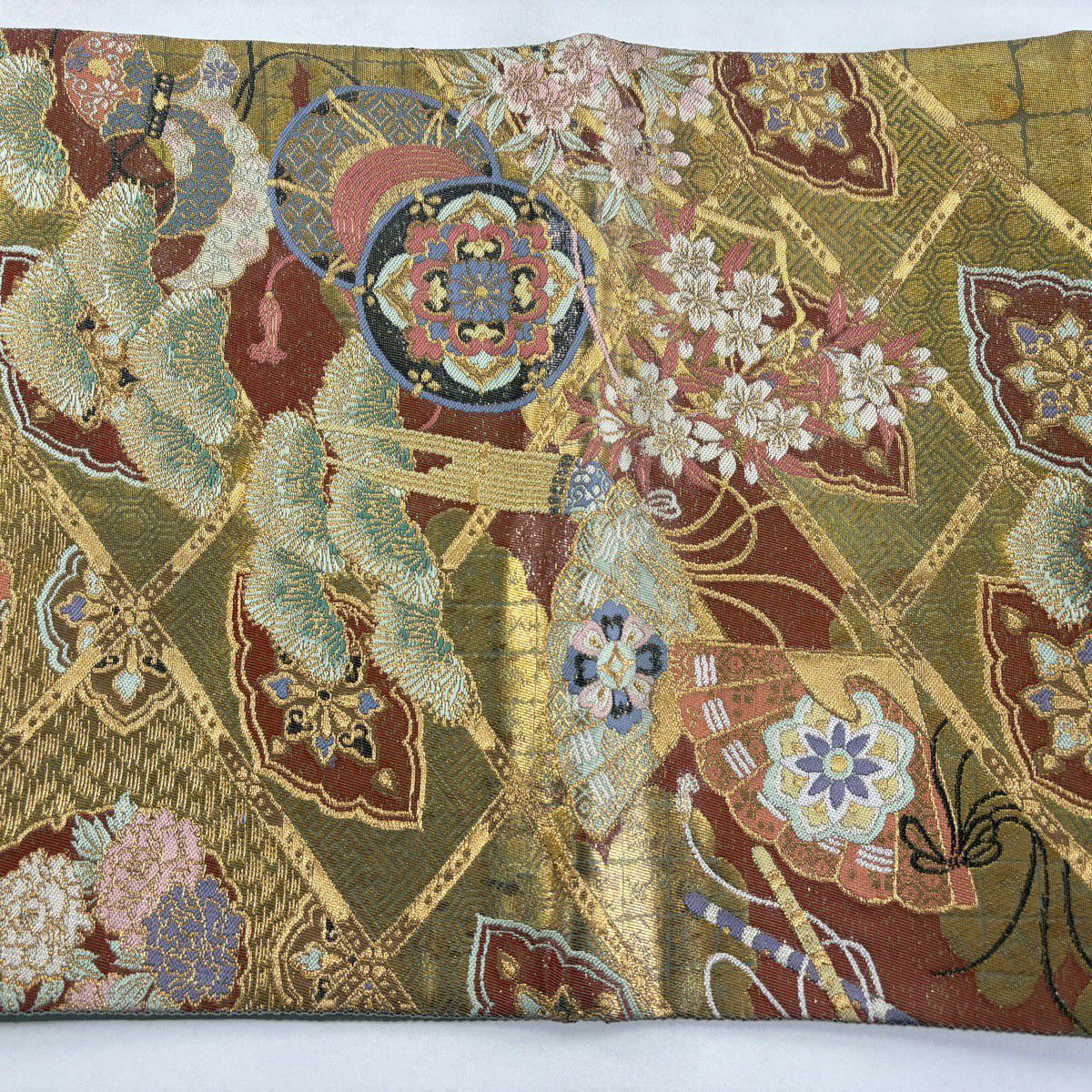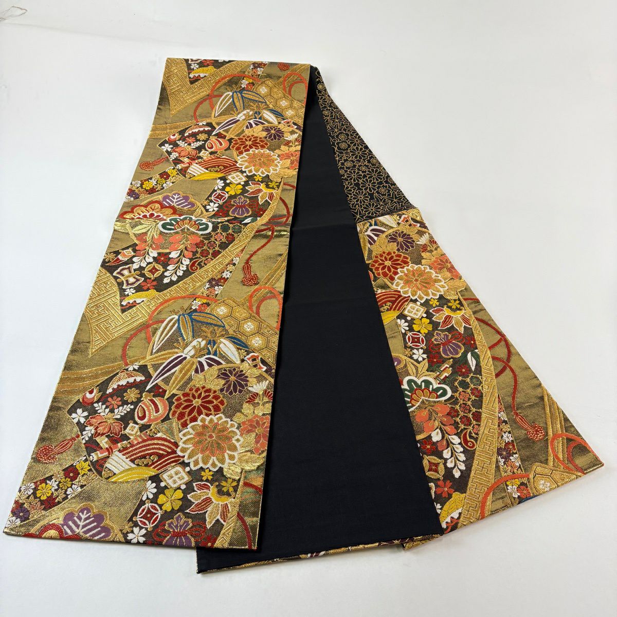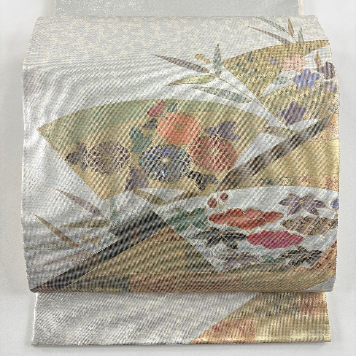 袋帯 秀品 関西仕立て 扇 草花 金銀糸 箔 山吹色 六通 正絹