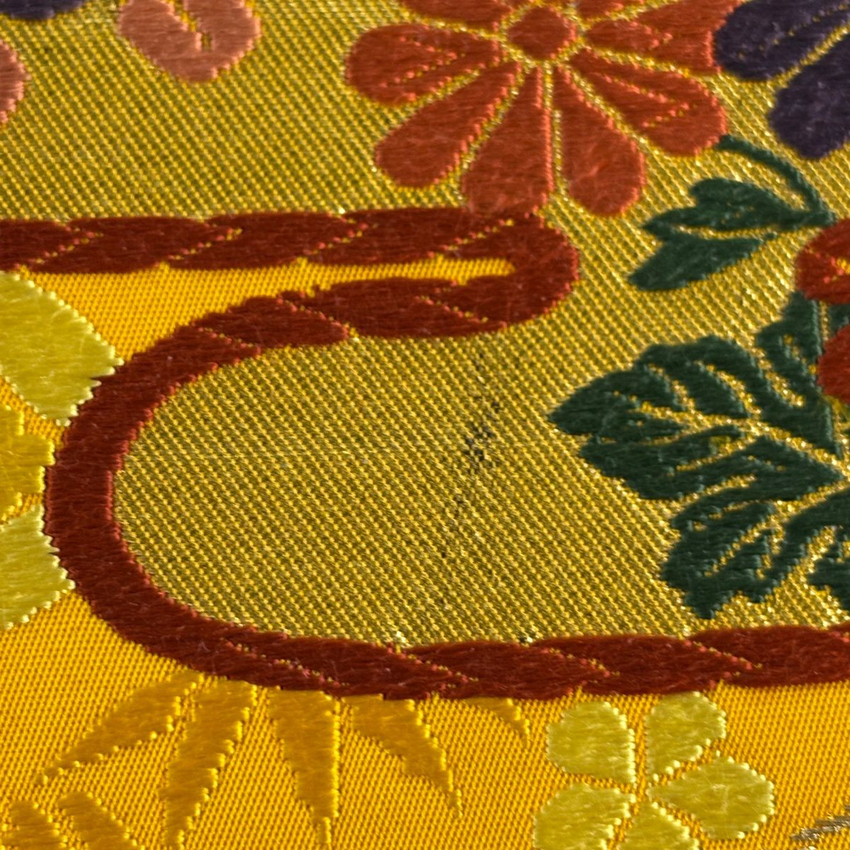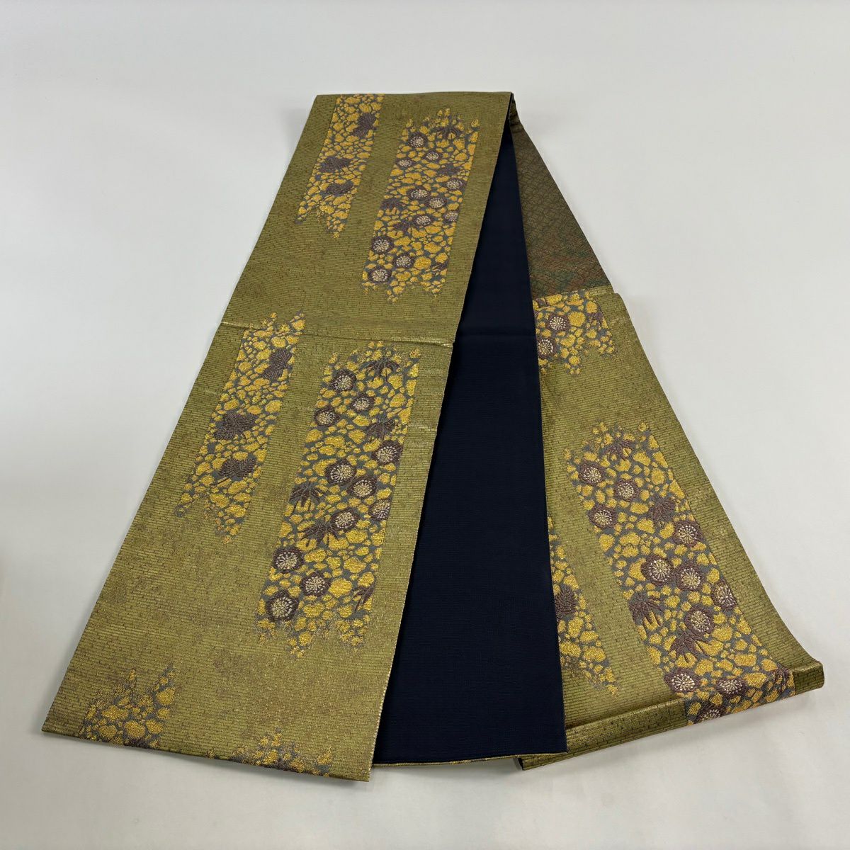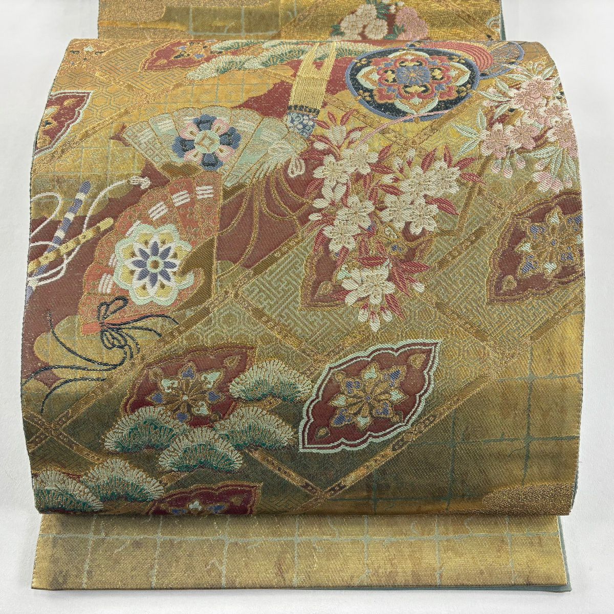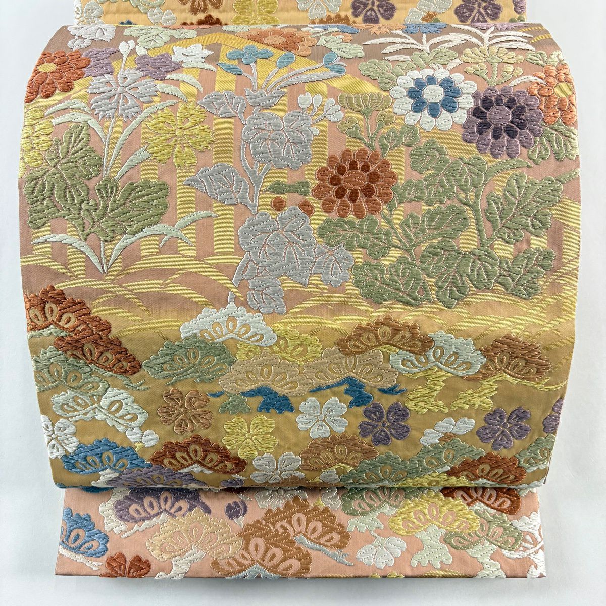 袋帯 秀品 関西仕立て 扇 草花 金銀糸 箔 山吹色 六通 正絹
