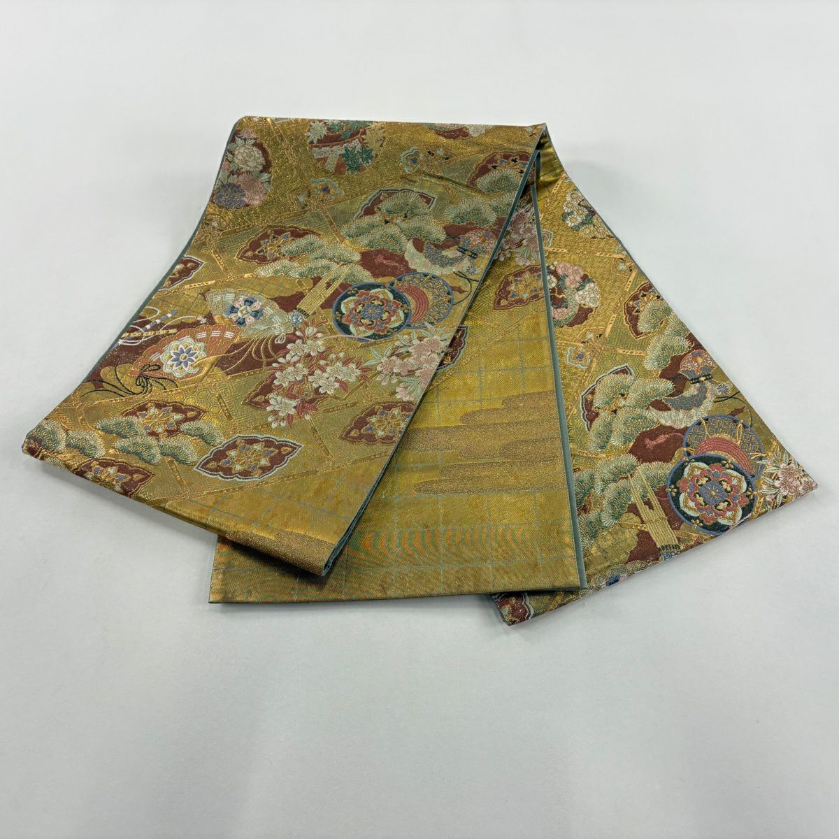 【美品】 袋帯 秀品 松竹梅 短冊 金糸 箔 茶緑色 六通 正絹