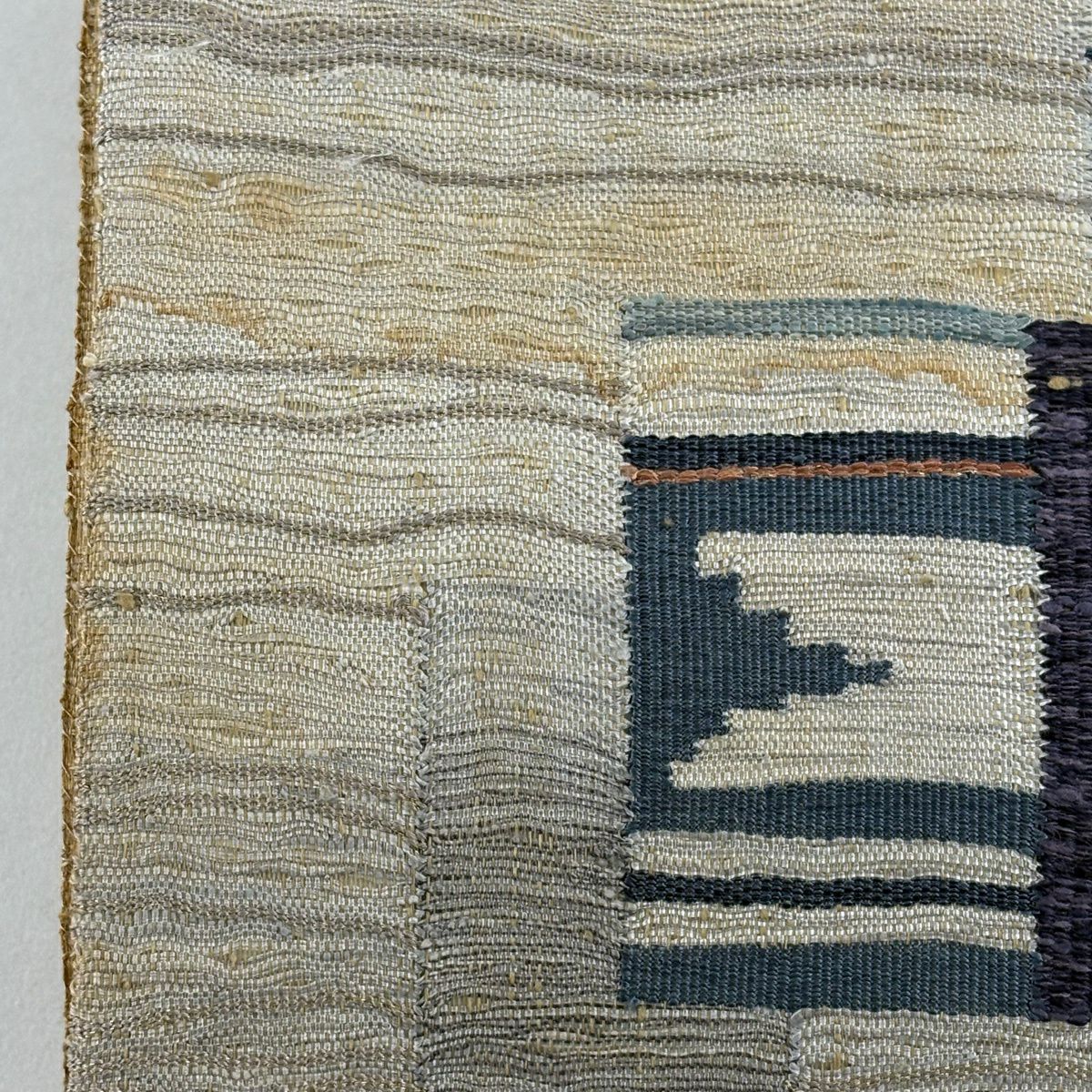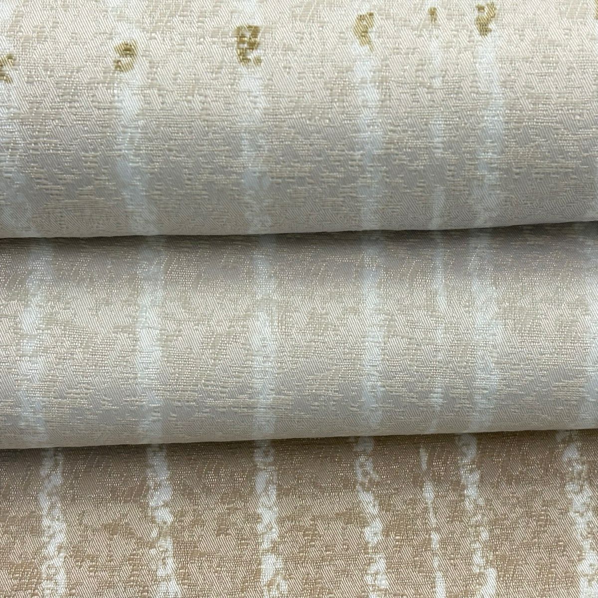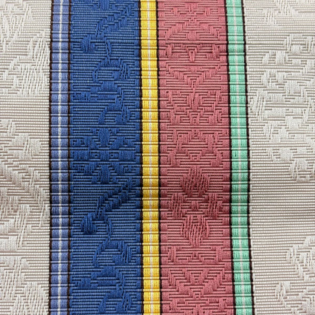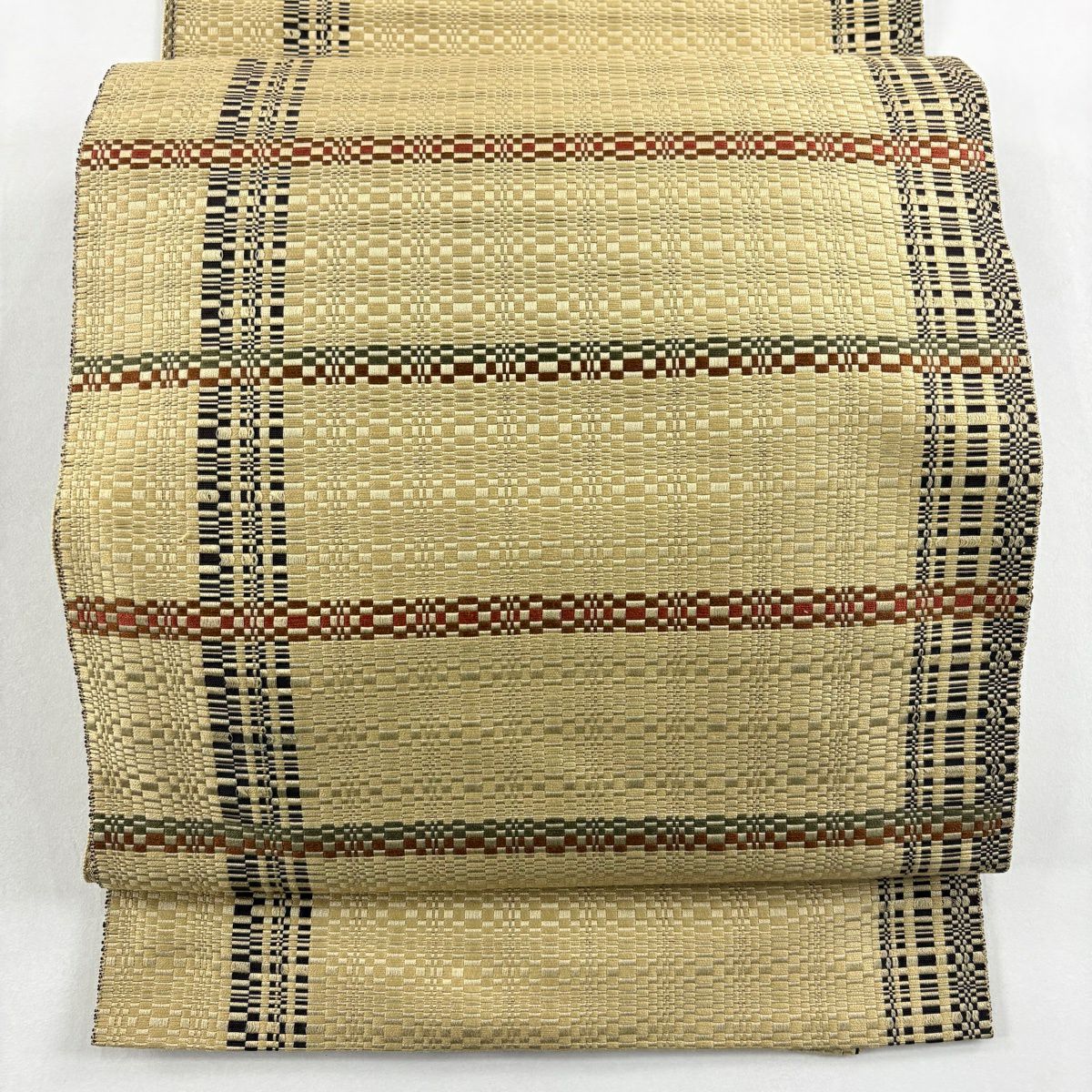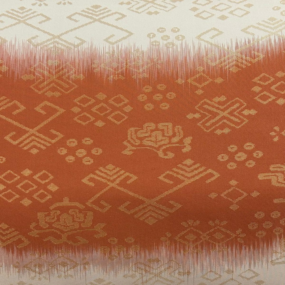 【美品】 袋帯 秀品 幾何学 段縞 箔 ベージュ 六通 正絹