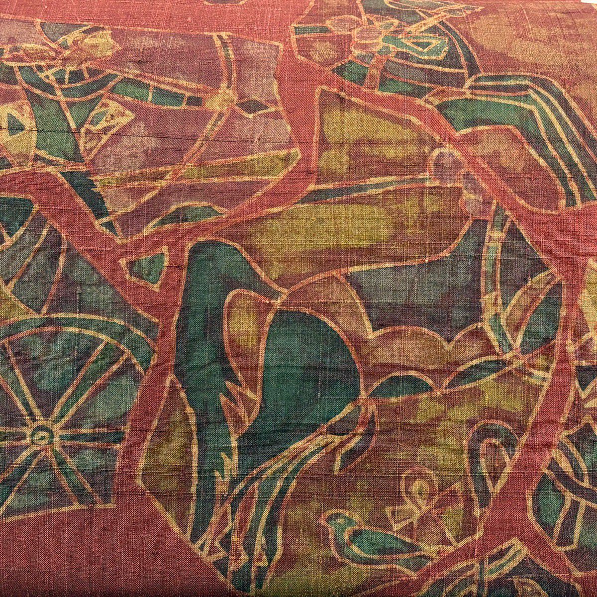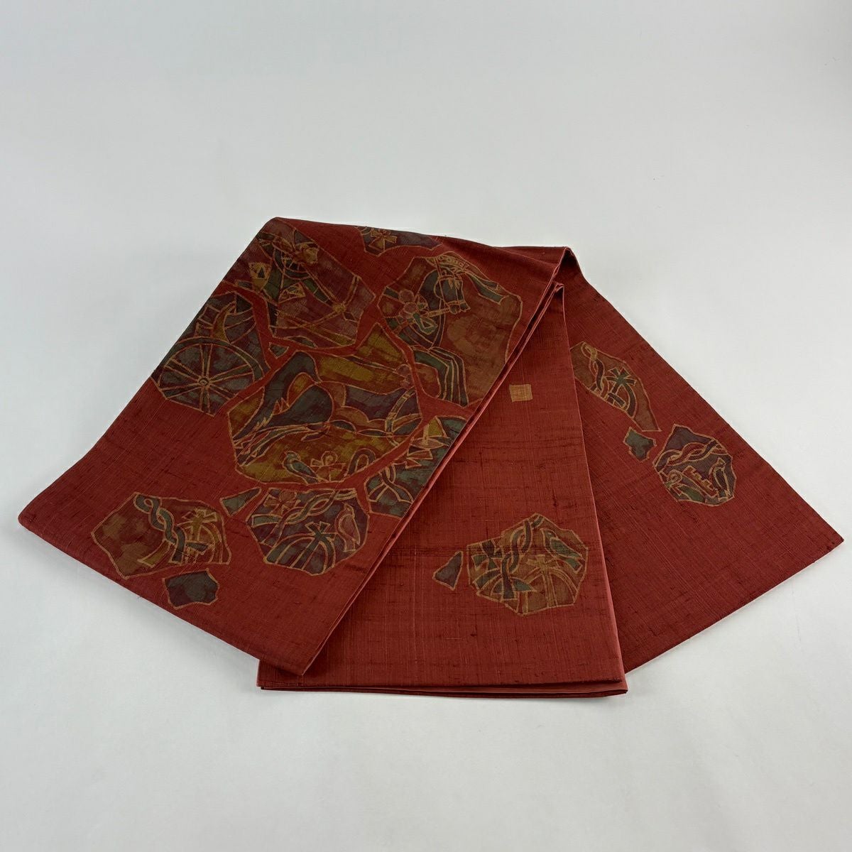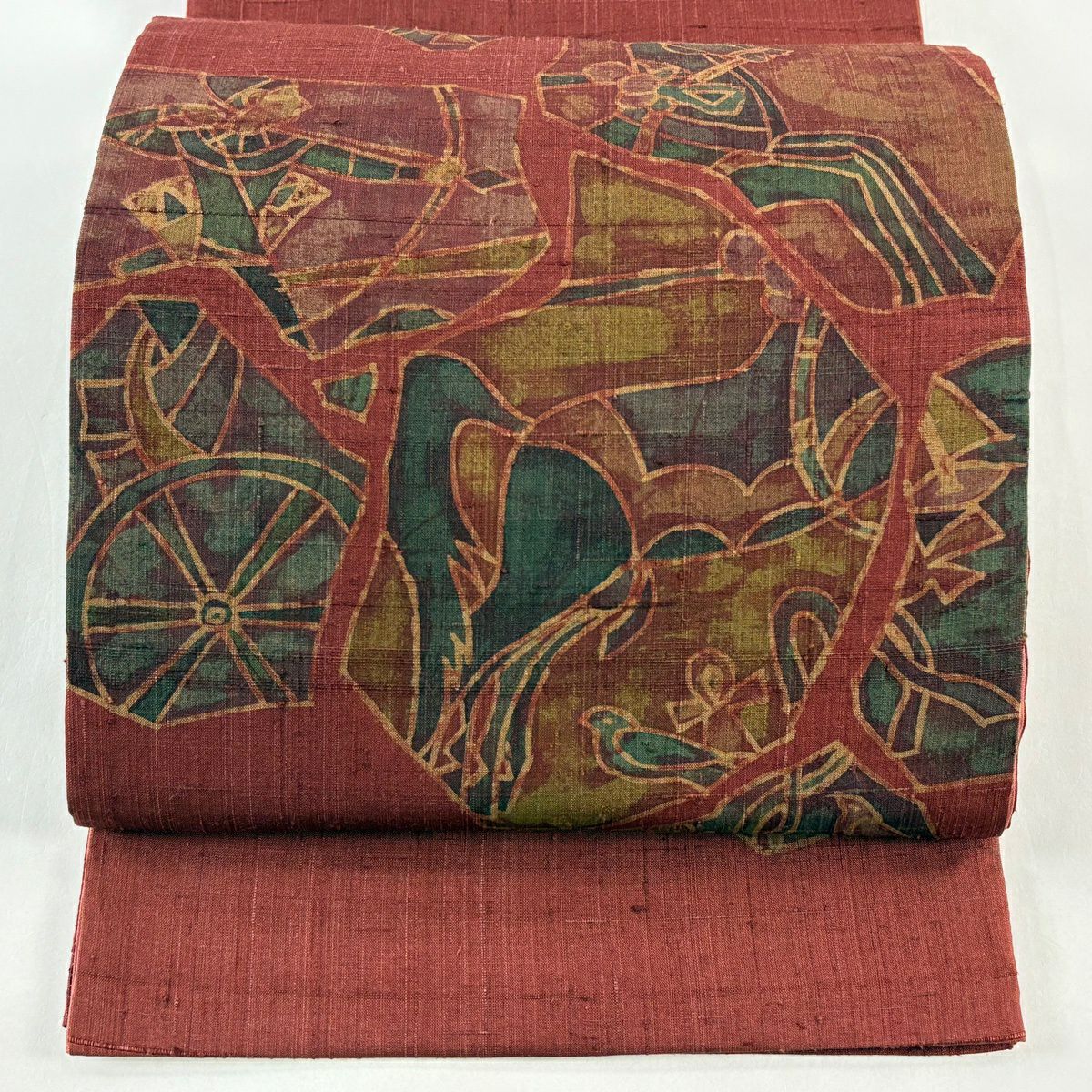 袋帯 秀品 落款あり 紬地 狩猟文 鳥 えんじ色 お太鼓柄 正絹