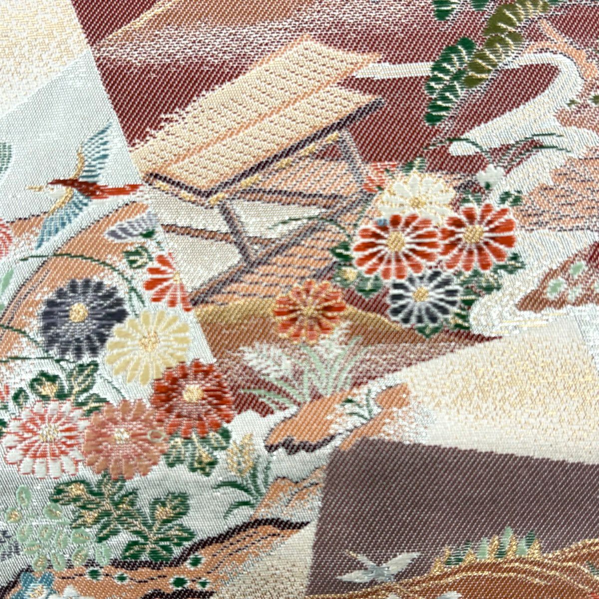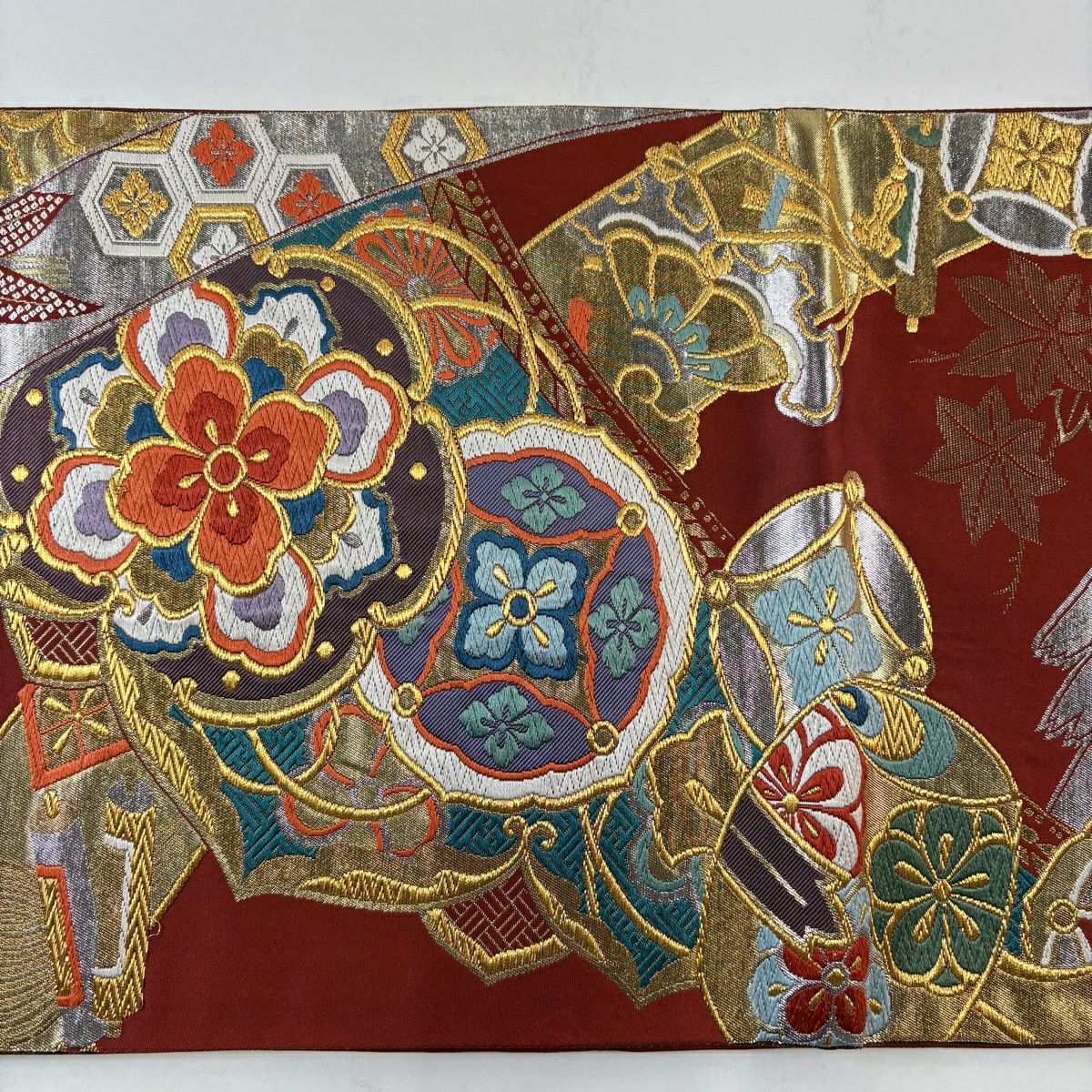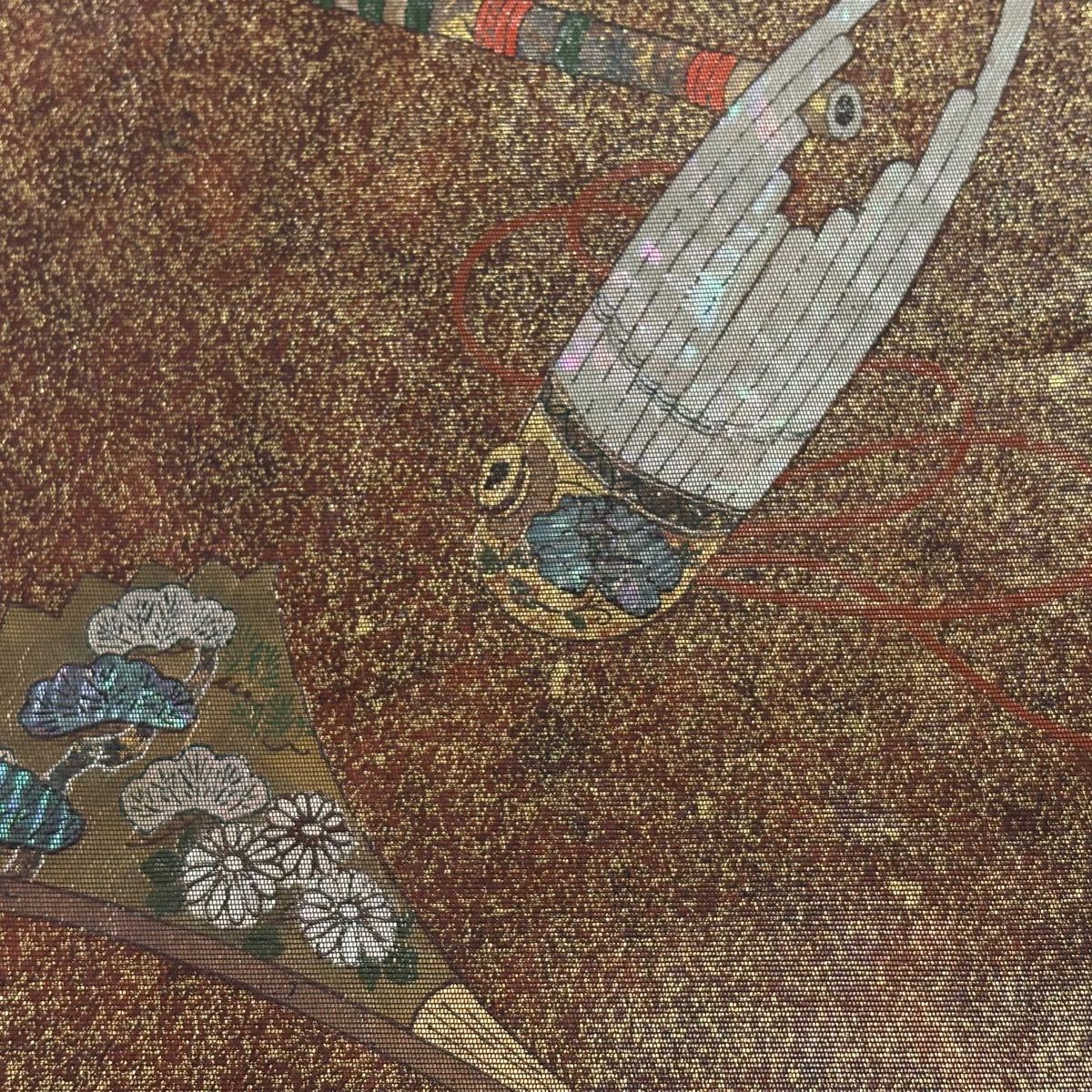 【美品】 袋帯 秀品 楽器 扇 螺鈿箔 箔 赤茶 お太鼓柄 正絹