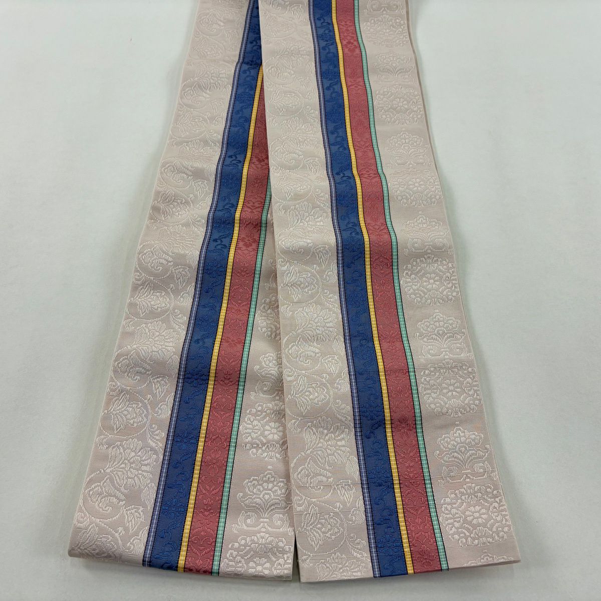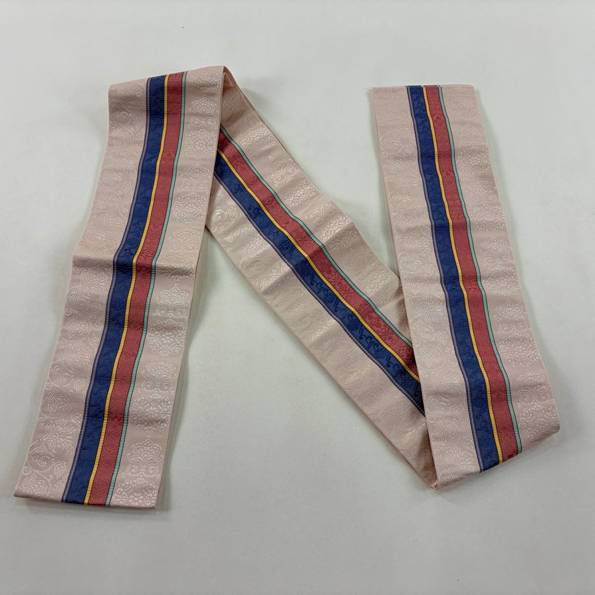 【美品】半幅帯 秀品 博多織 証紙 縞 花唐草 薄ピンク 正絹