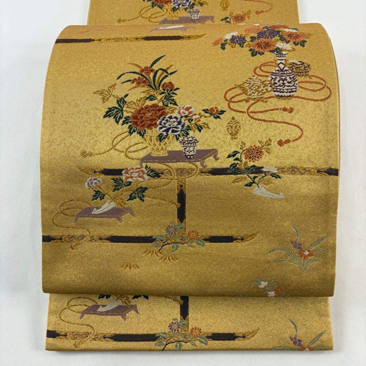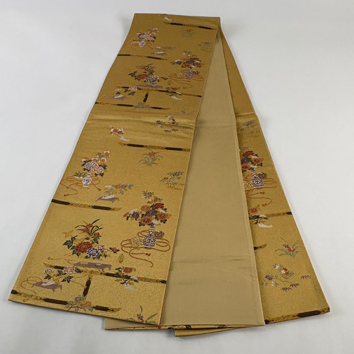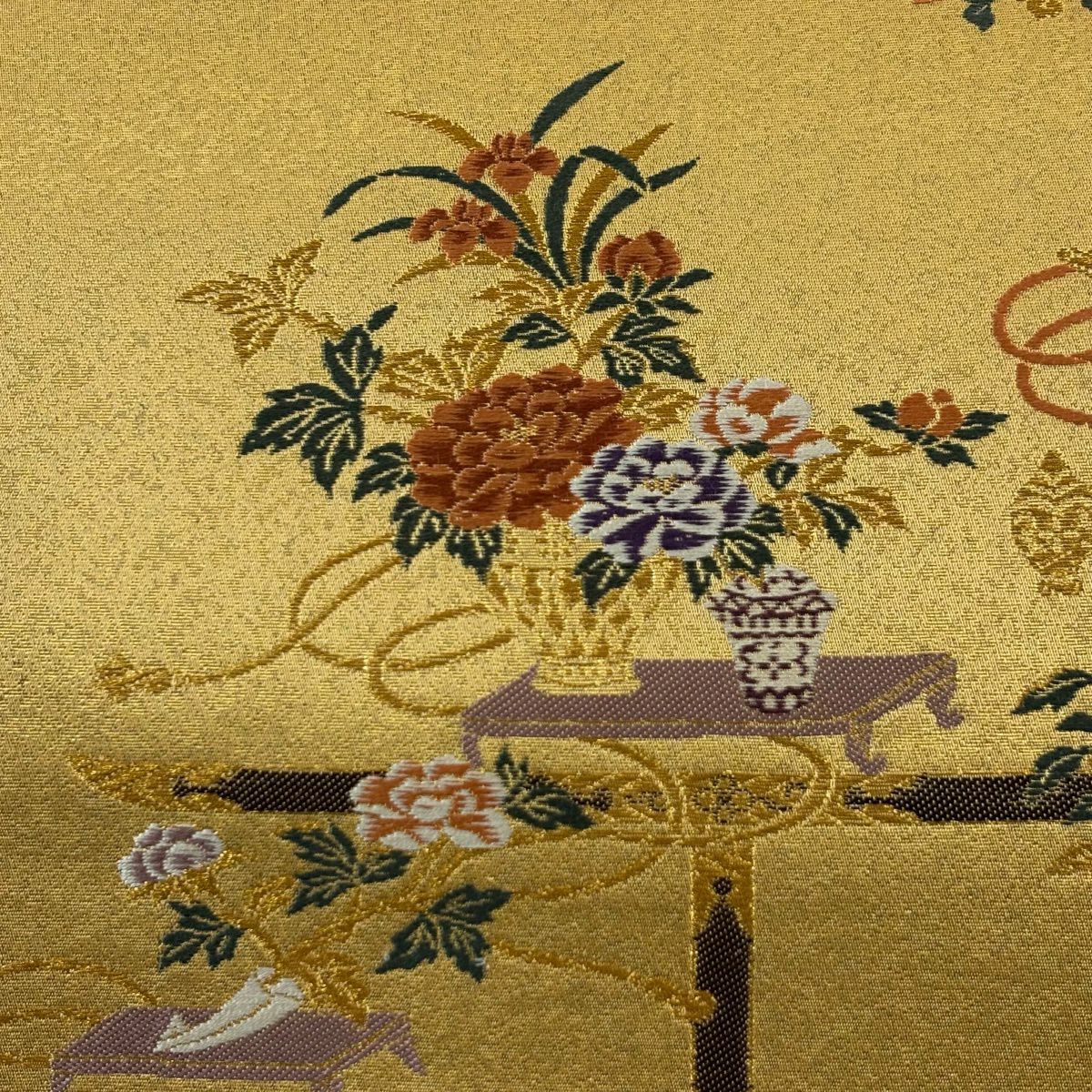 【美品】 袋帯 秀品 花器 草花 金糸 箔 山吹茶色 六通 正絹