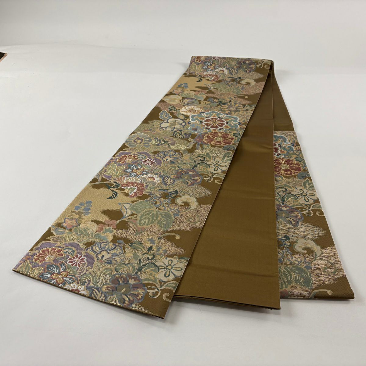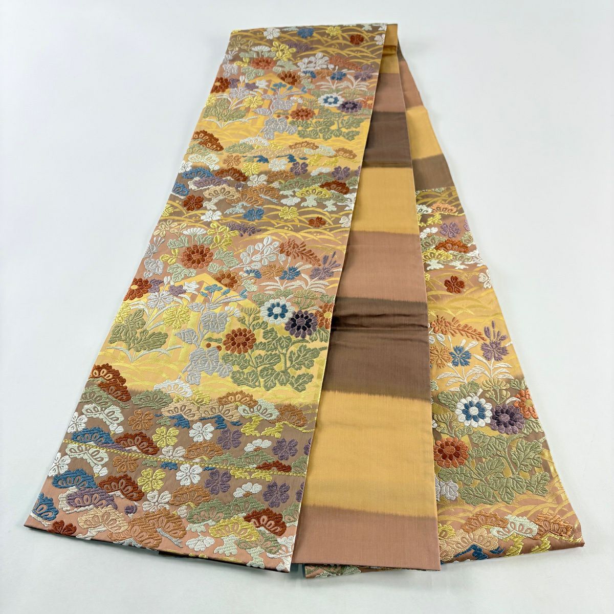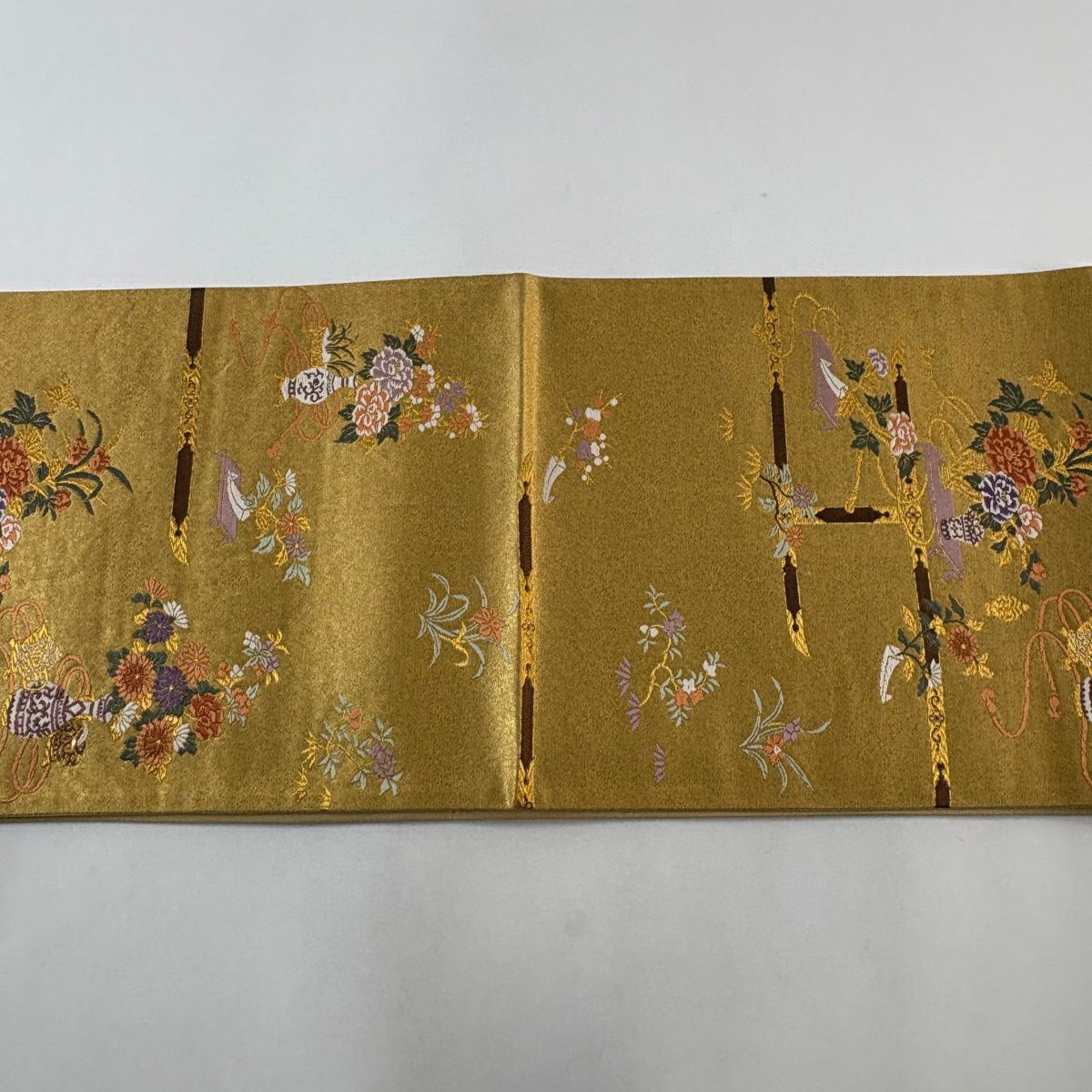 【美品】 袋帯 秀品 花器 草花 金糸 箔 山吹茶色 六通 正絹