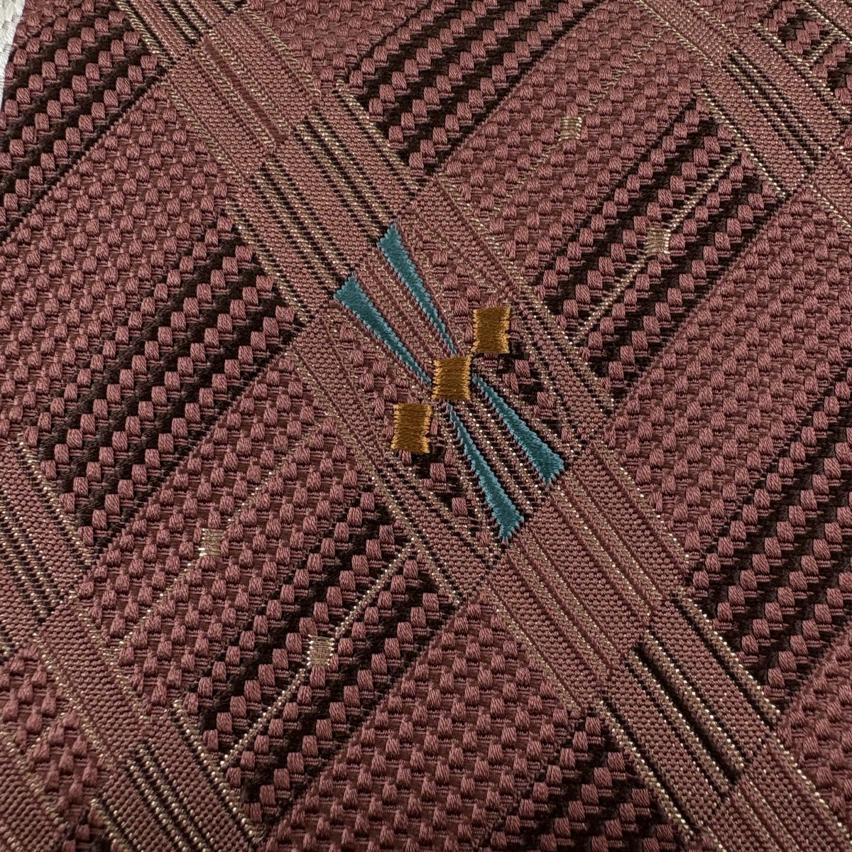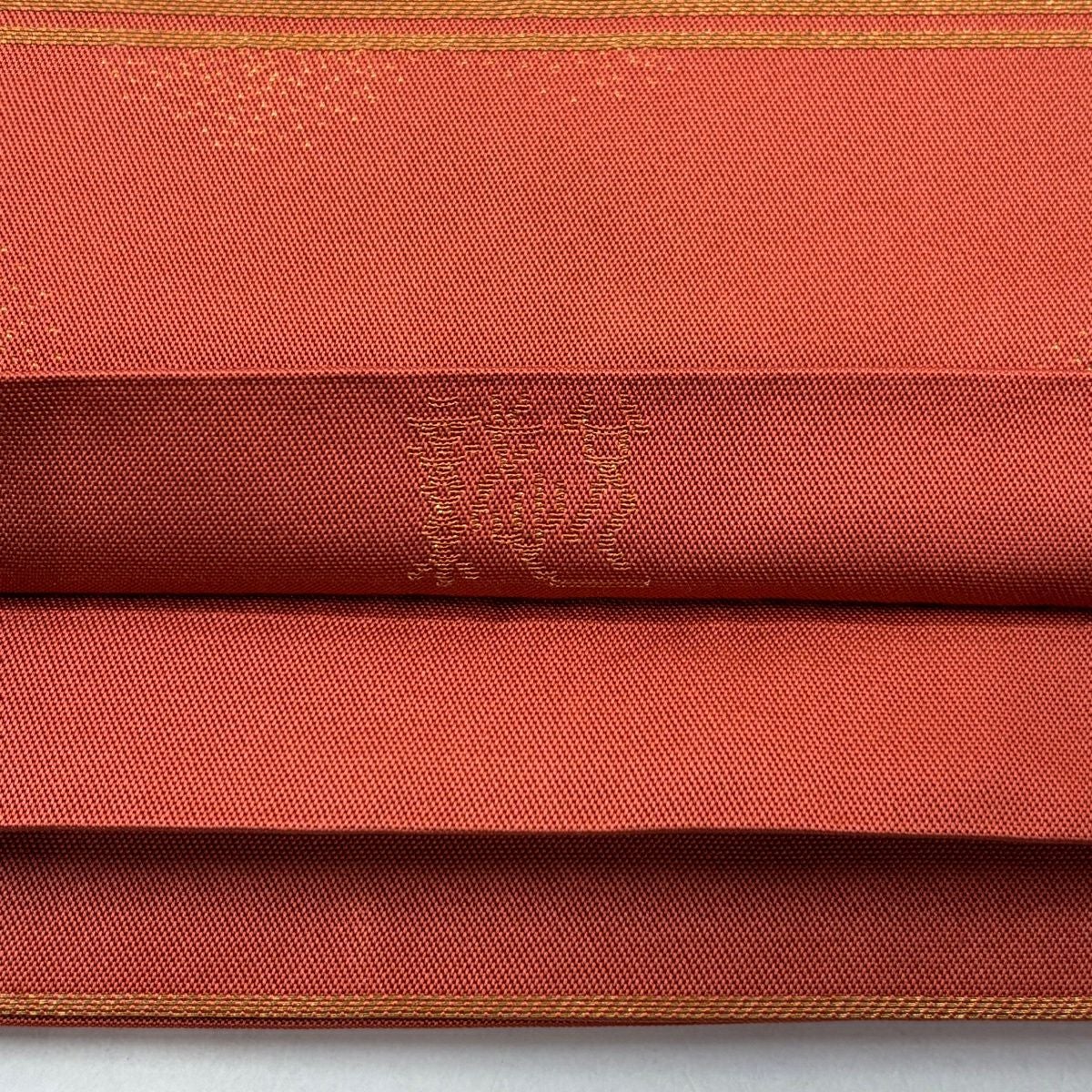【美品】 名古屋帯 秀品 八寸名古屋帯 紗縞 幾何学 金糸 赤茶 正絹
