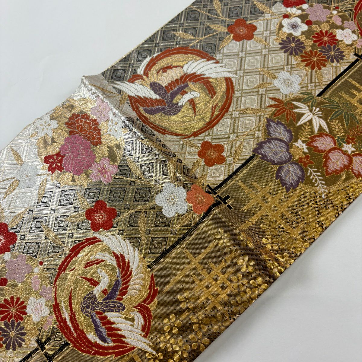 【美品】 袋帯 秀品 鳥丸文 梅 金糸 箔 クリーム 六通 正絹