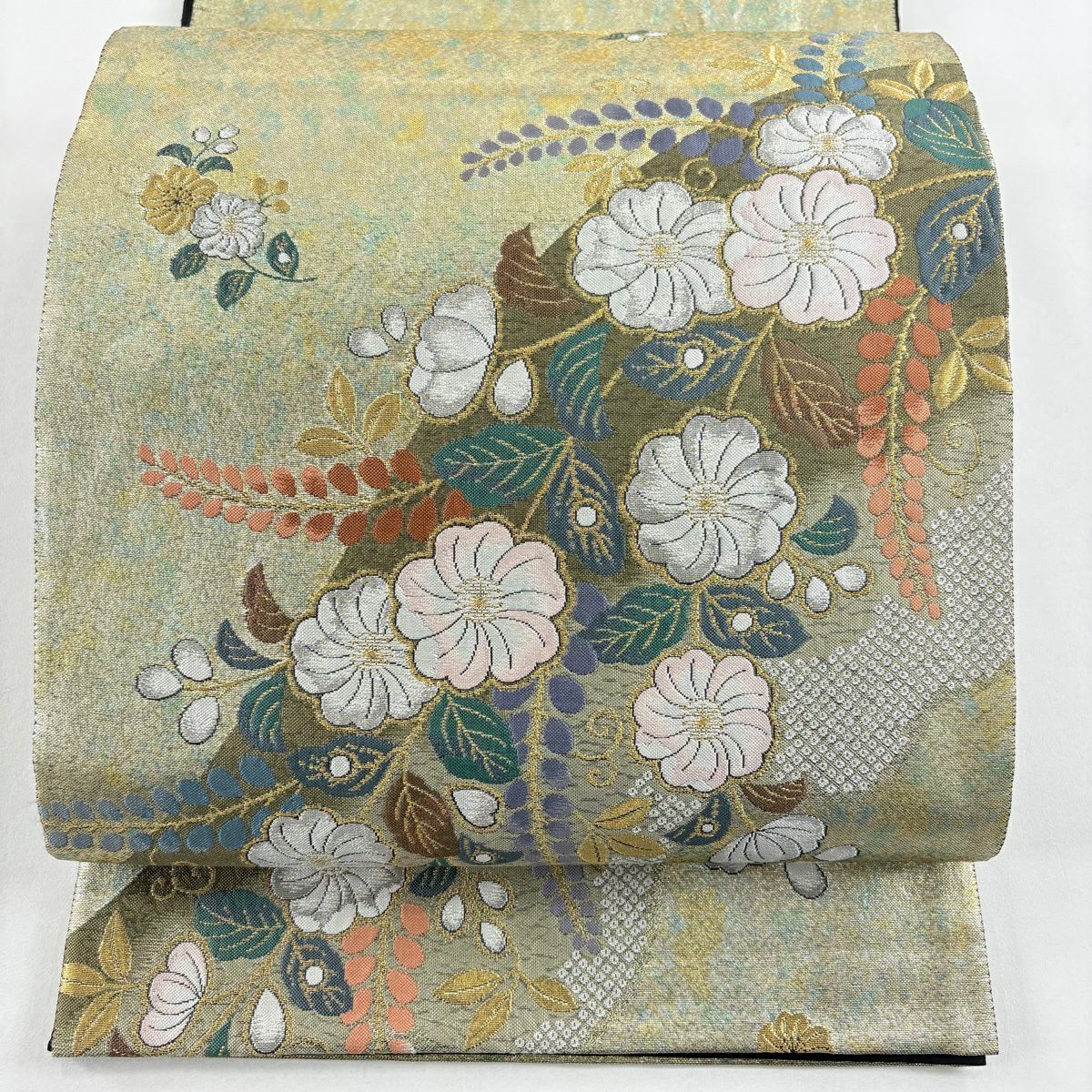 【美品】 袋帯 秀品 草花 金銀糸 箔 ベージュ 六通 正絹