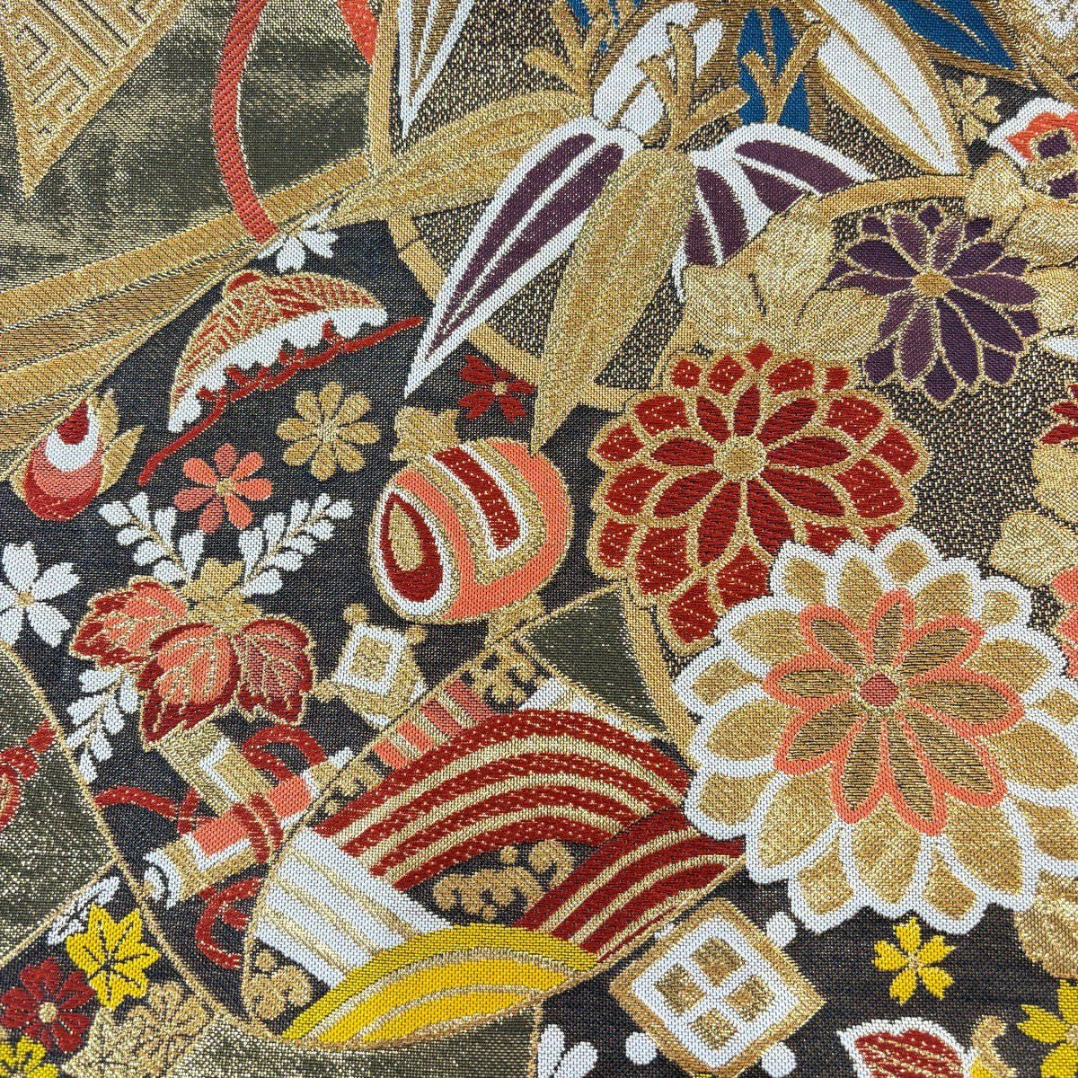 【美品】 袋帯 秀品 和楽器 草花 箔 金糸 金色 お太鼓柄 正絹