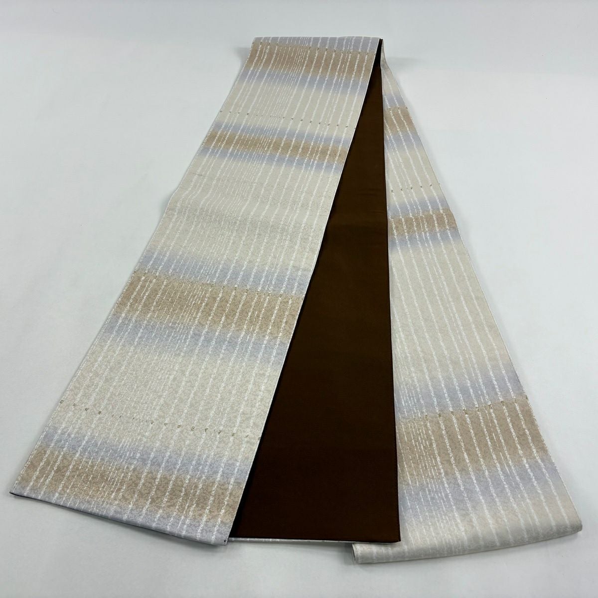 名古屋帯 秀品 八寸名古屋帯 松葉仕立て 縞 変わり市松 薄茶色 正絹