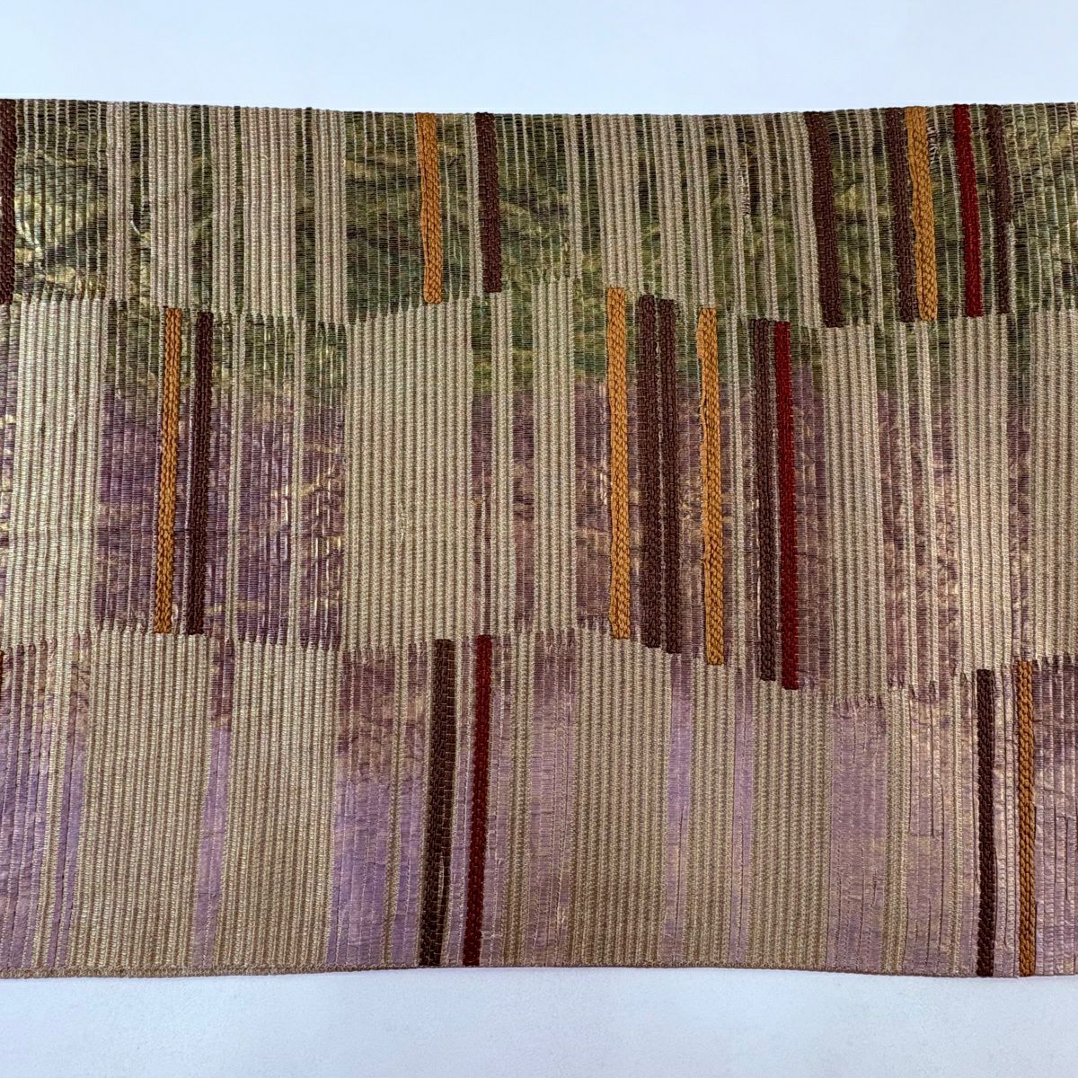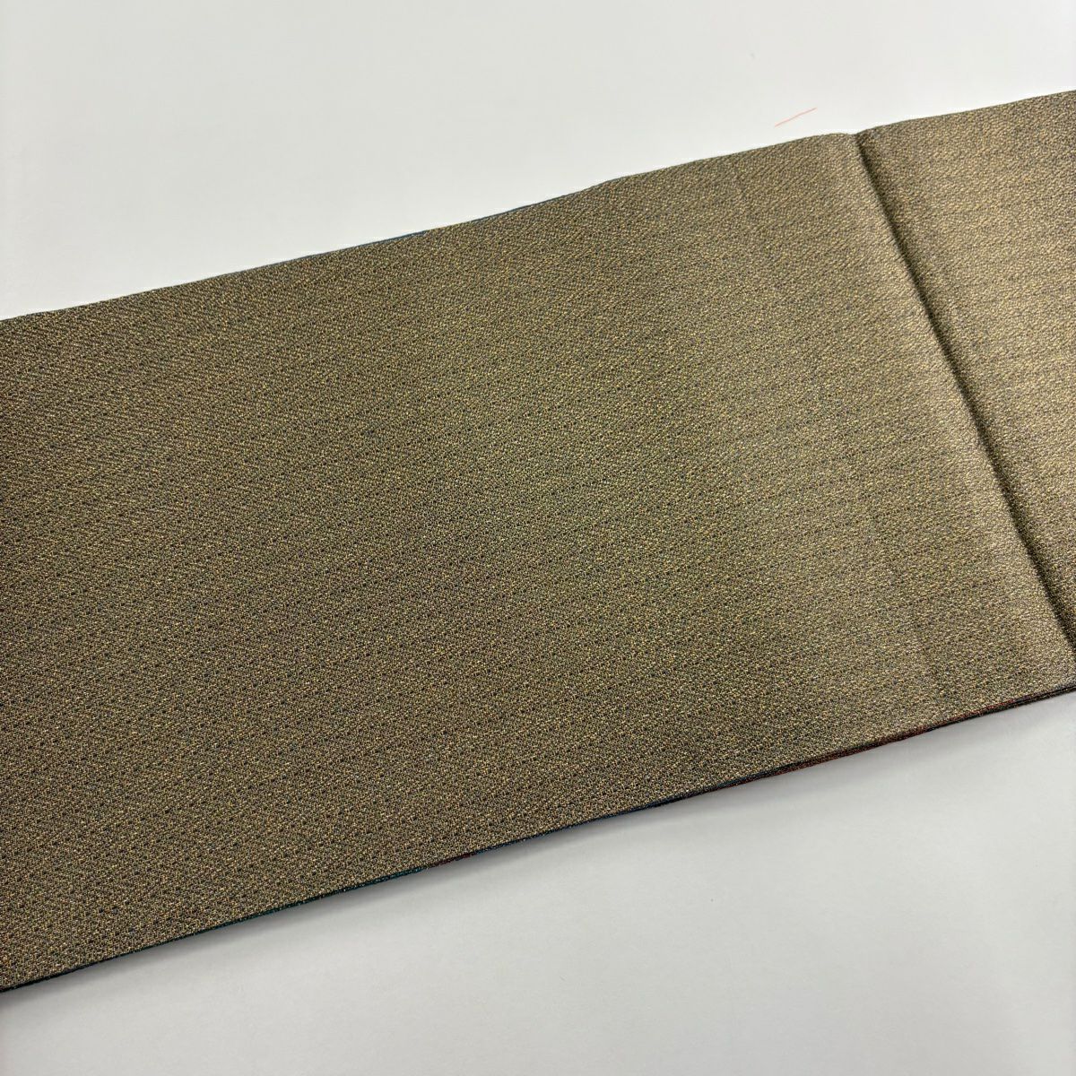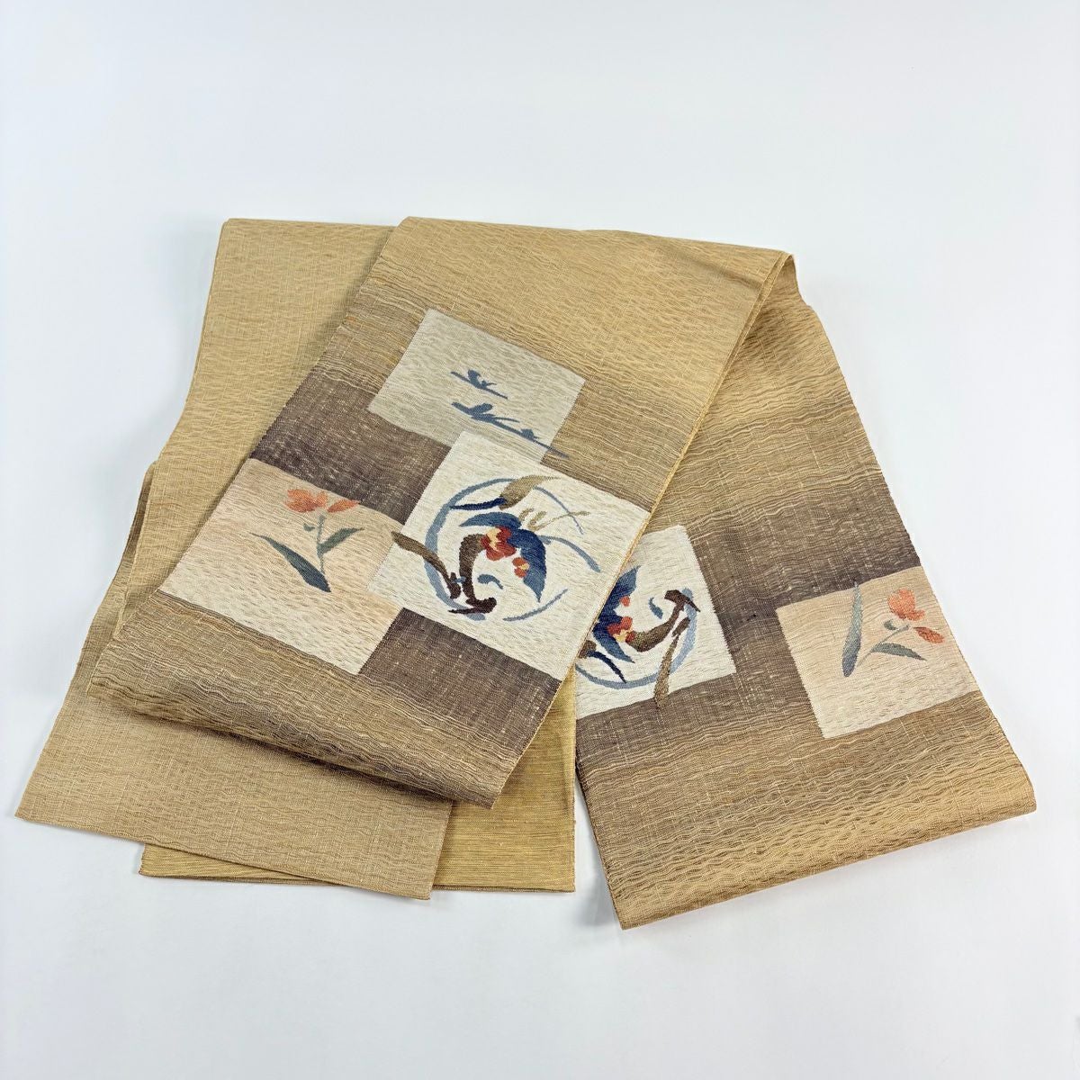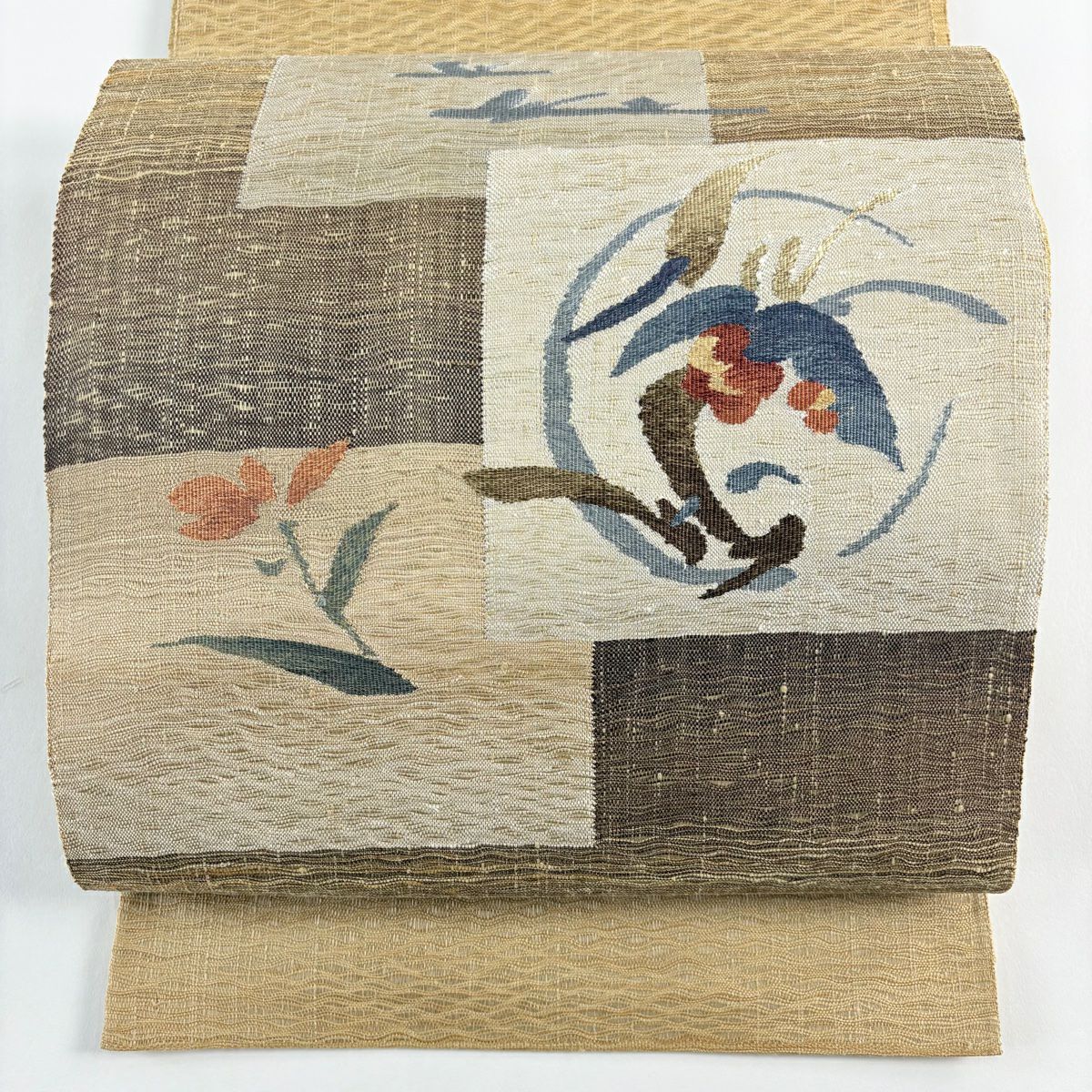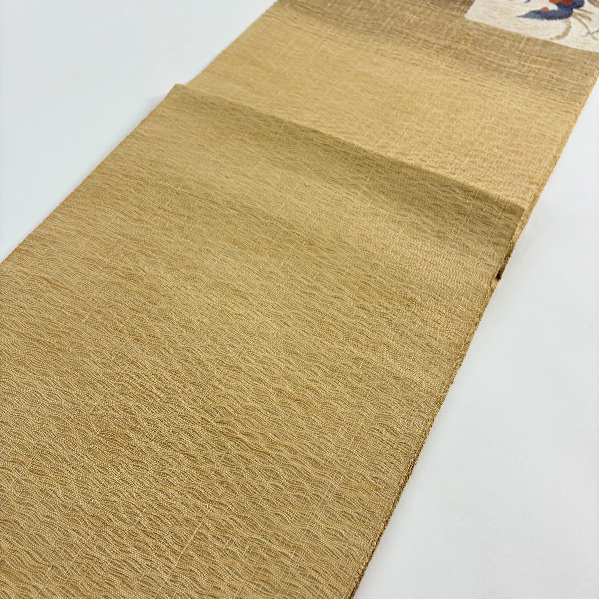 【在庫一掃】 袋帯 秀品 紬地 色紙 草花 山吹茶色 六通 正絹