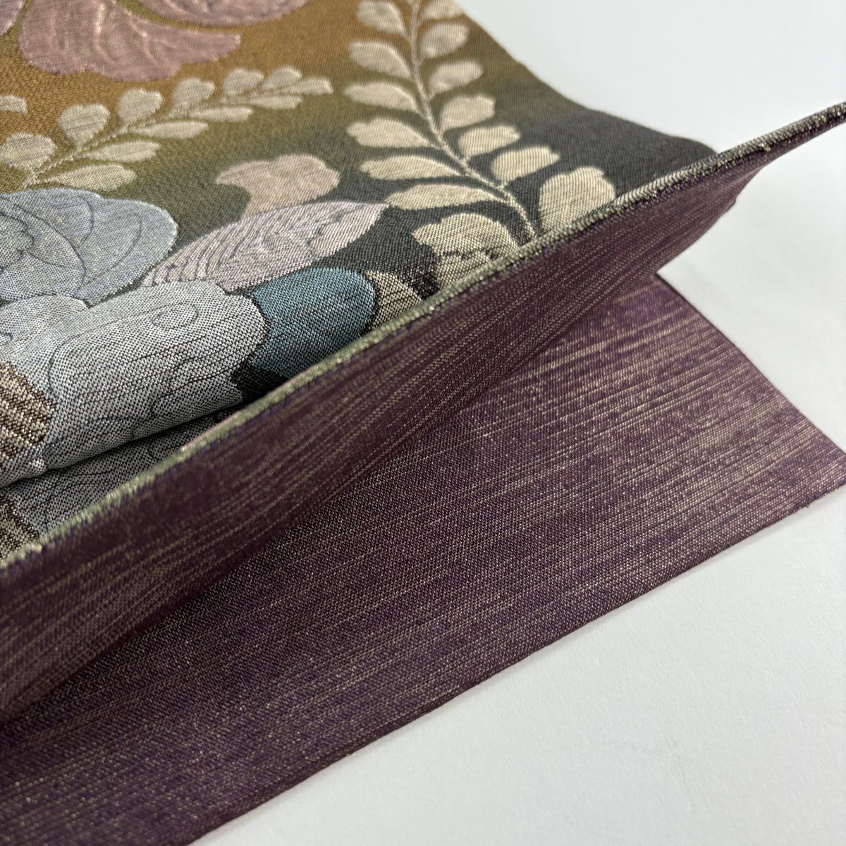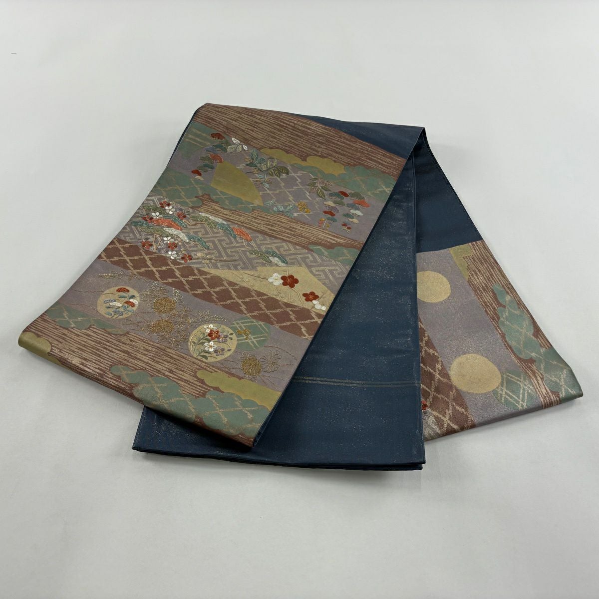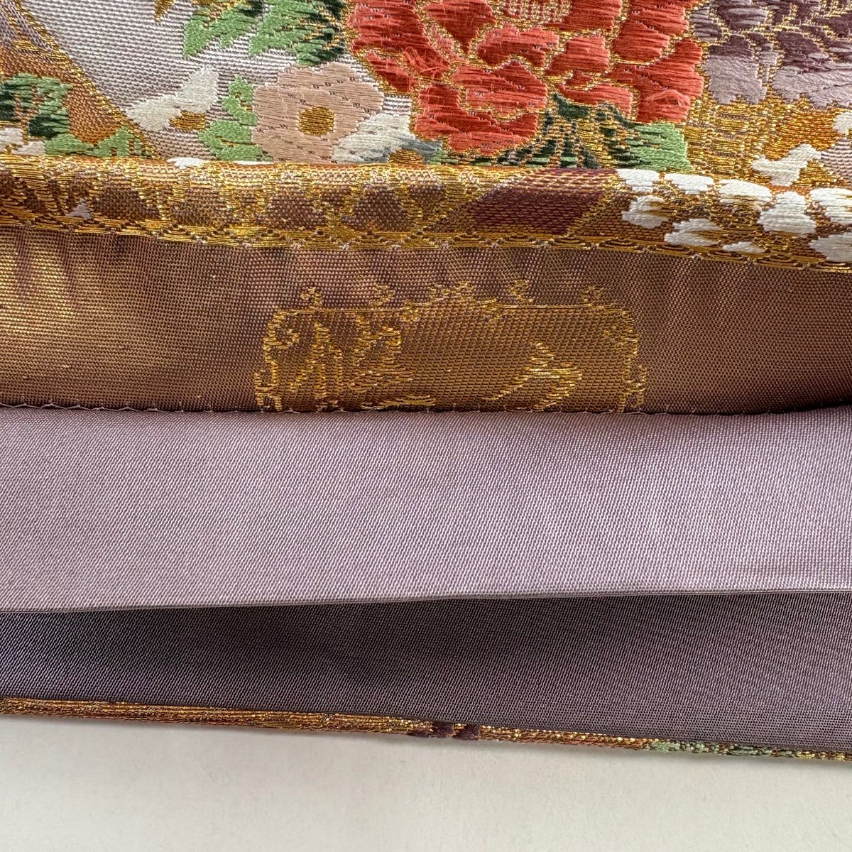 【在庫一掃】 袋帯 秀品 菖蒲 色紙 金彩 茶紫 お太鼓柄 正絹
