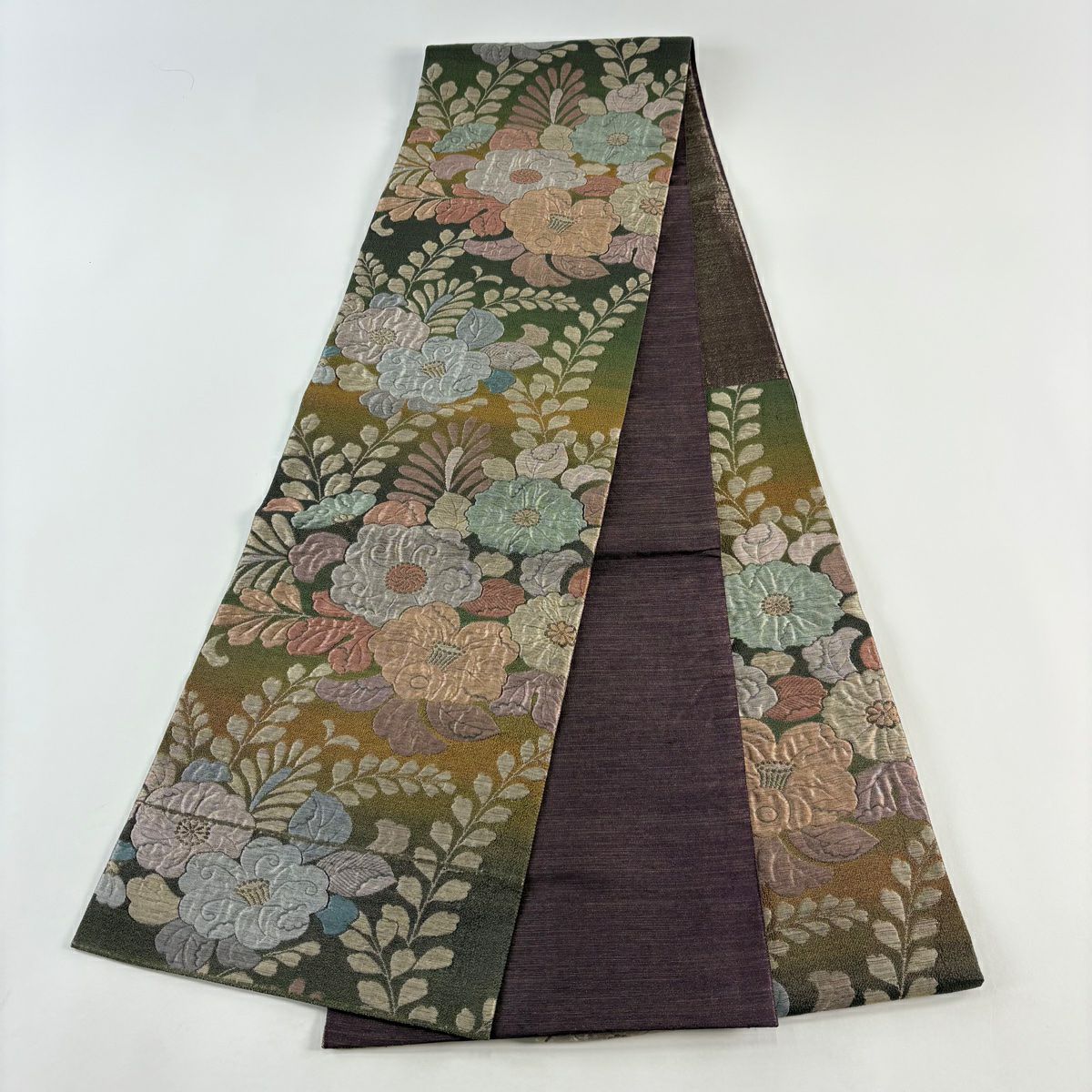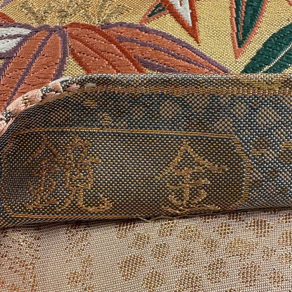【在庫一掃】 袋帯 秀品 草花 金糸 箔 黄土色 お太鼓柄 正絹