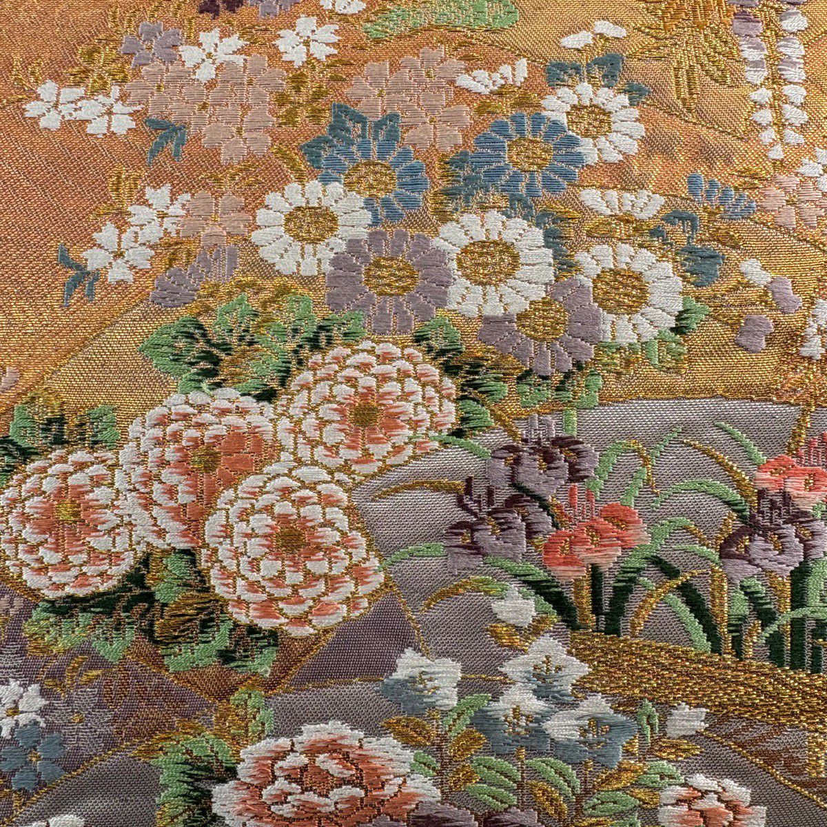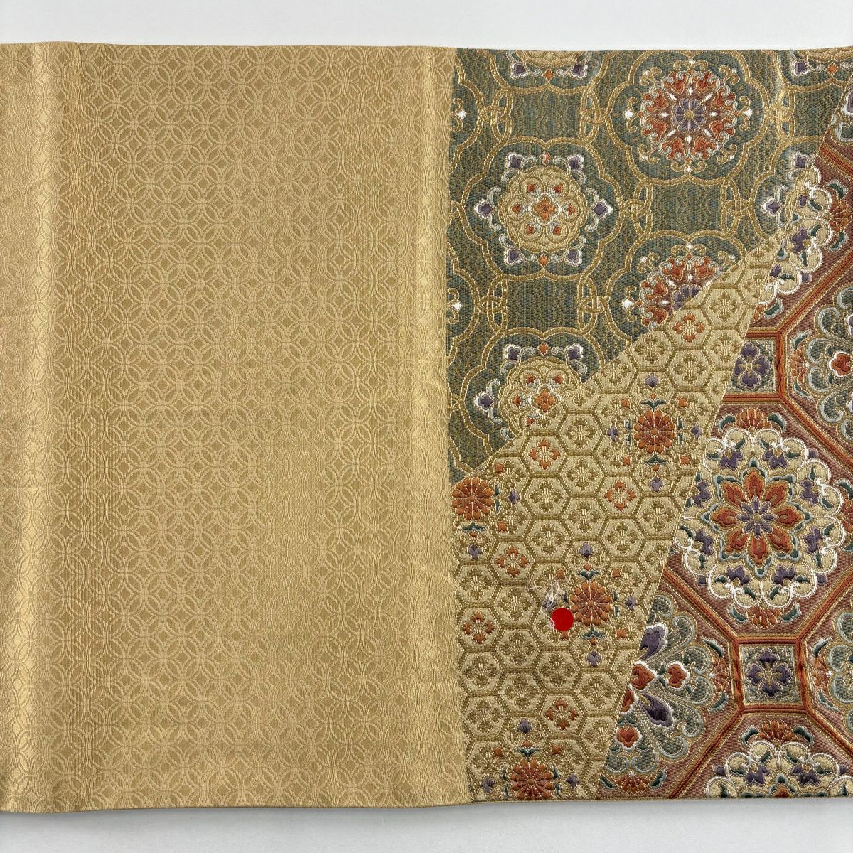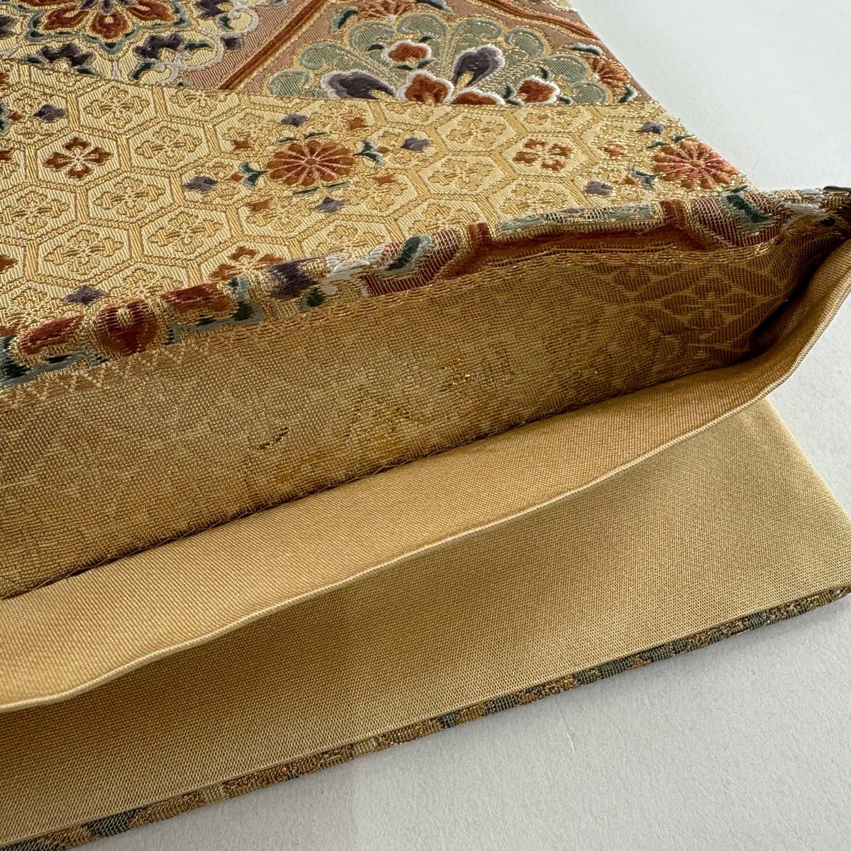 【美品】 袋帯 秀品 草花 幾何学模様 山吹茶色 お太鼓柄 正絹