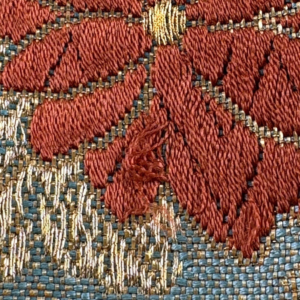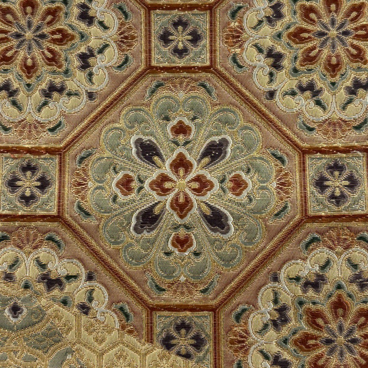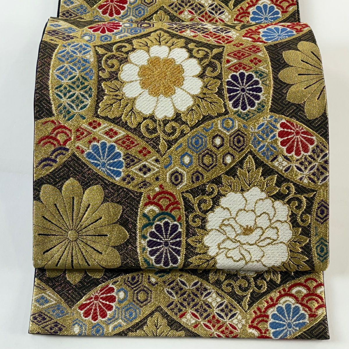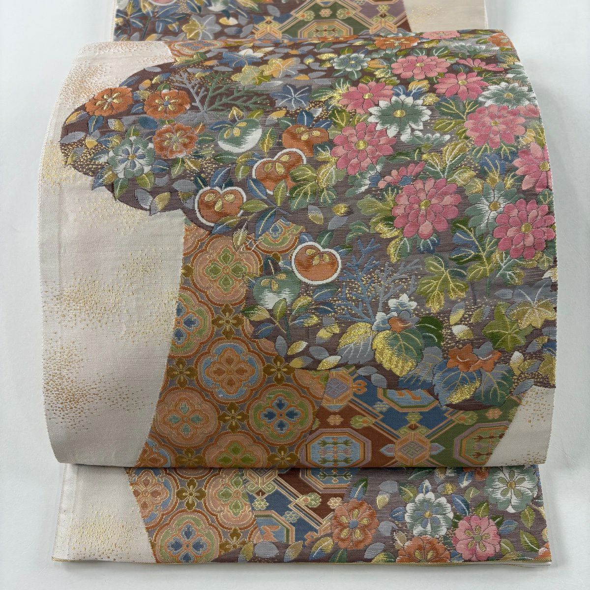 【美品】 袋帯 秀品 草花 幾何学模様 山吹茶色 お太鼓柄 正絹