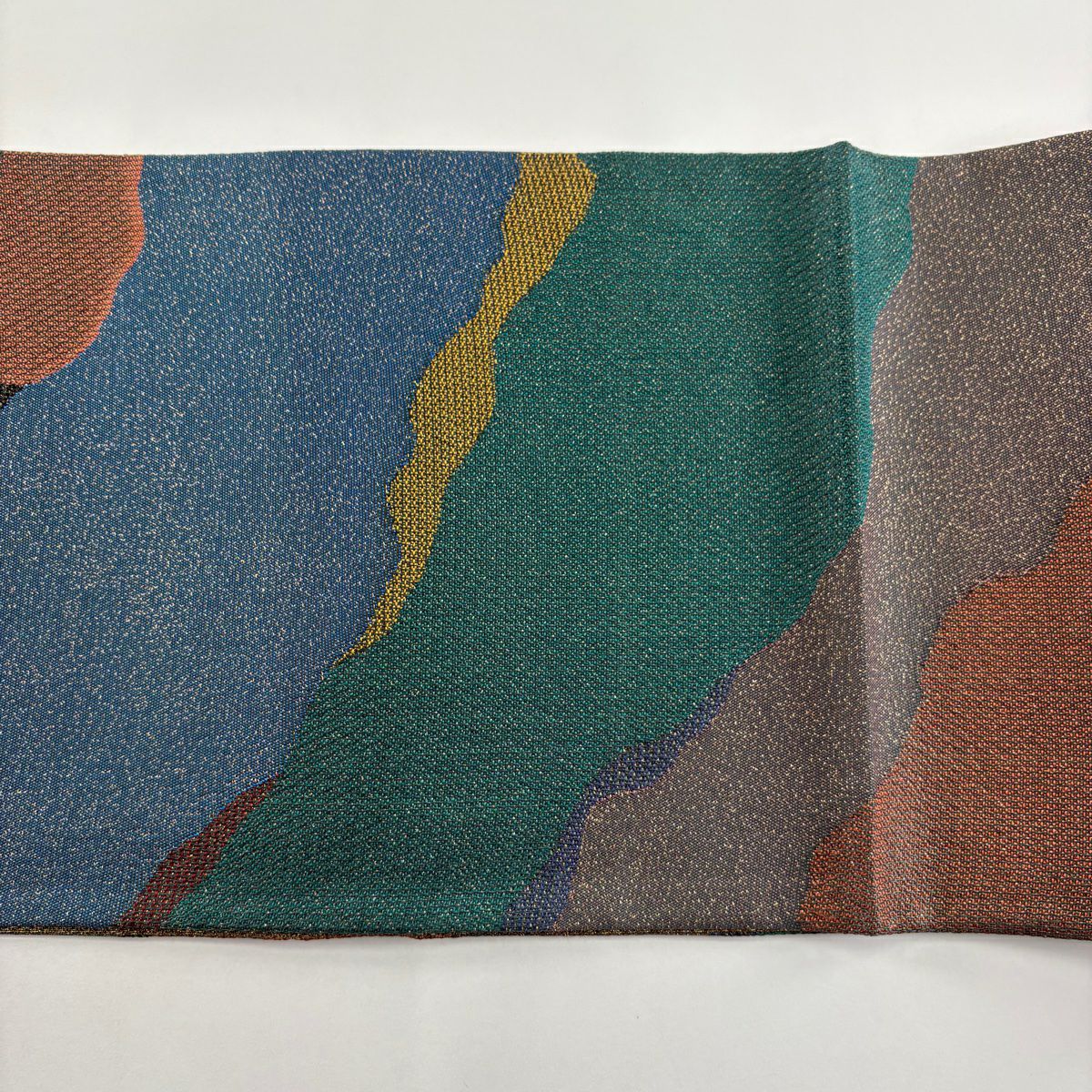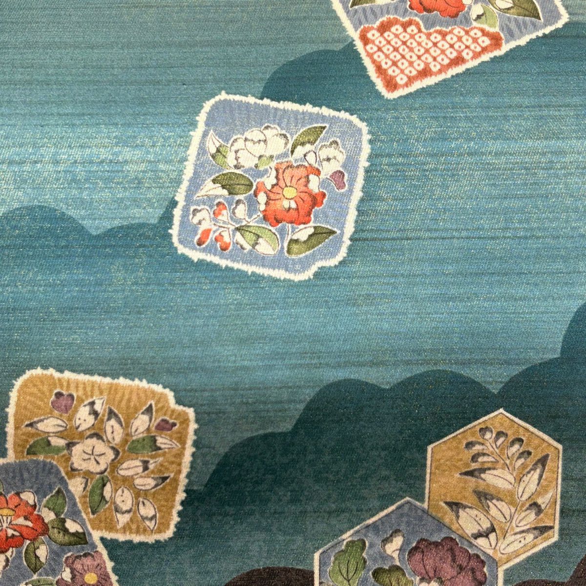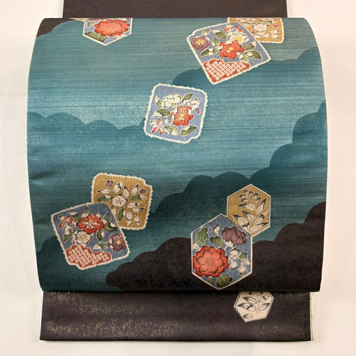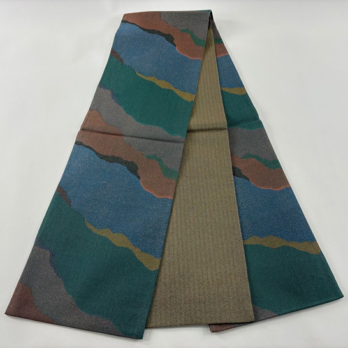 【美品】 袋帯 秀品 霞 幾何学模様 箔 金糸 青緑 全通 正絹