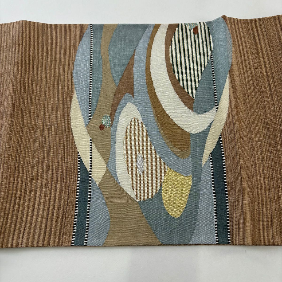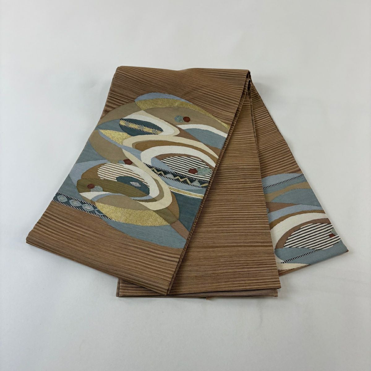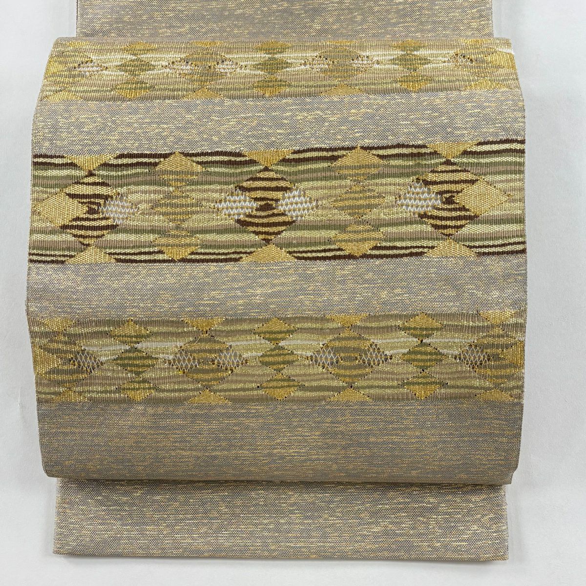 【美品】 袋帯 秀品 幾何学模様 金銀糸 薄茶色 お太鼓柄 正絹