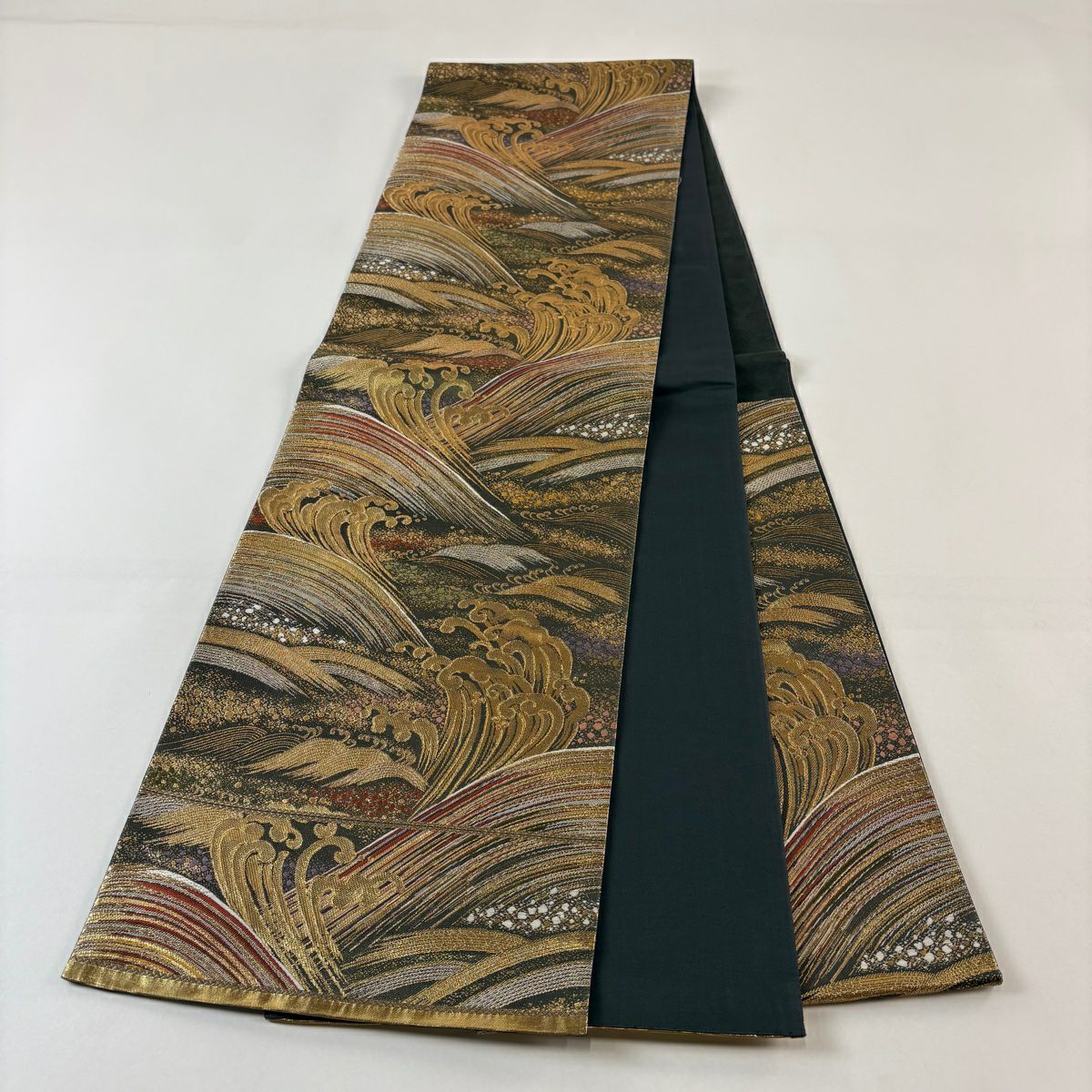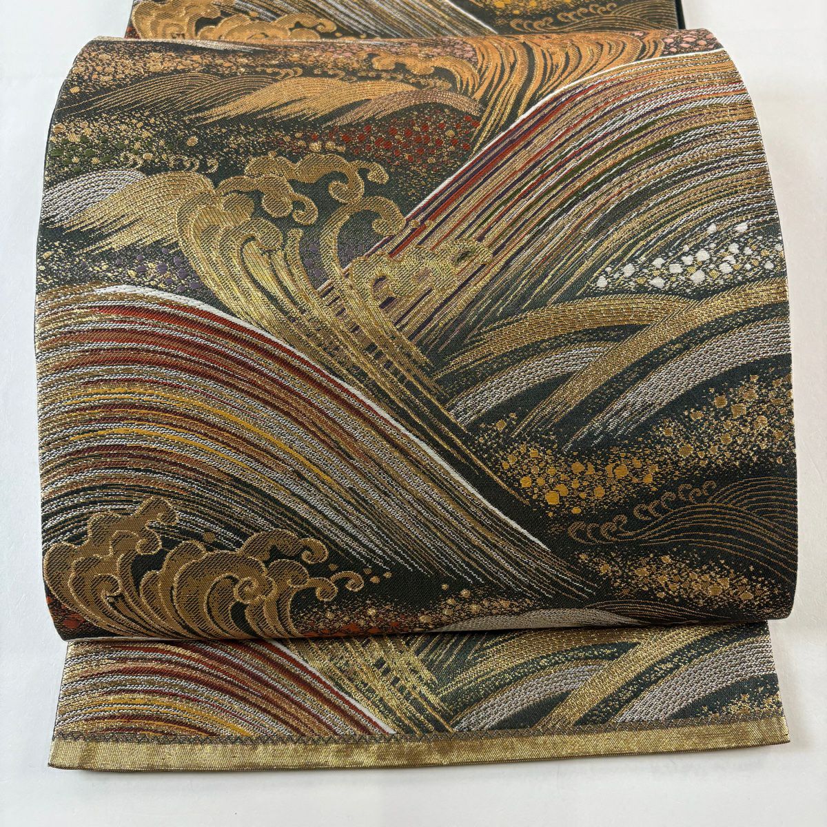 袋帯 秀品 関西仕立て 波頭 箔散らし 金糸 箔 深緑 六通 正絹