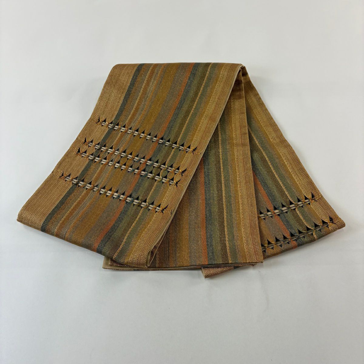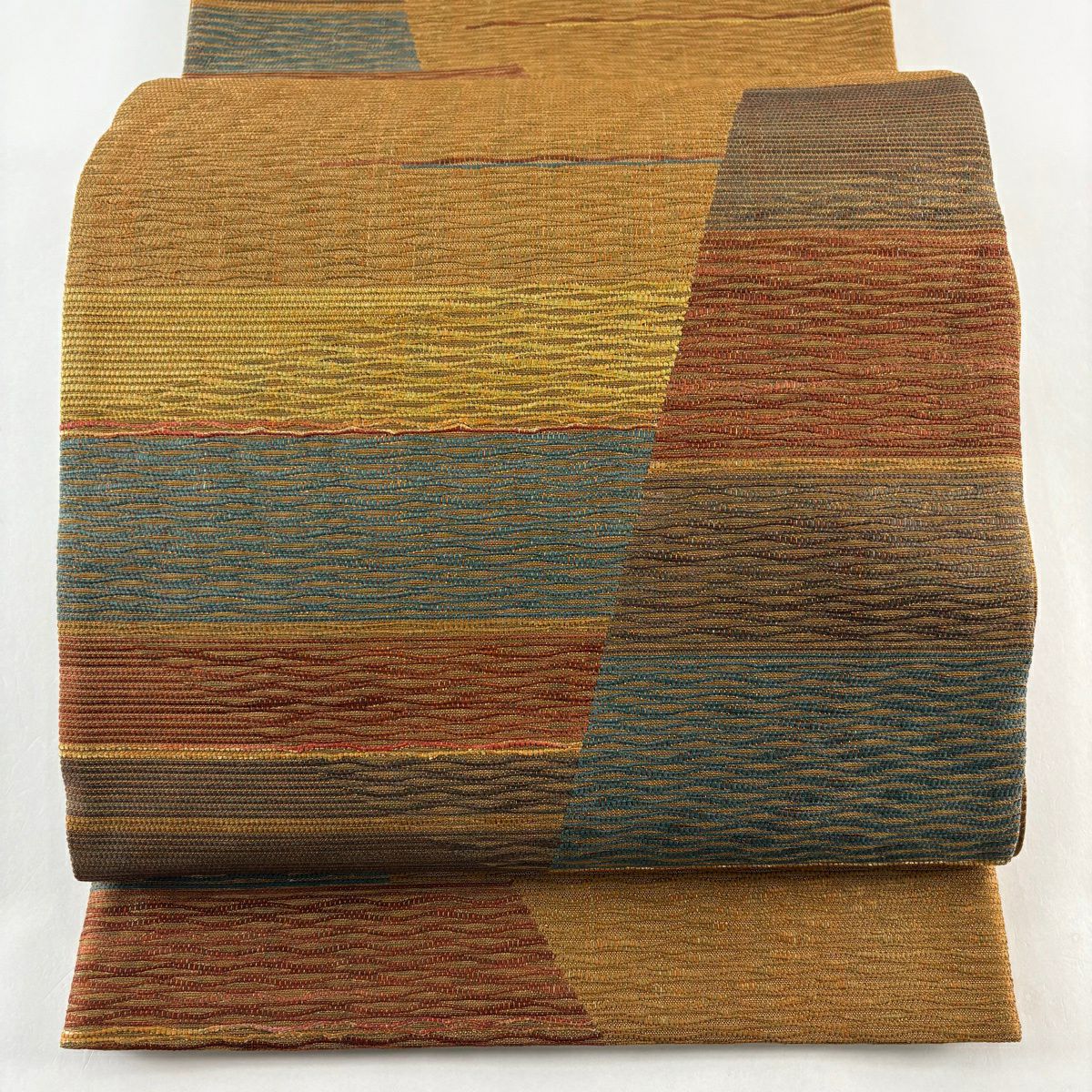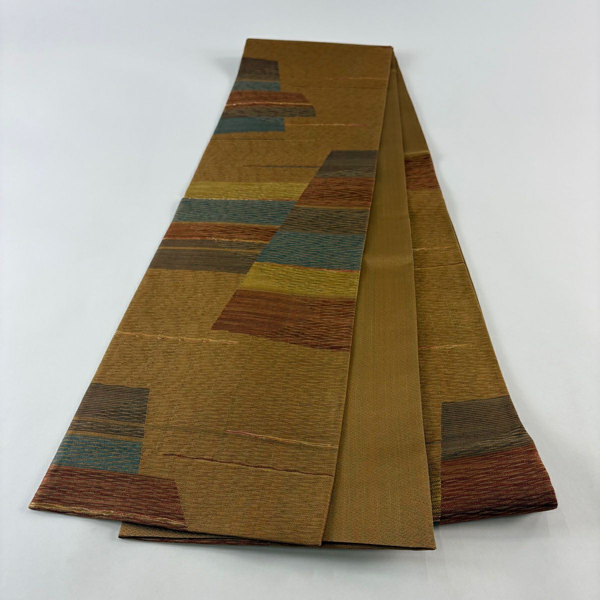 【美品】 袋帯 秀品 縞 幾何学 金糸 山吹茶色 お太鼓柄 正絹