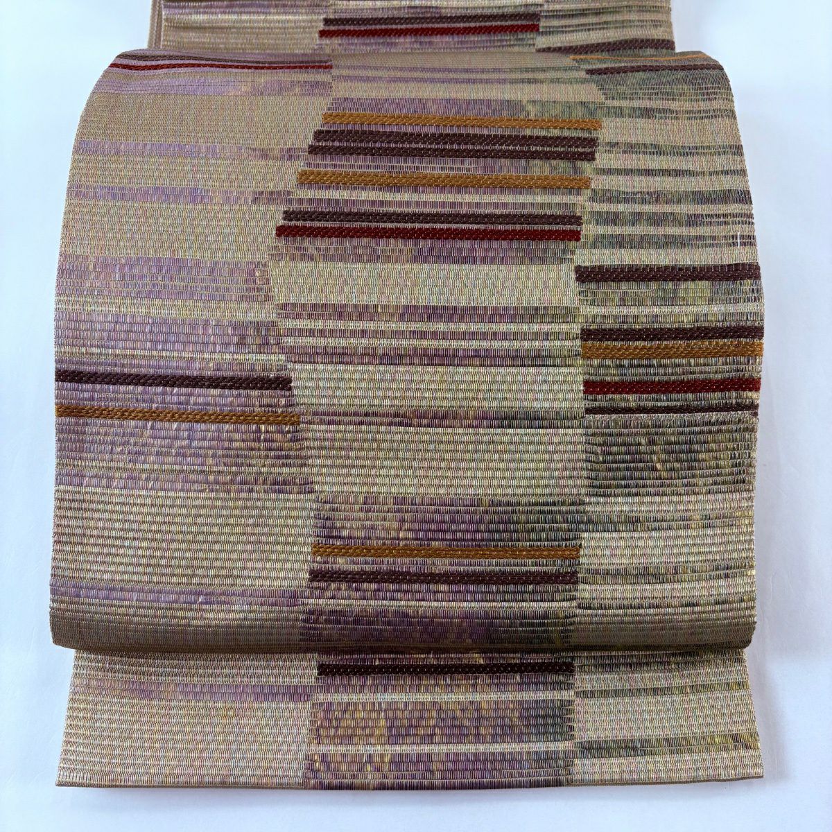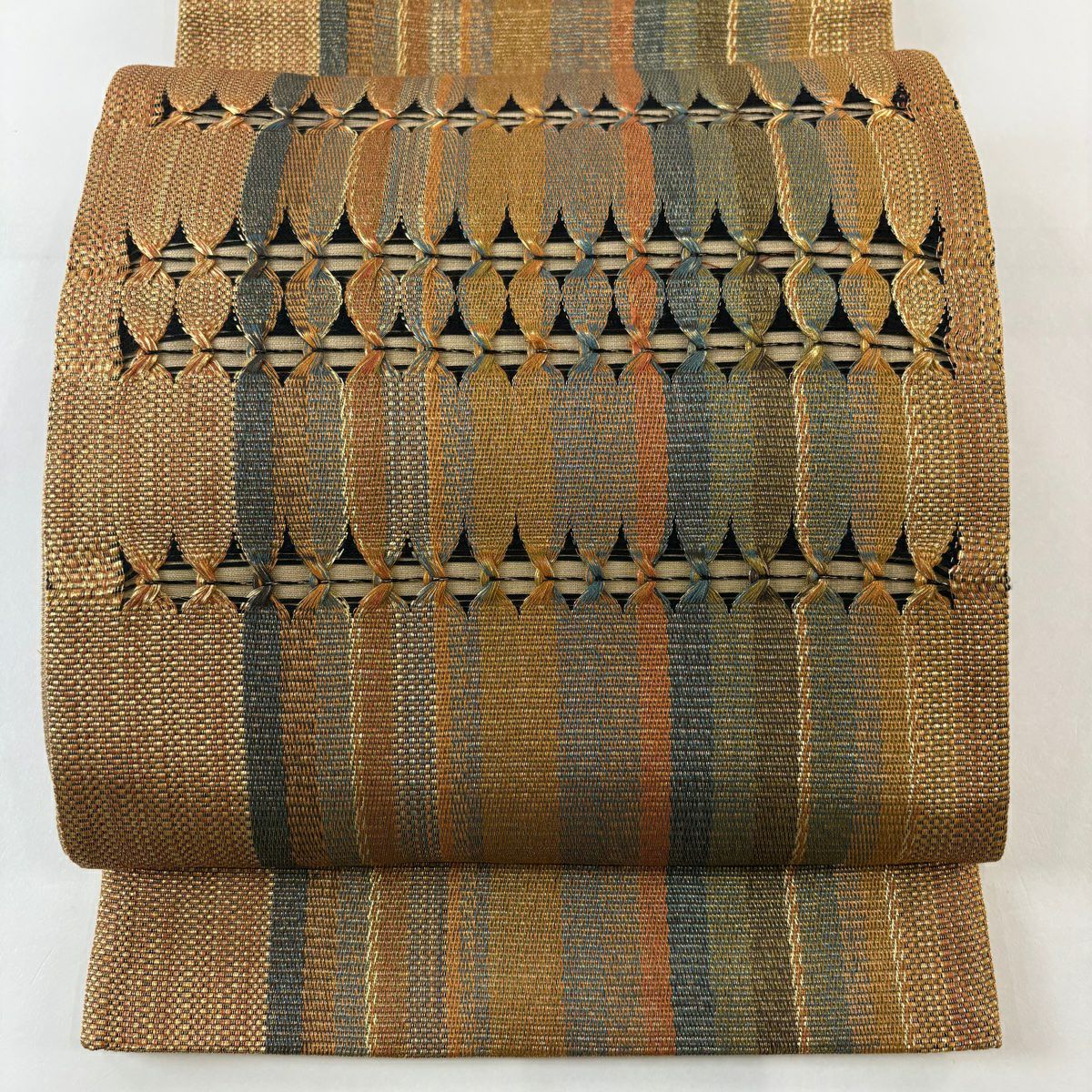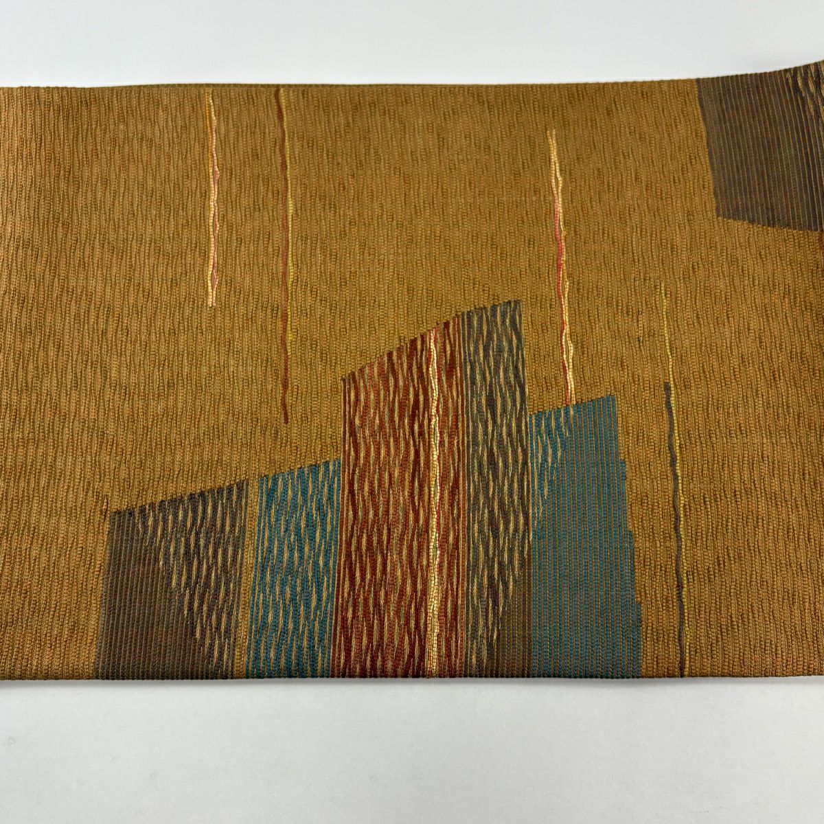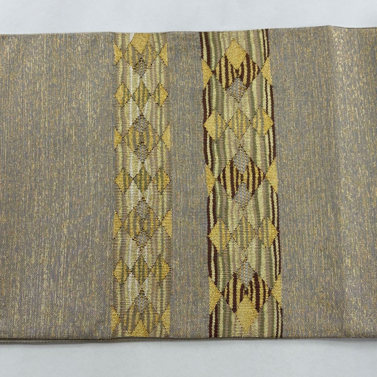 【美品】 袋帯 秀品 縞 幾何学 金糸 山吹茶色 お太鼓柄 正絹