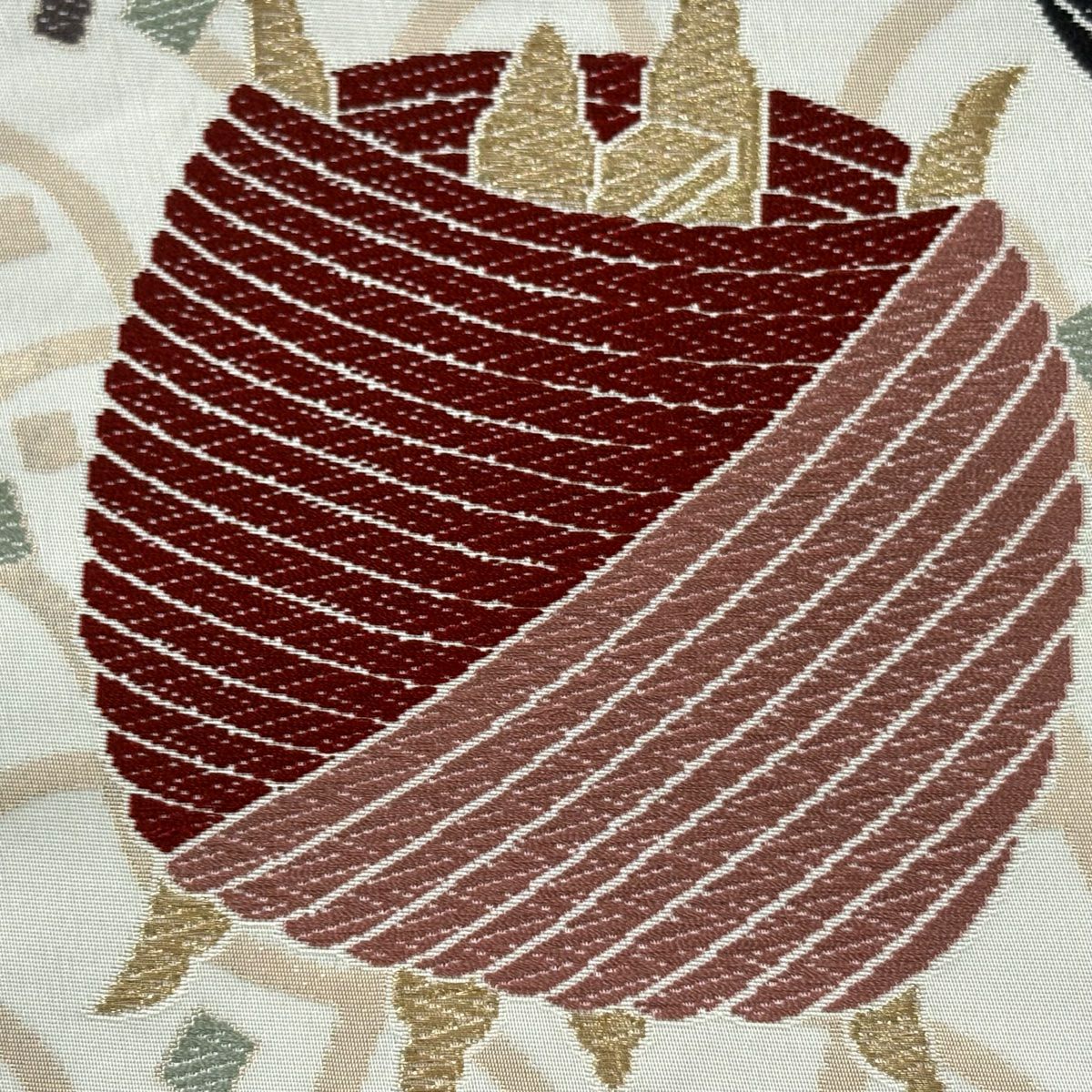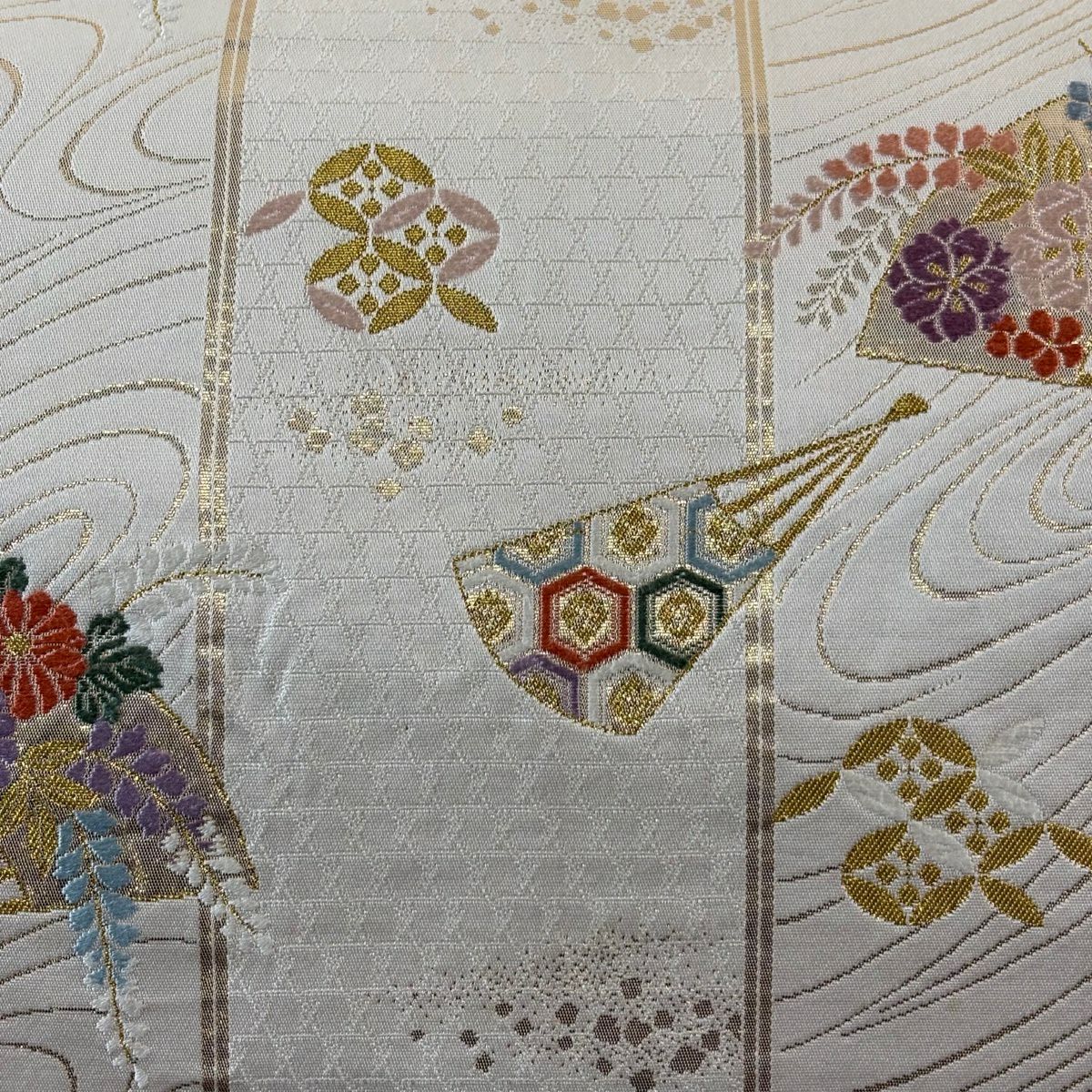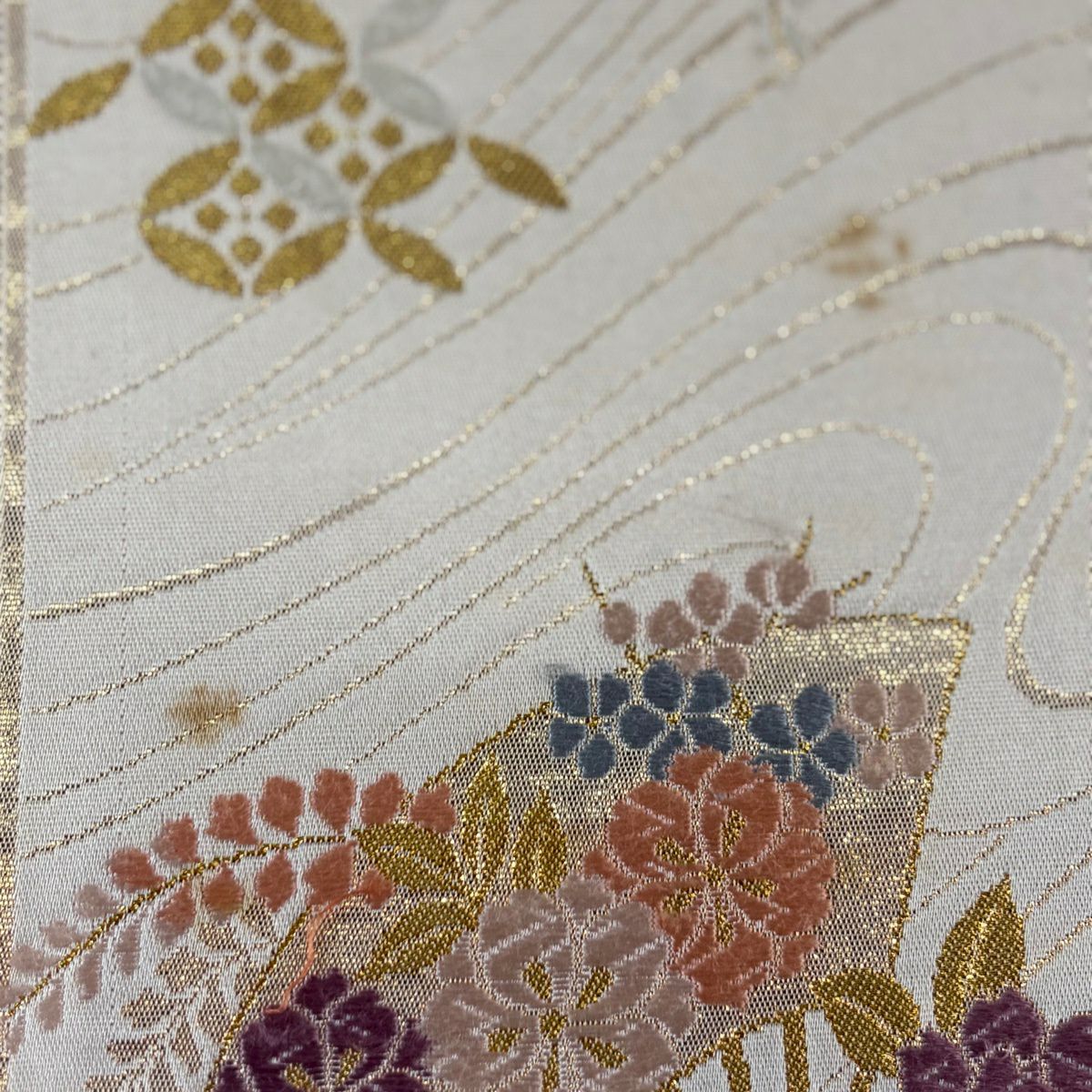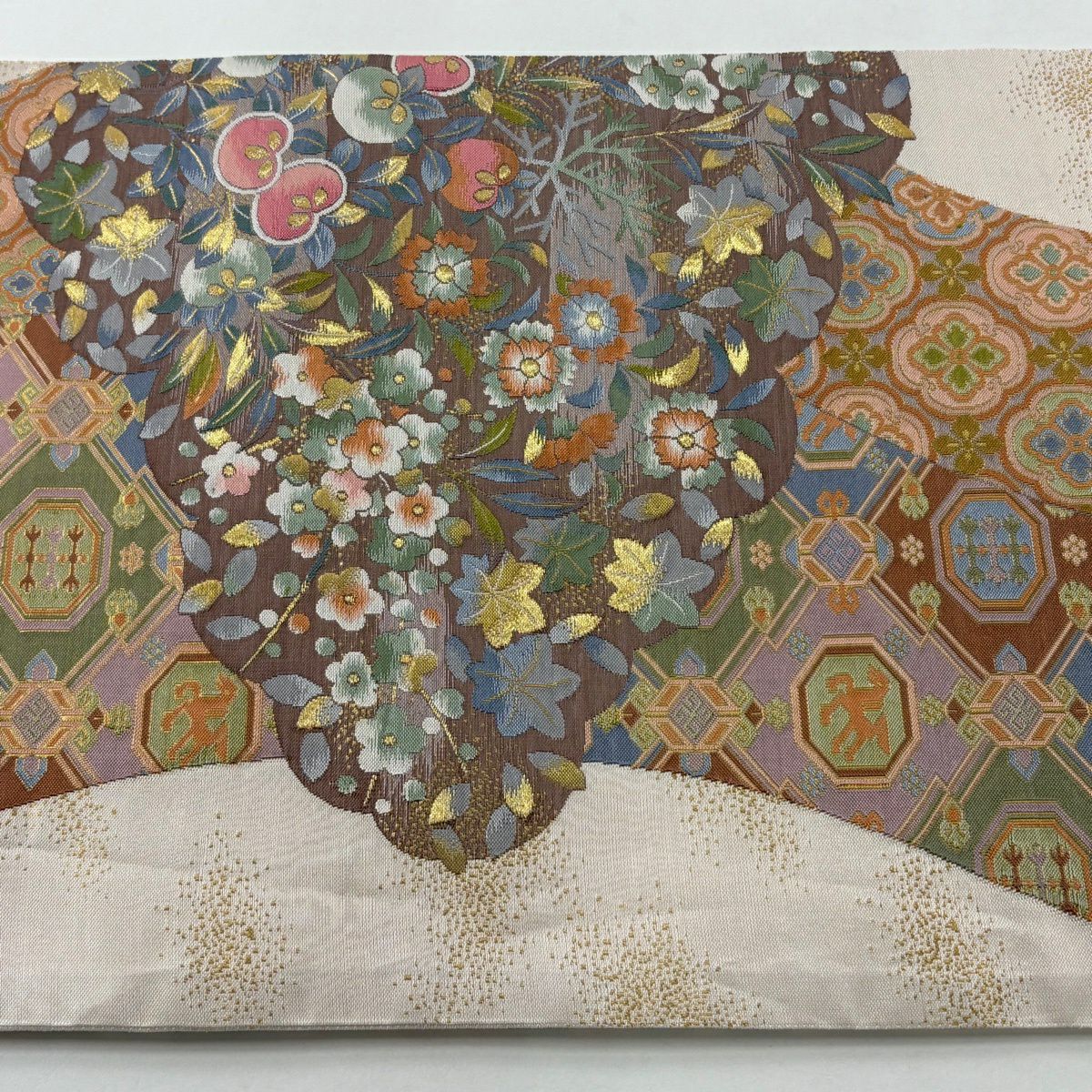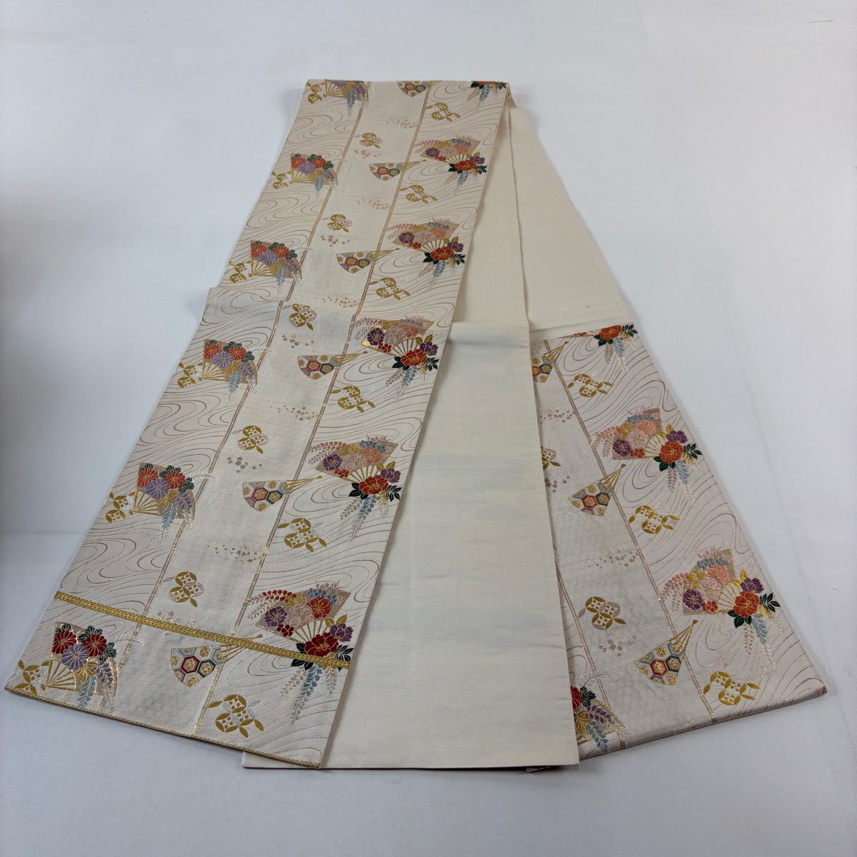 袋帯 秀品 糸巻き 箔散らし柄 金糸 唐織 クリーム 六通 正絹