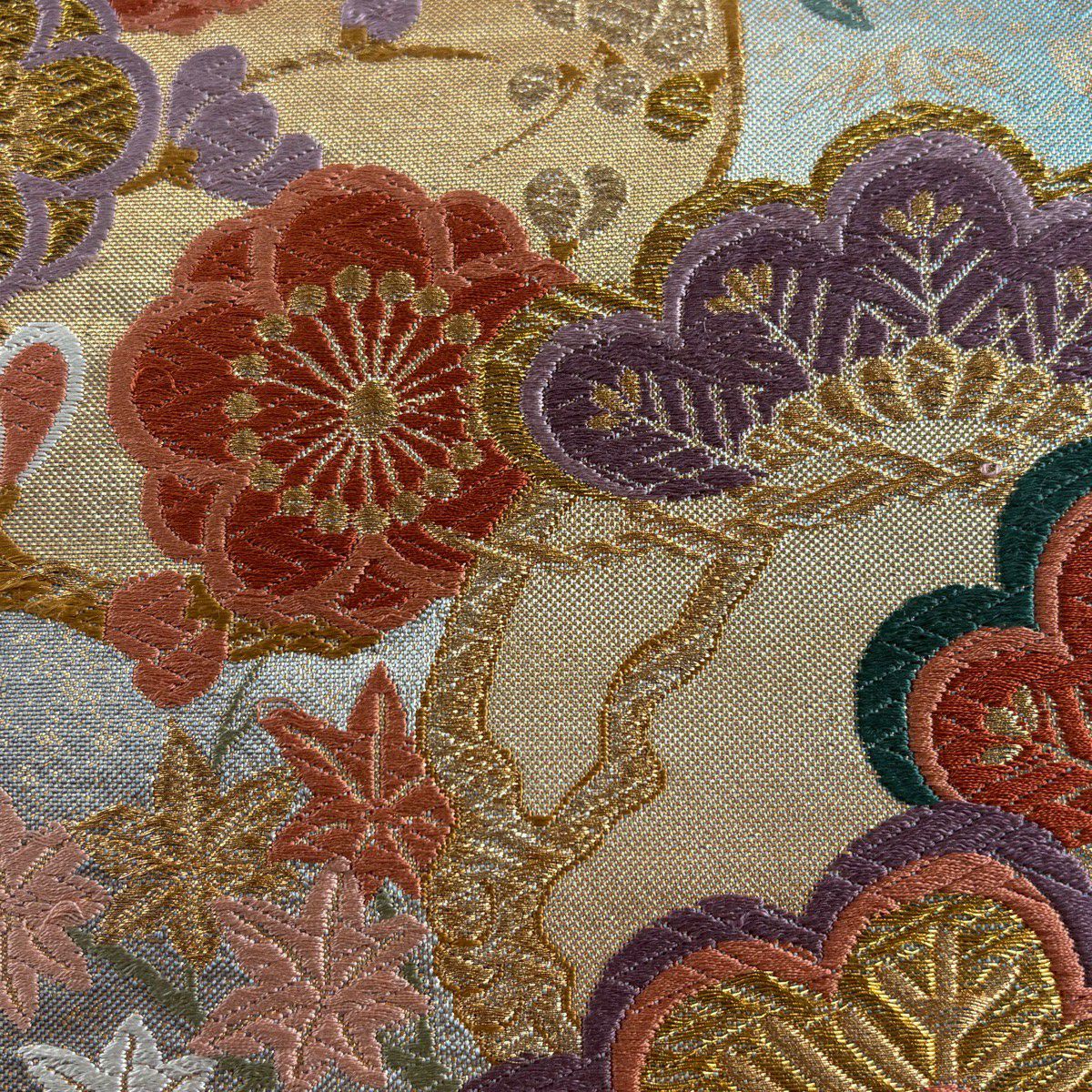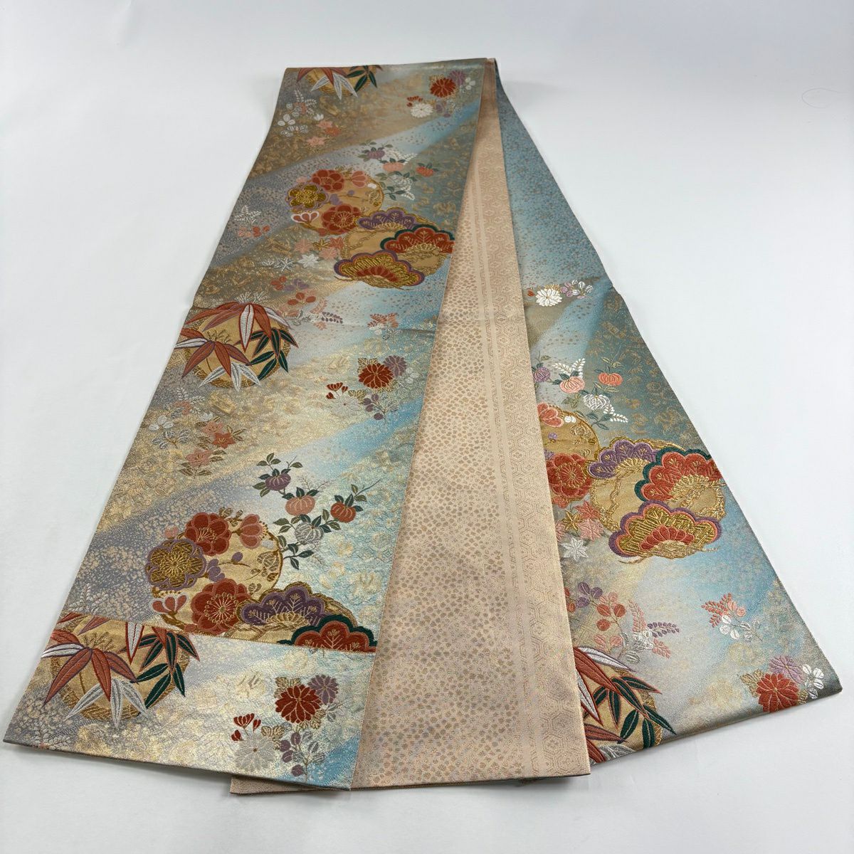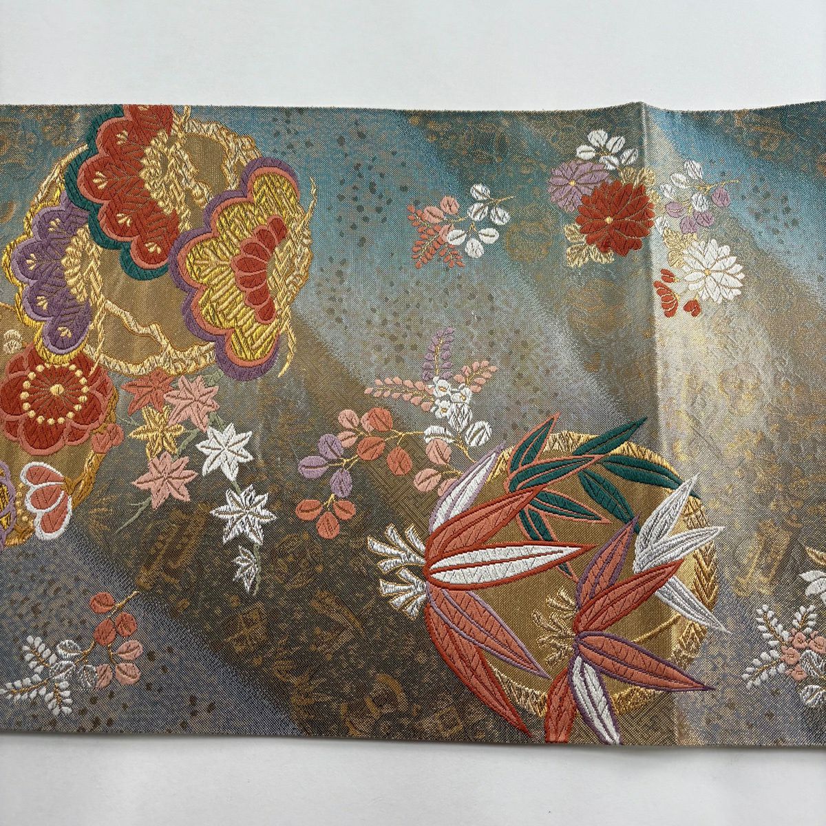 【美品】 袋帯 秀品 振袖向き 草花 金銀糸 箔 金色 六通 正絹