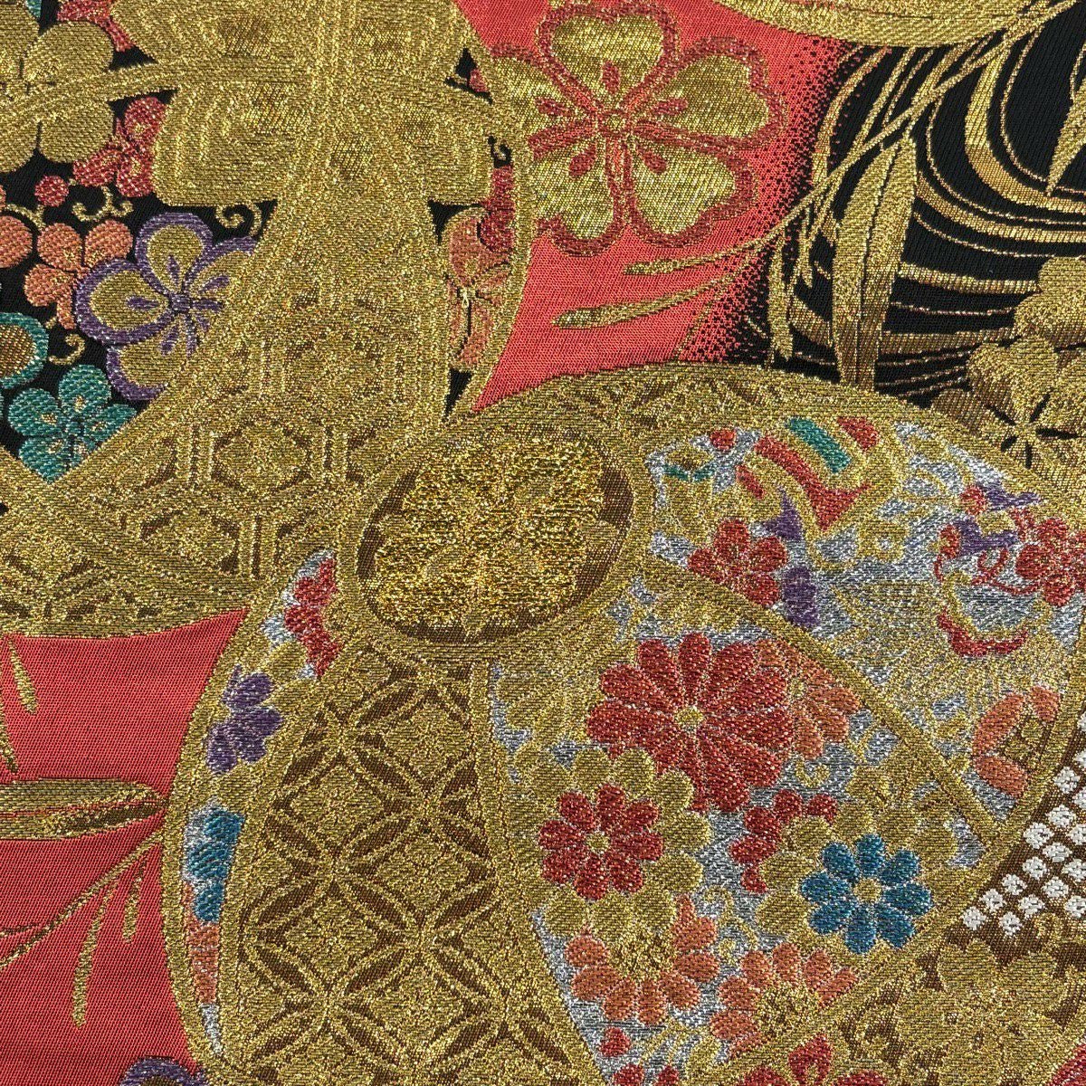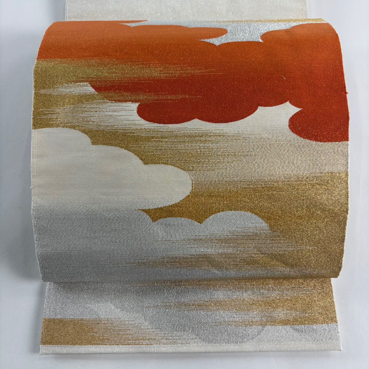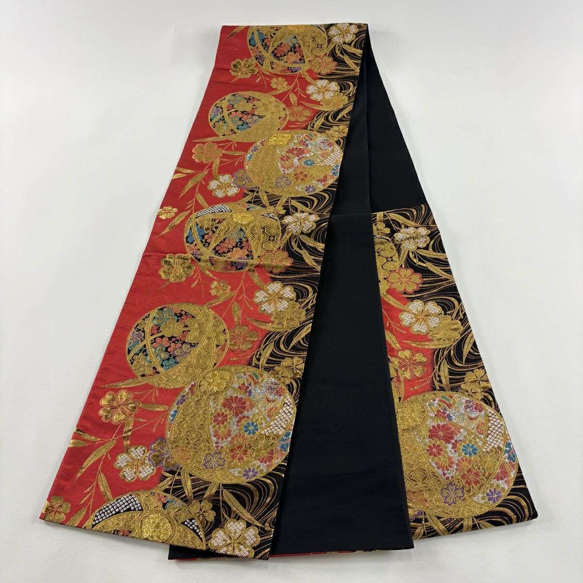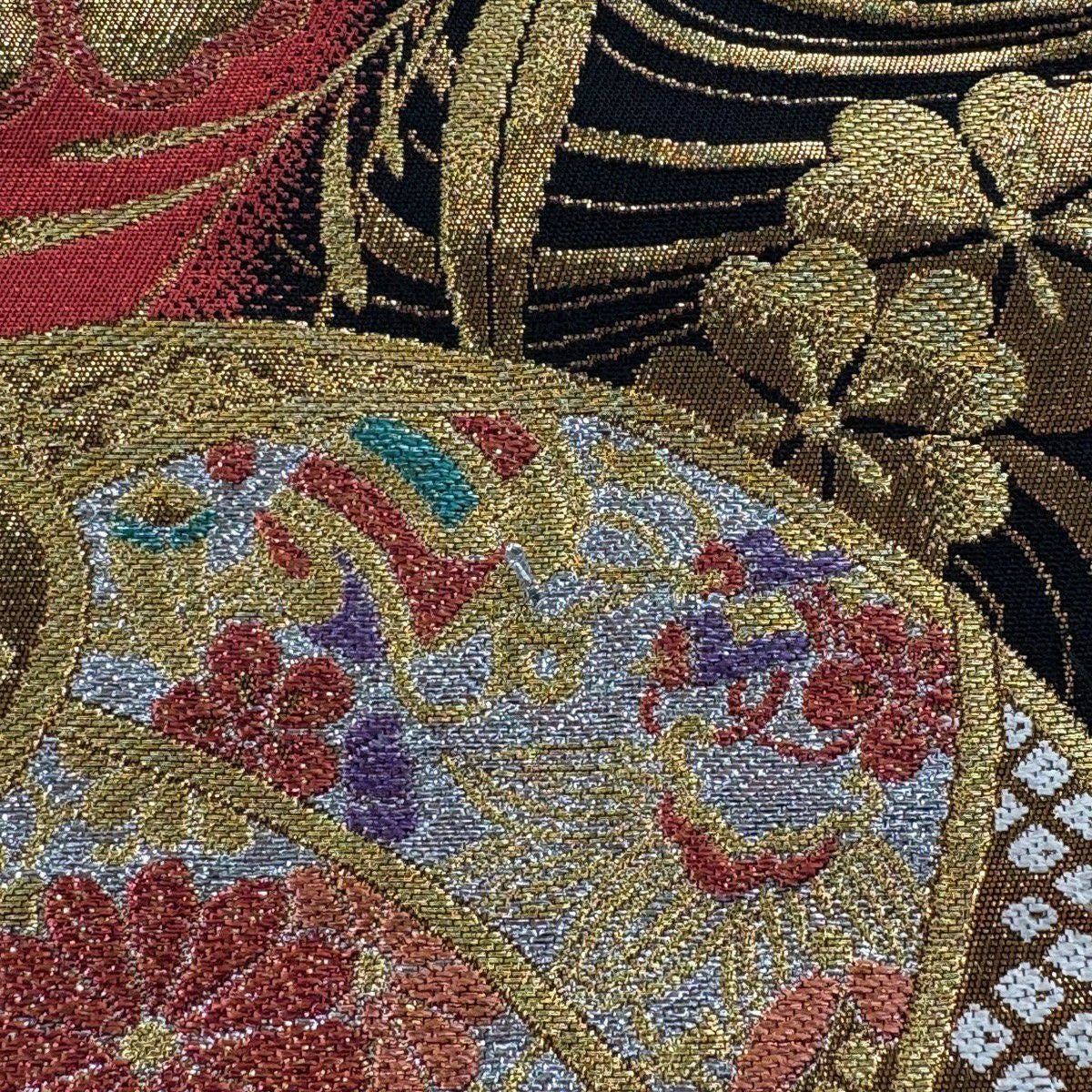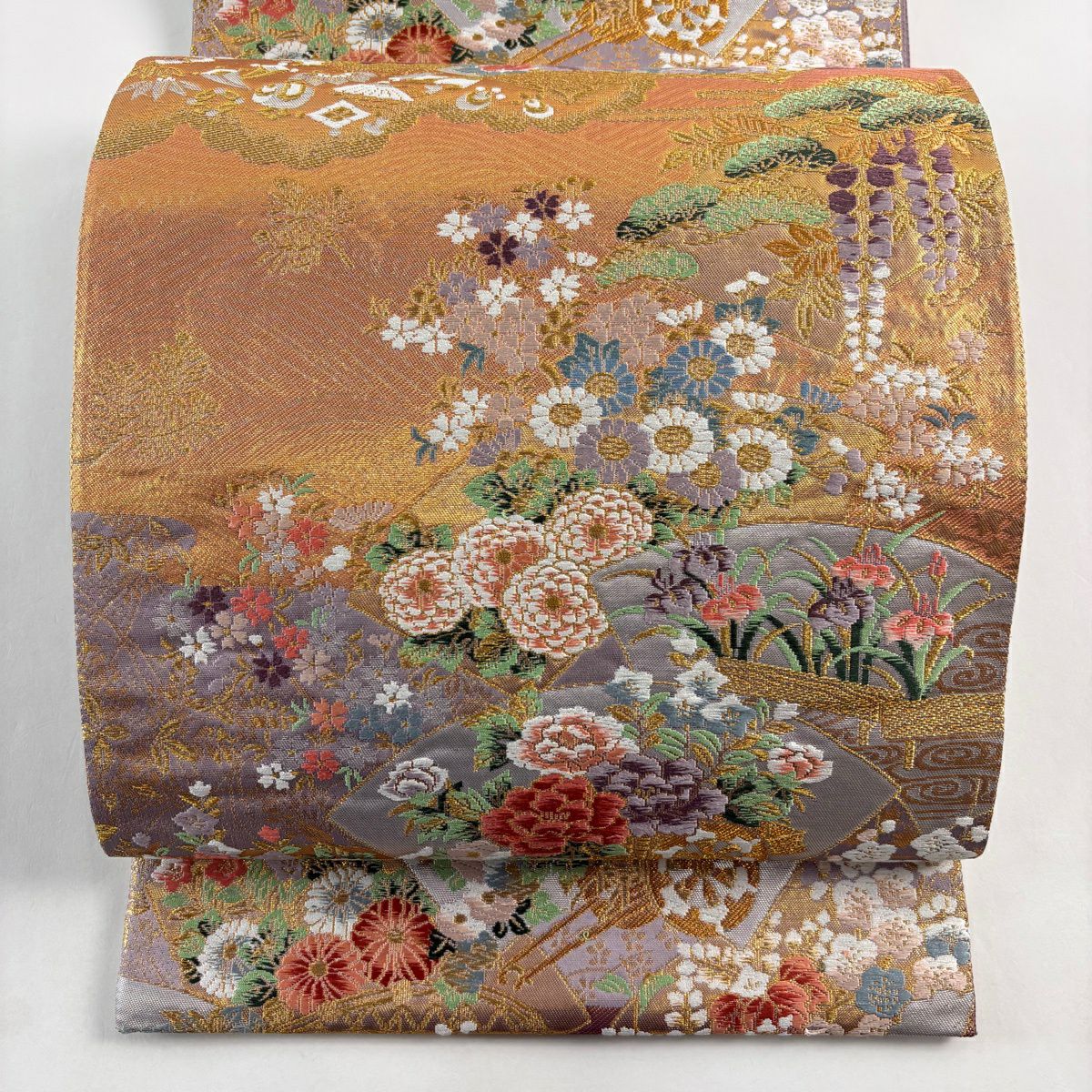 【在庫一掃】 袋帯 秀品 桜 桧扇 金銀糸 箔 赤茶 六通 正絹