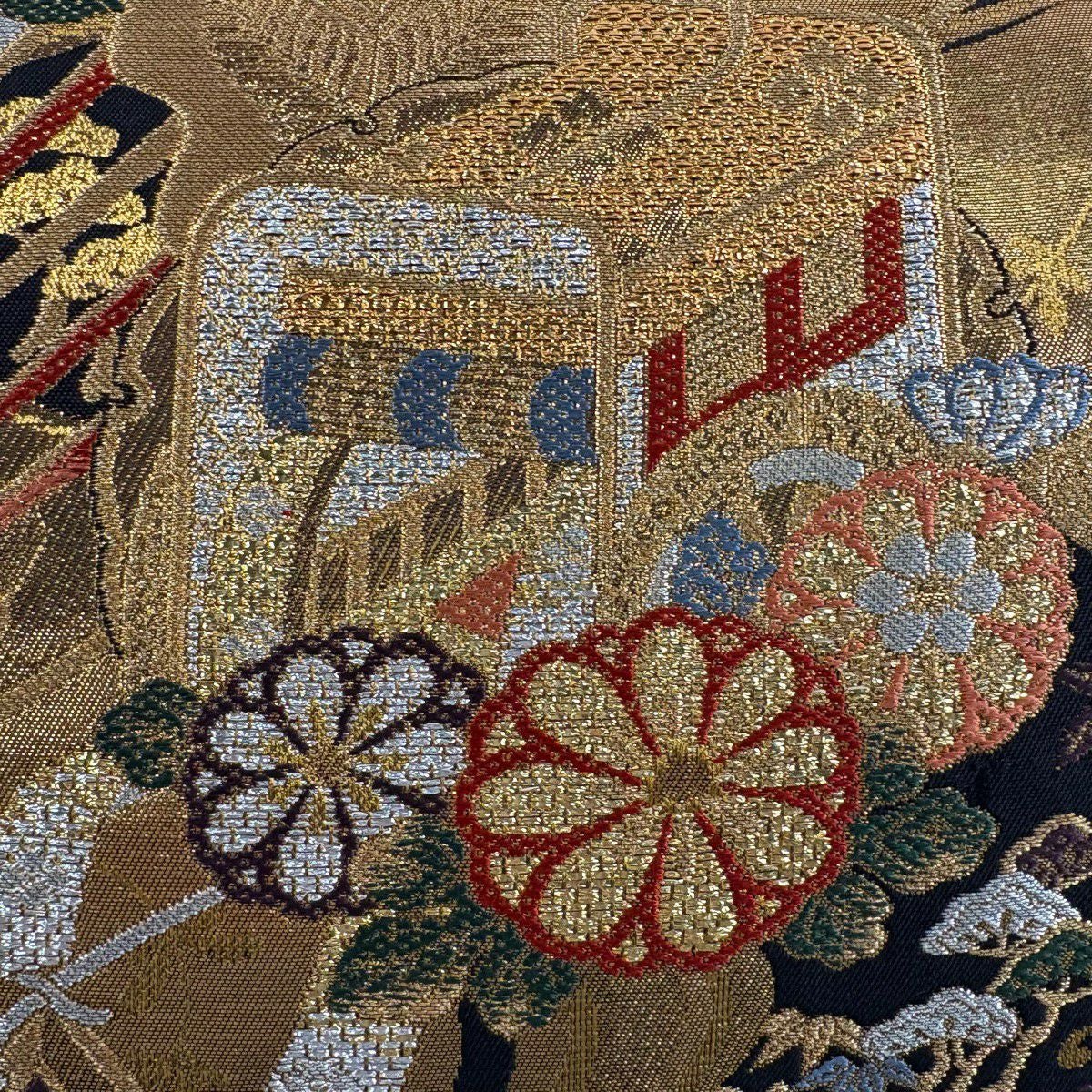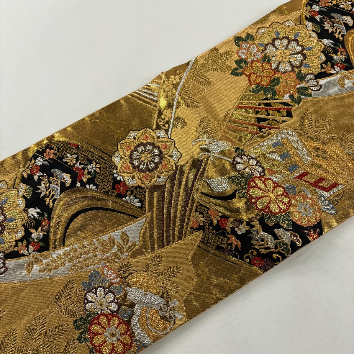 【美品】 袋帯 秀品 束ね熨斗 花唐草 金糸 箔 金色 全通 正絹