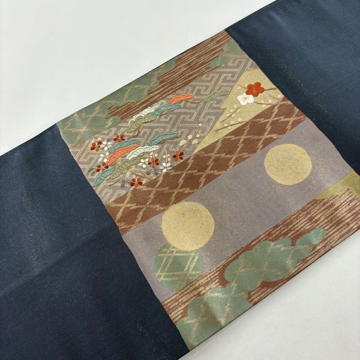 【美品】 袋帯 秀品 笠松 格天井 金銀糸 箔 黒灰 六通 正絹