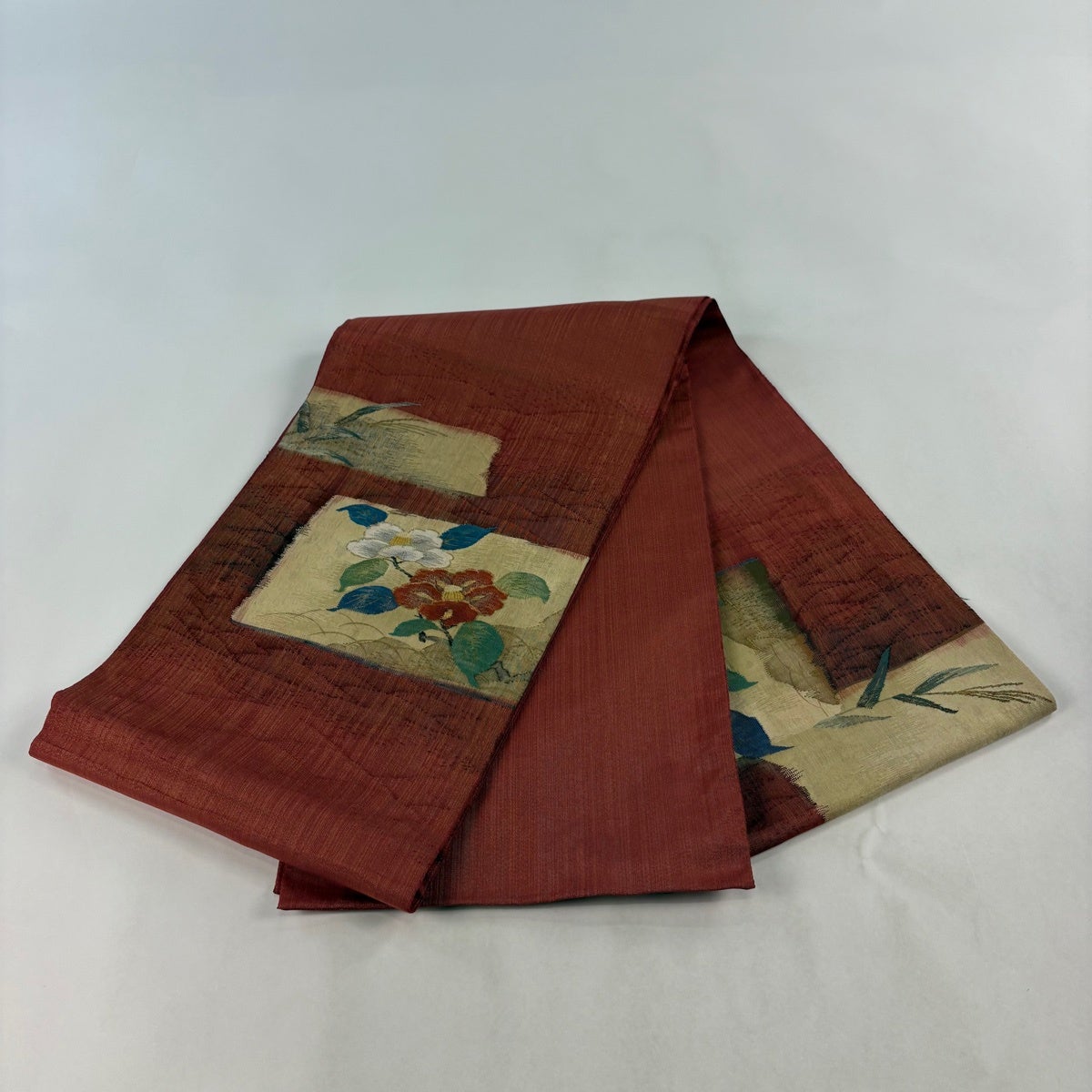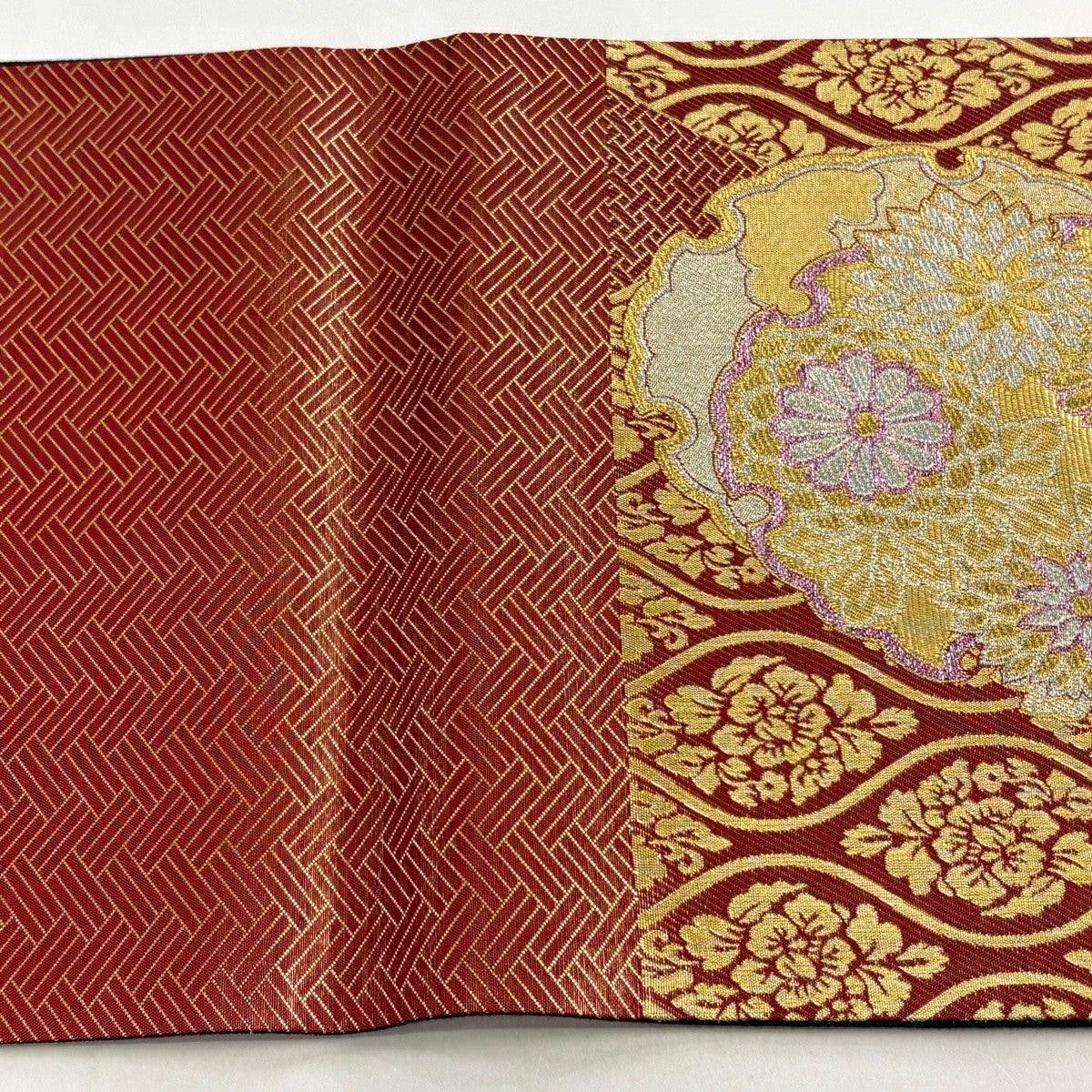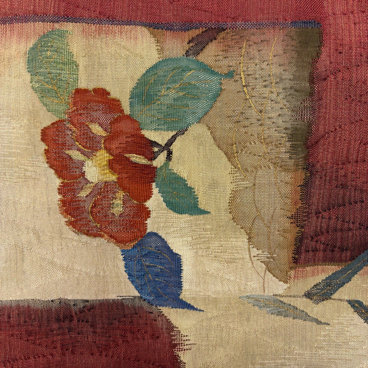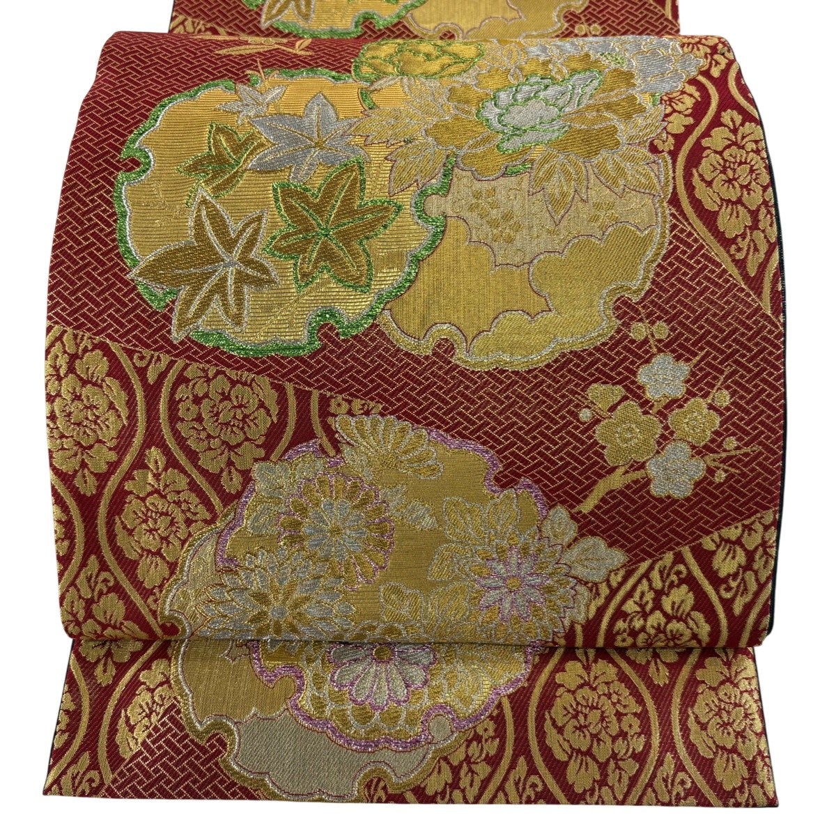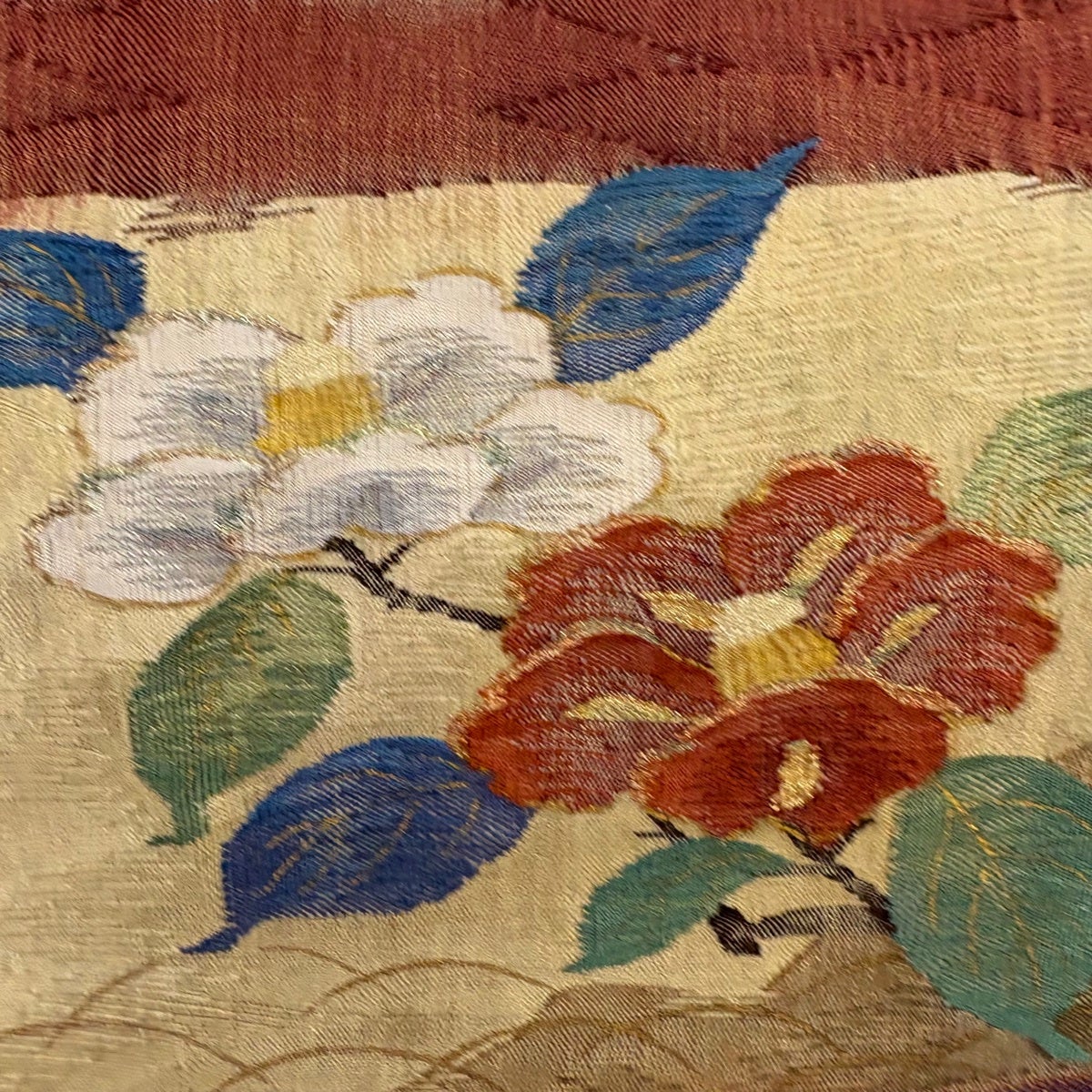 【美品】 袋帯 秀品 椿 ススキ 金糸 金通し 茜色 お太鼓柄 正絹
