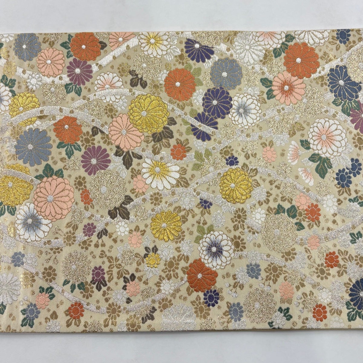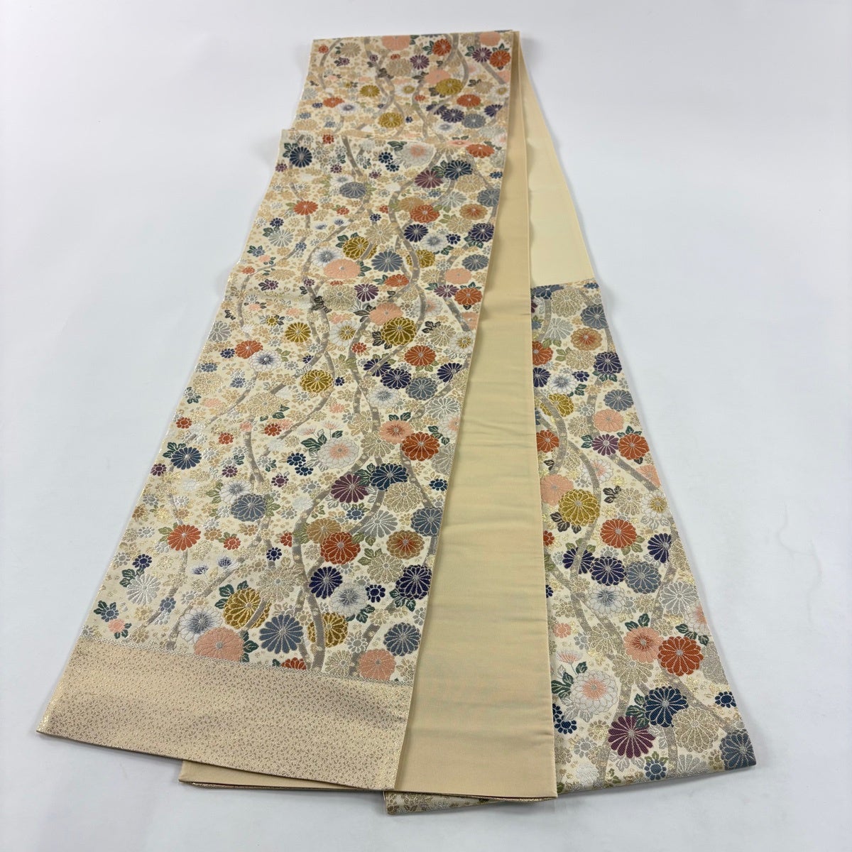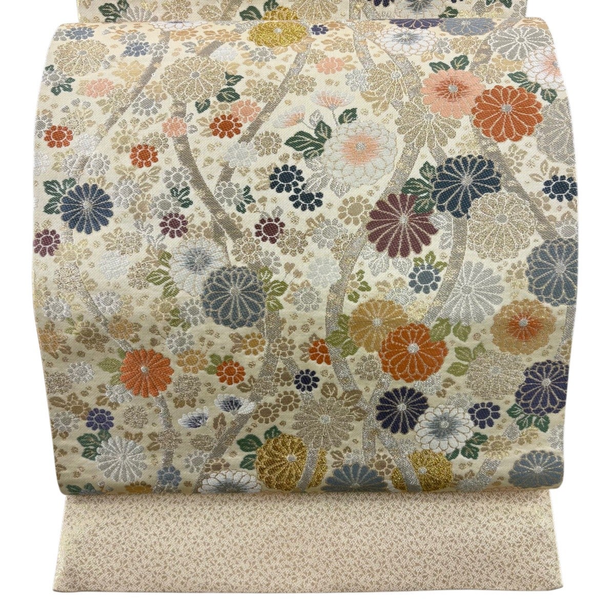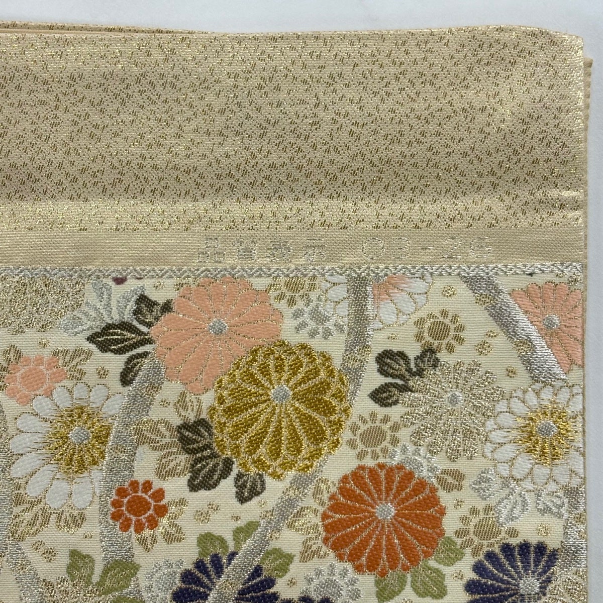 【美品】 袋帯 秀品 菊 立涌 金銀糸 刺繍 クリーム 六通 正絹