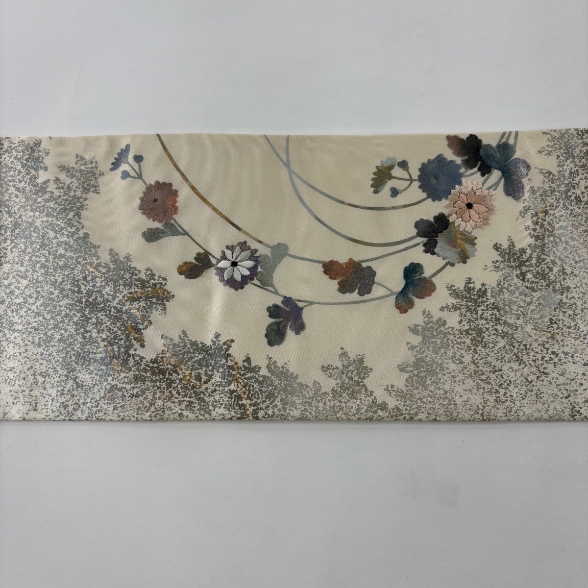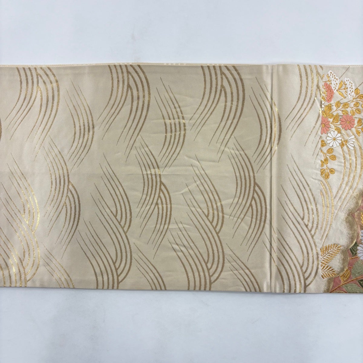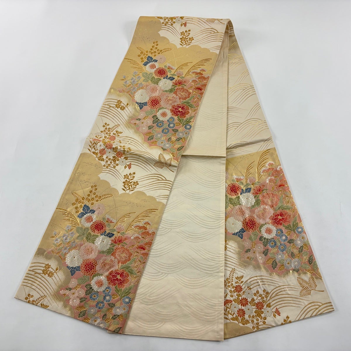 【美品】 袋帯 秀品 菊 立涌 金銀糸 刺繍 クリーム 六通 正絹