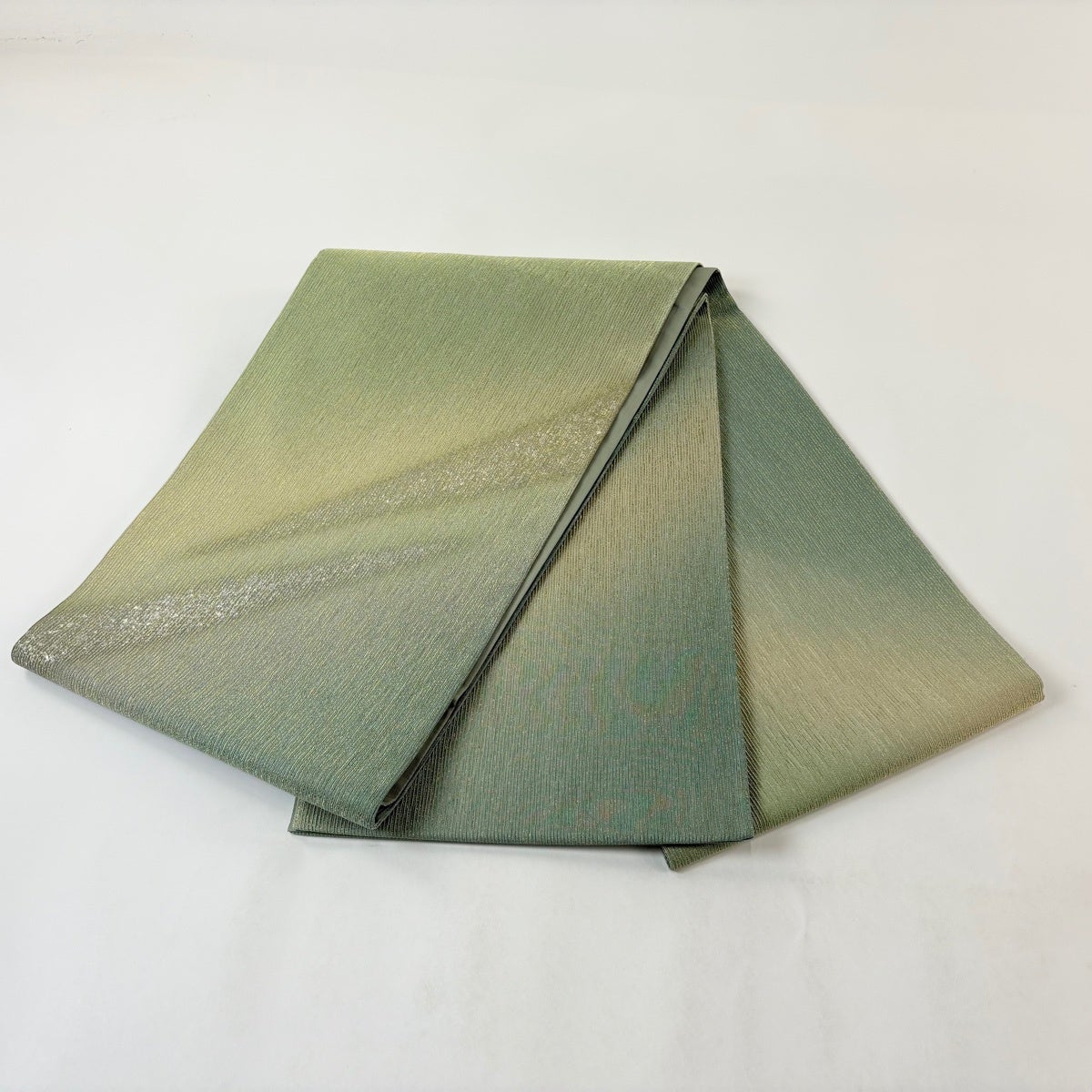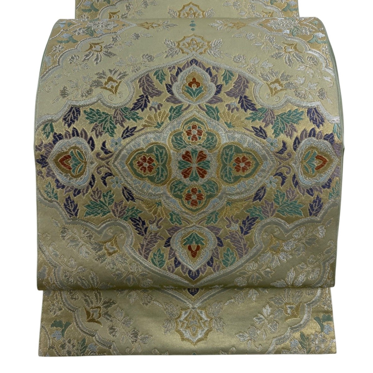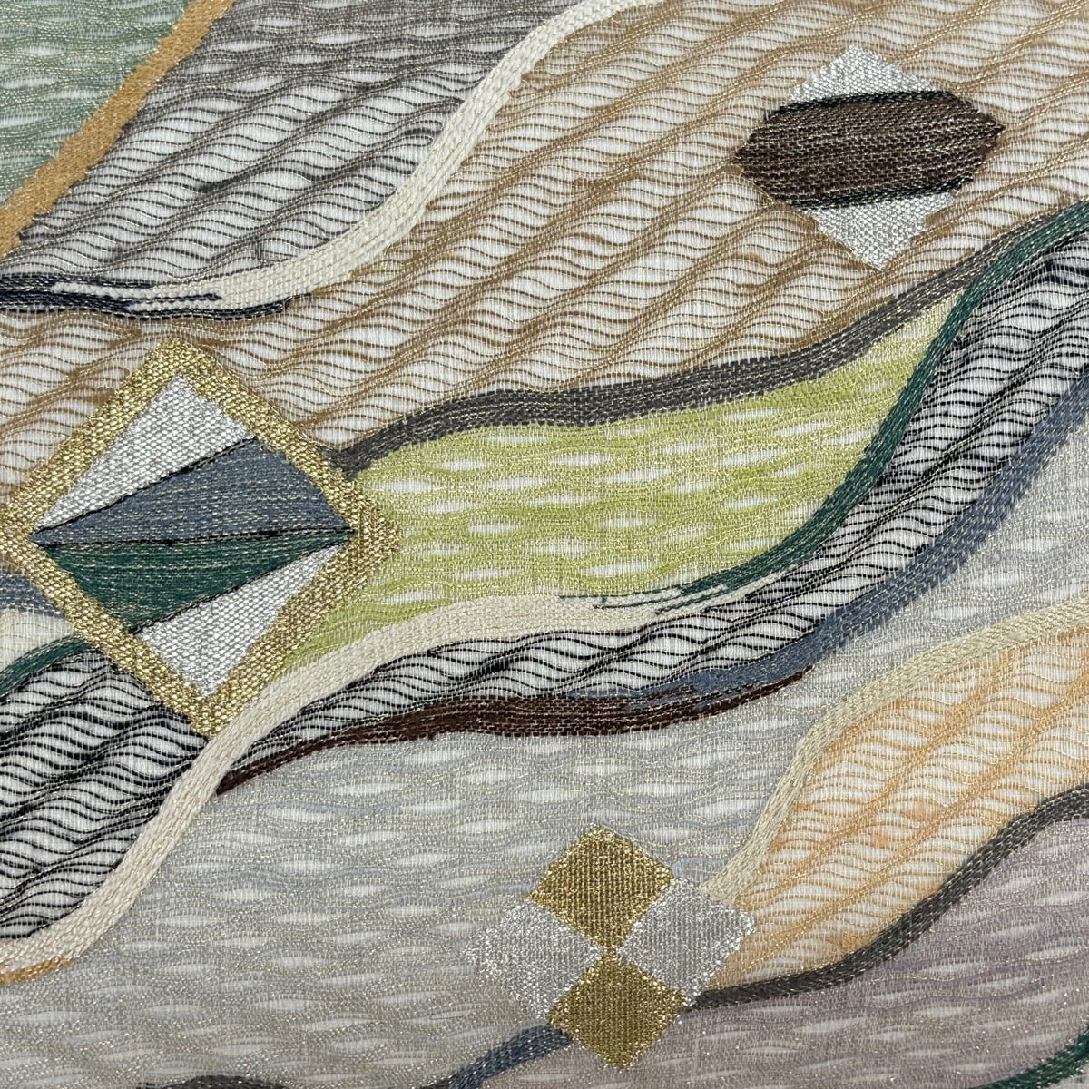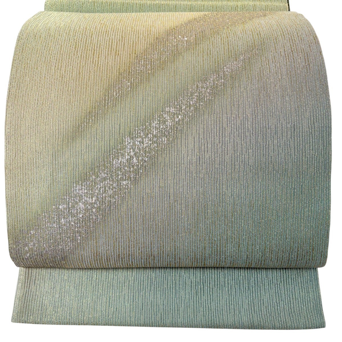 【美品】 袋帯 秀品 幾何学模様 金糸 金銀彩 薄緑 お太鼓柄 正絹