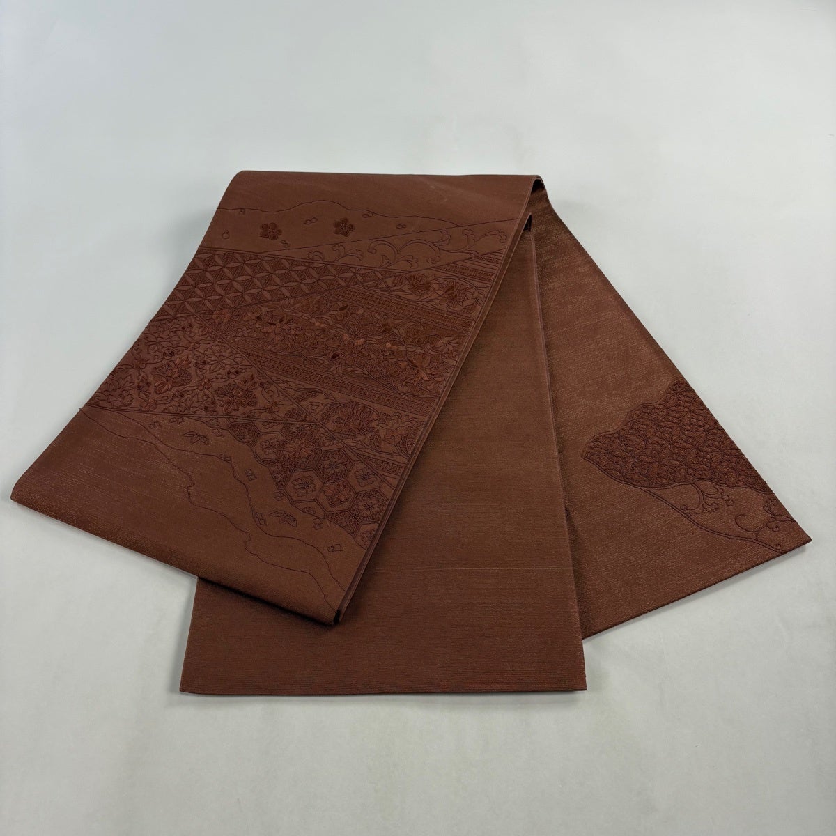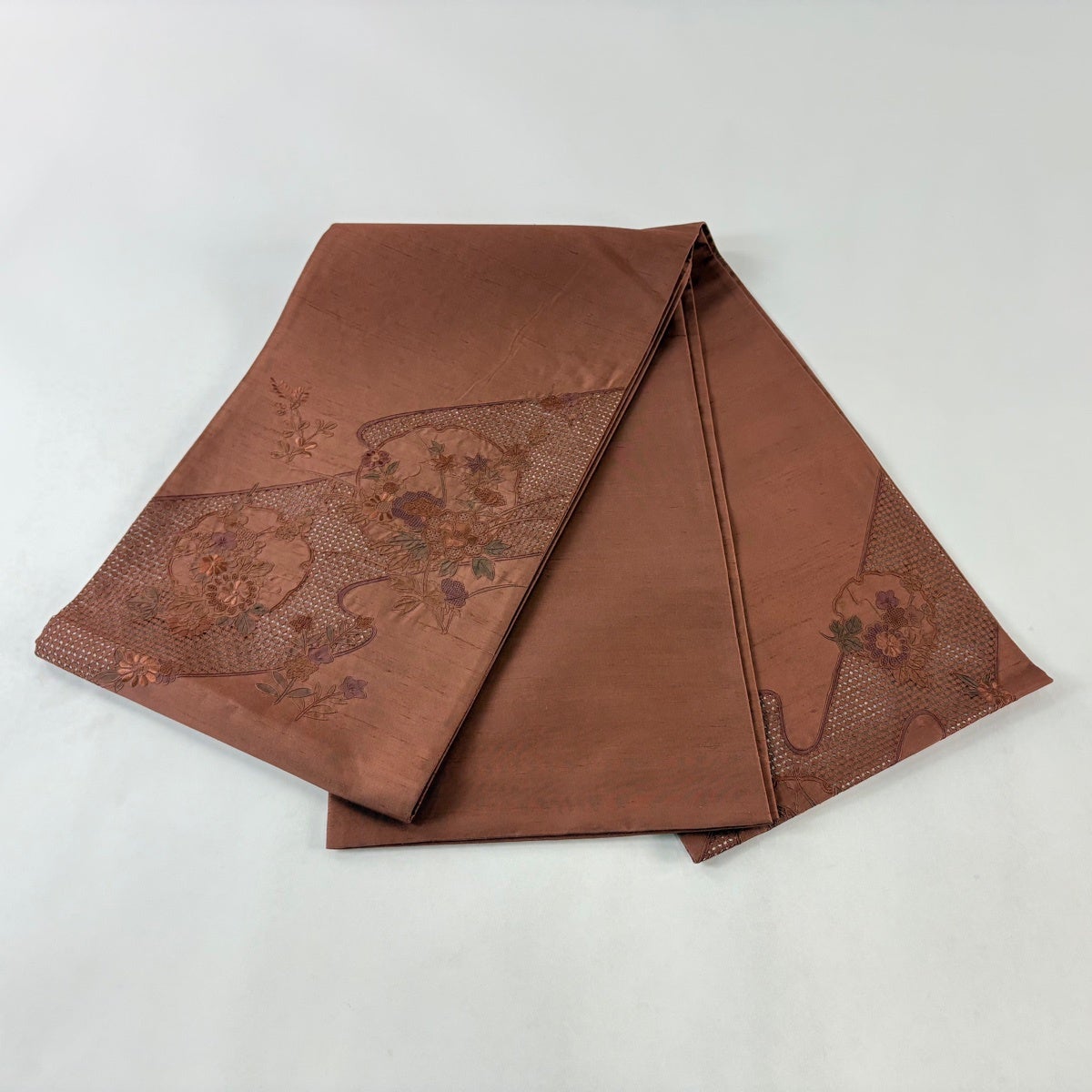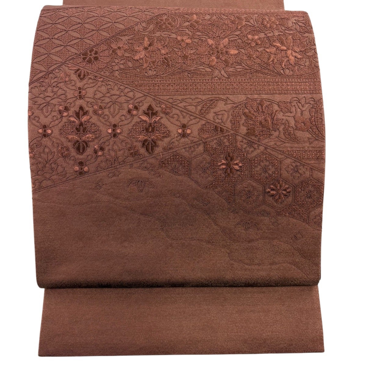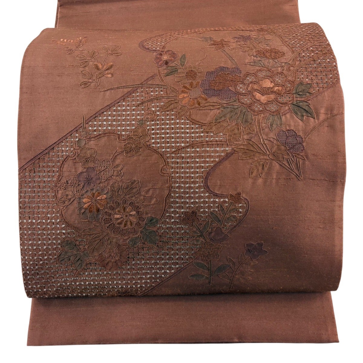 【美品】 袋帯 秀品 華文 亀甲 刺繍 銀糸 赤茶 お太鼓柄 正絹