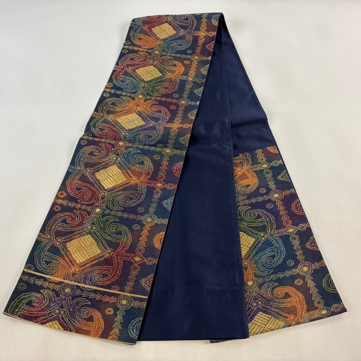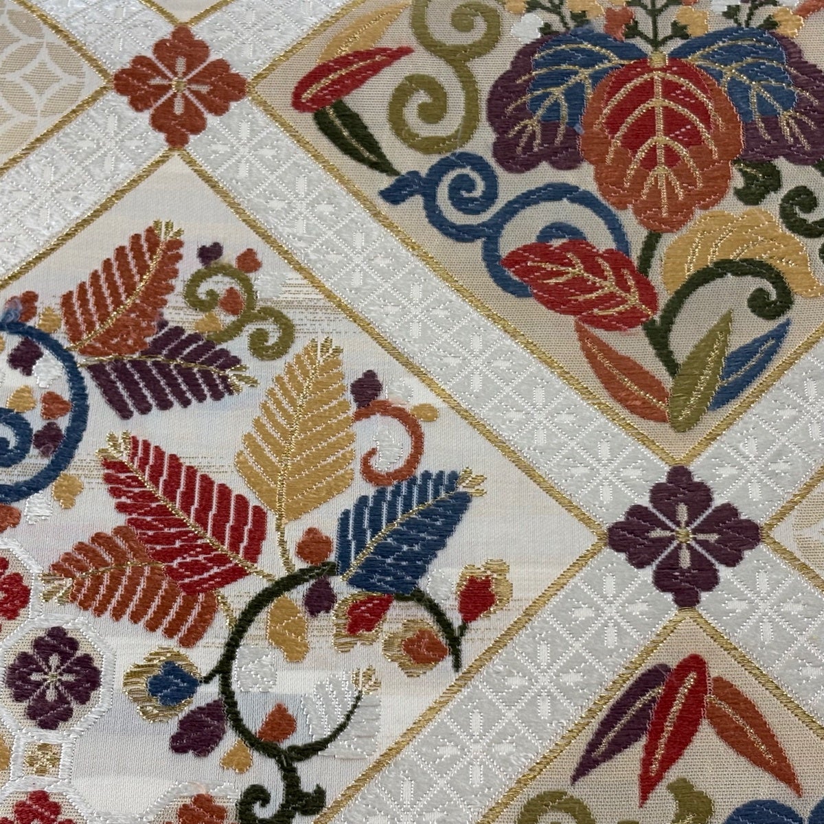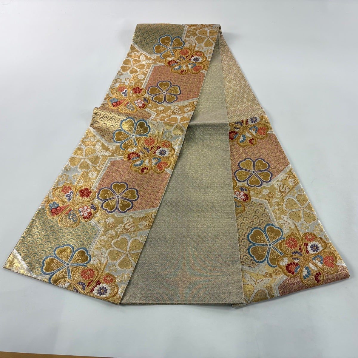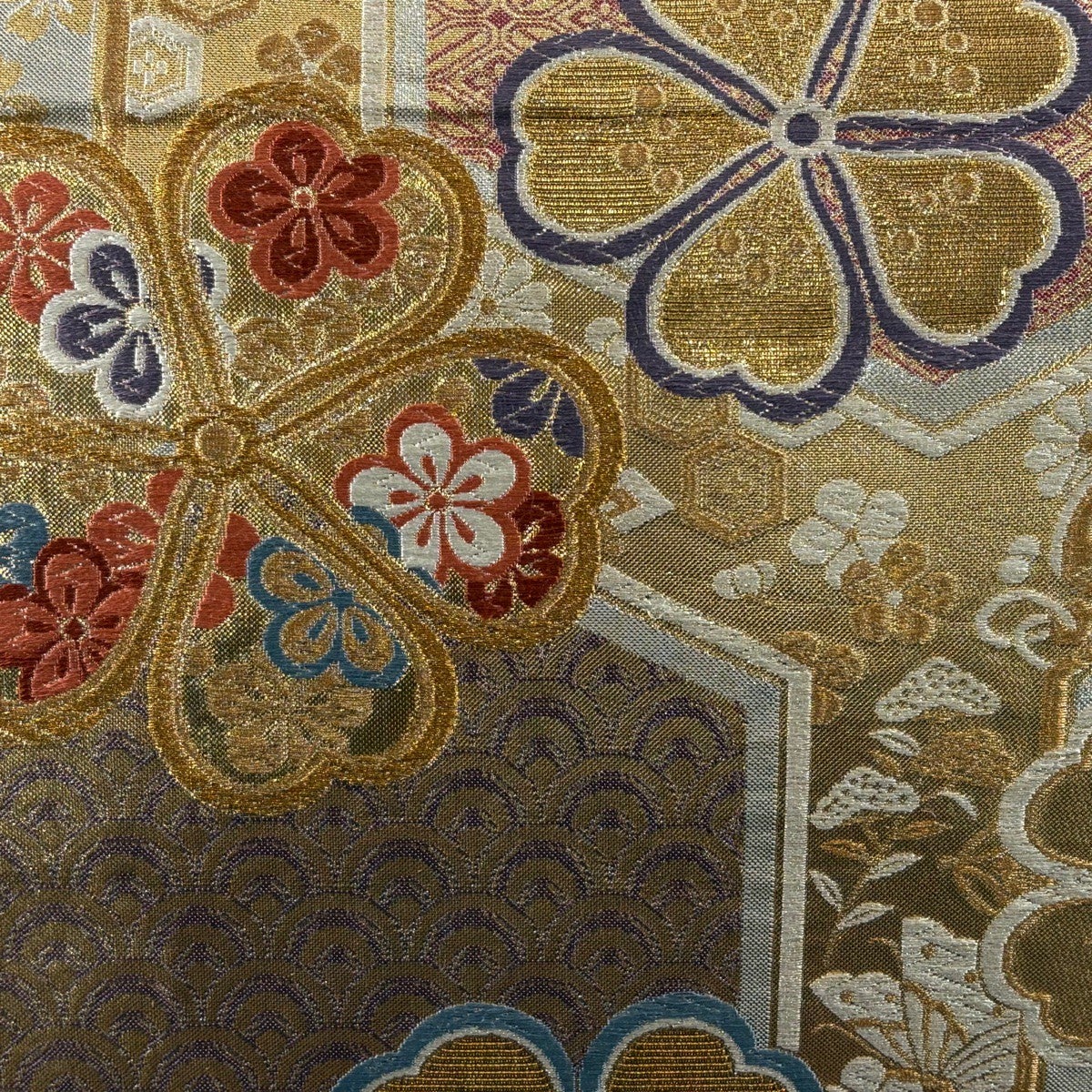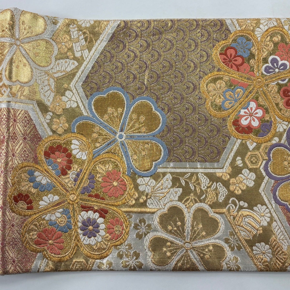 【美品】 袋帯 秀品 草花 幾何学模様 金銀糸 箔 金色 六通 正絹