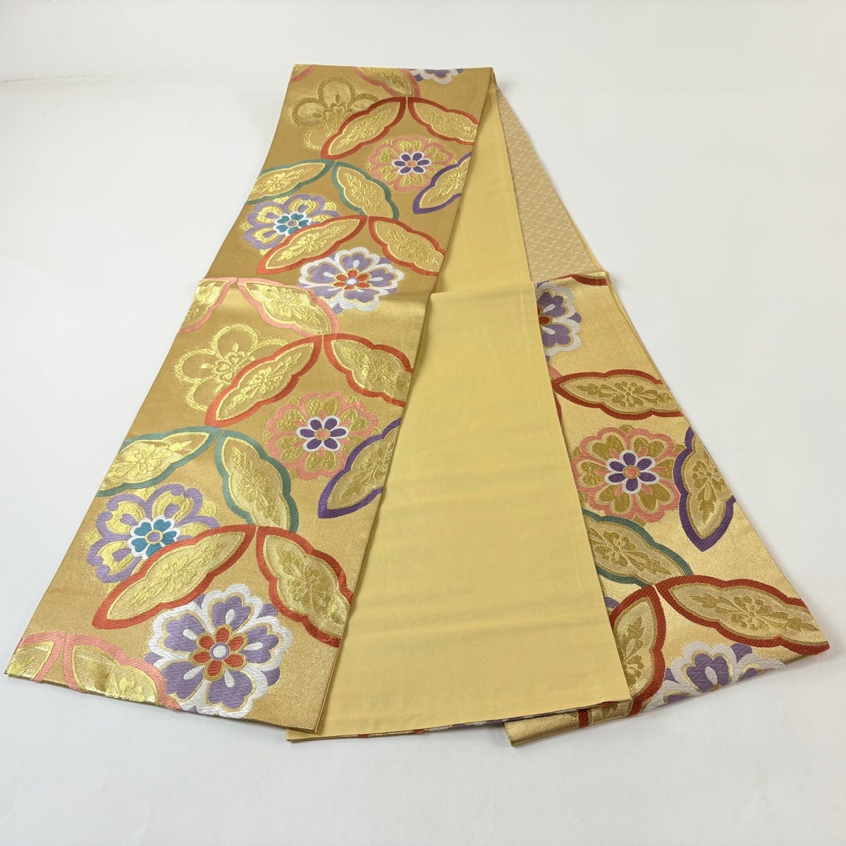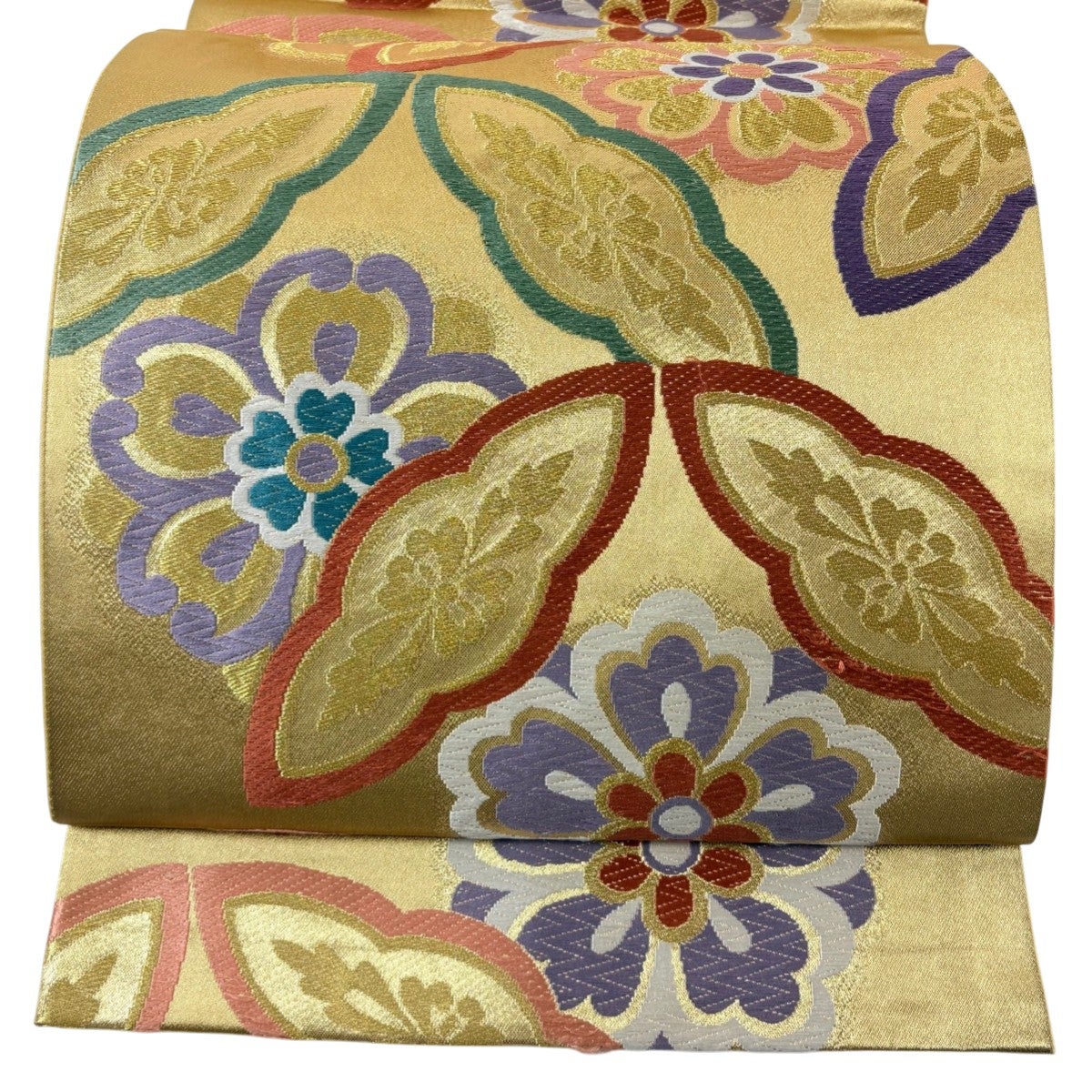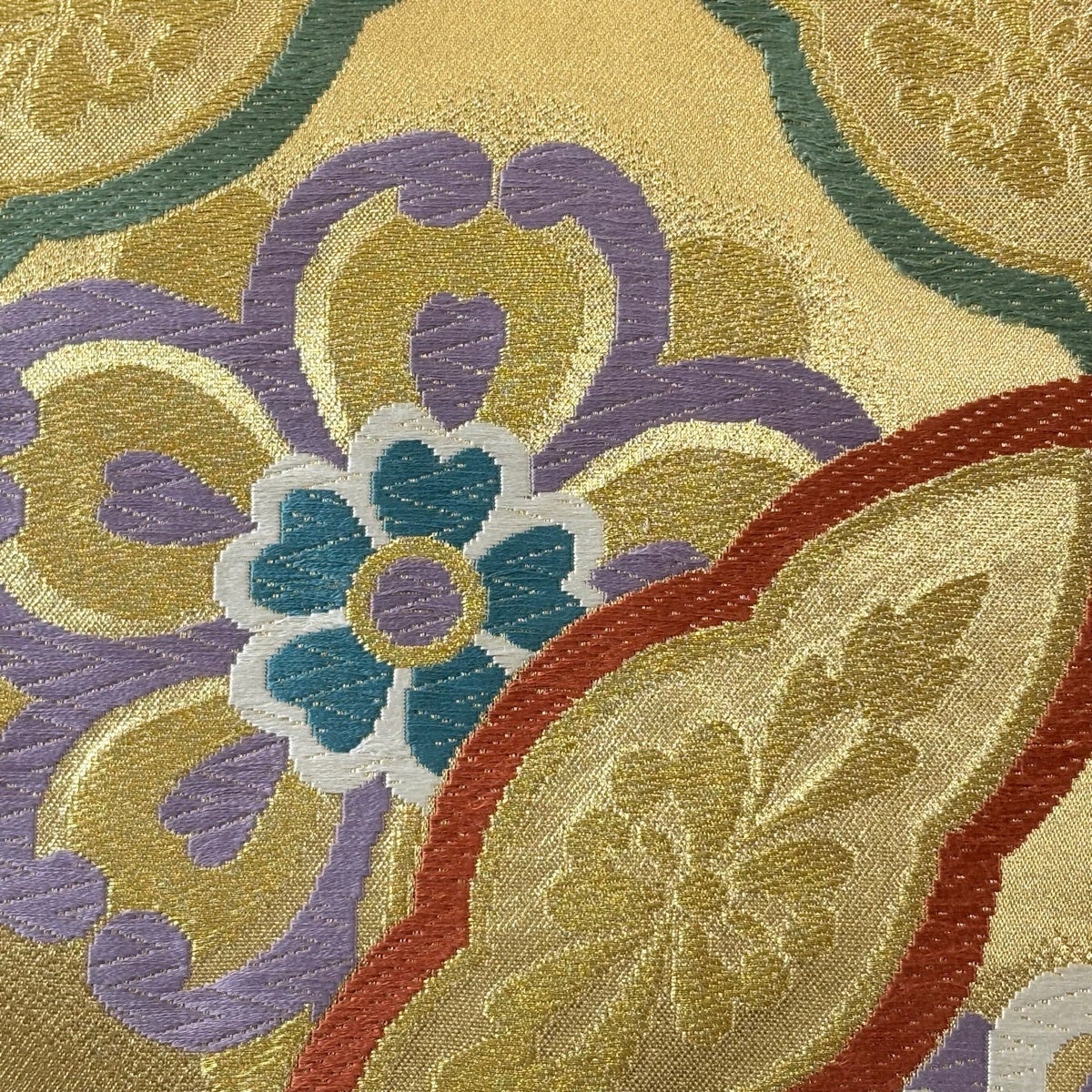 【美品】 袋帯 秀品 振袖向き 七宝 花 金糸 箔 金色 六通 正絹