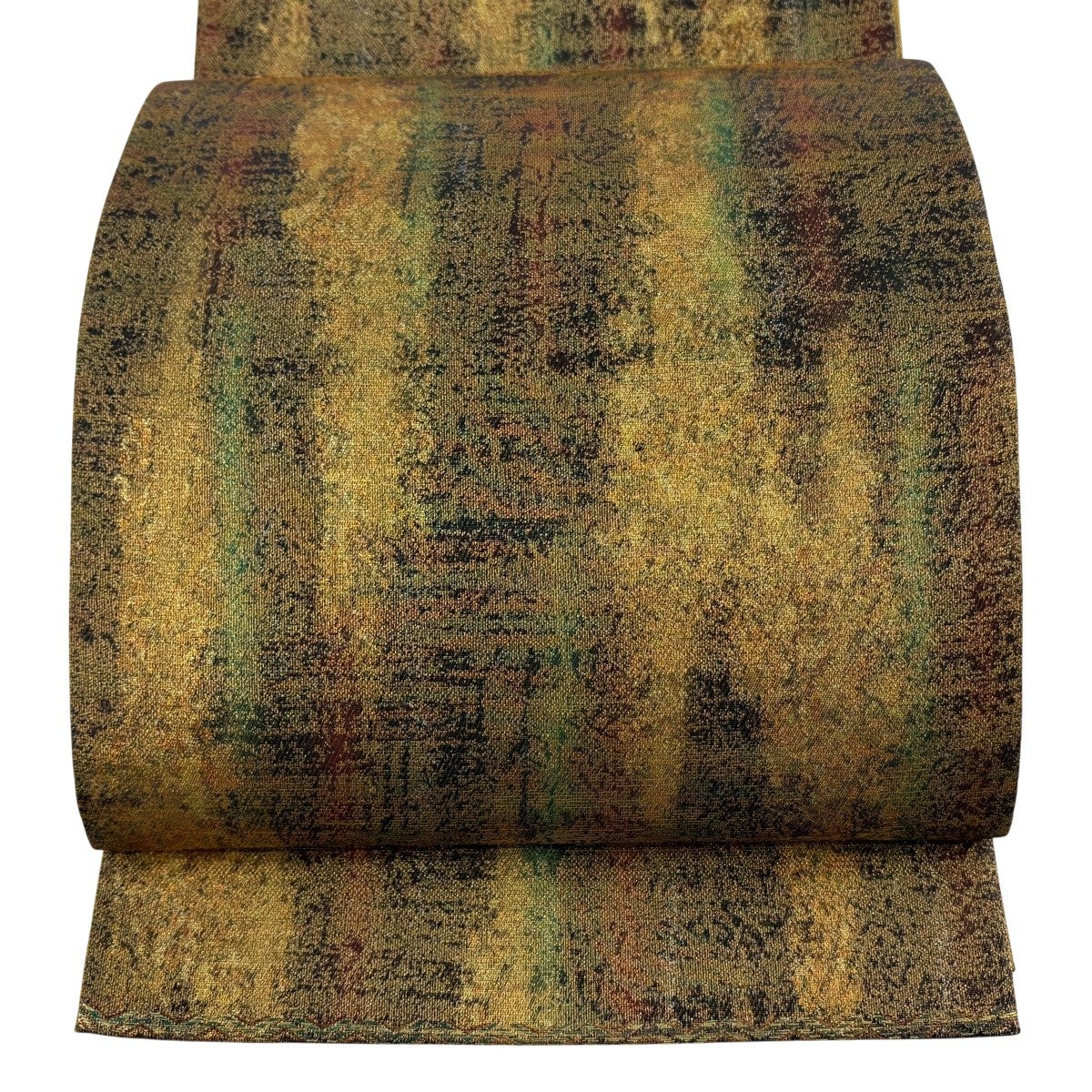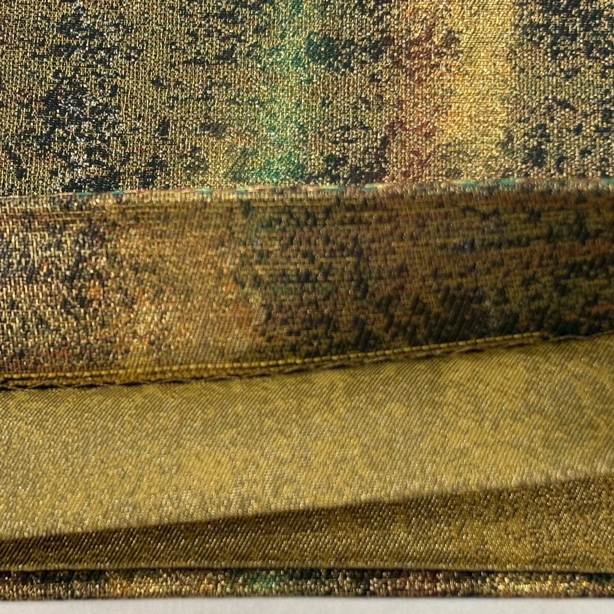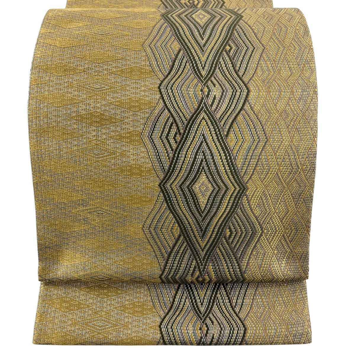 【美品】 袋帯 秀品 霞 幾何学模様 金糸 箔 茶緑色 六通 正絹